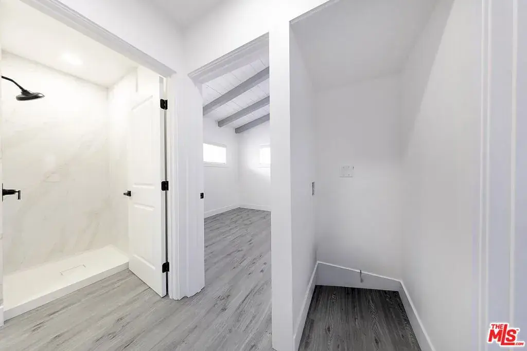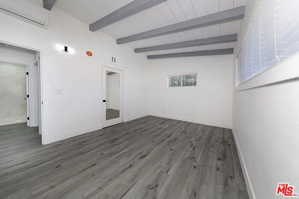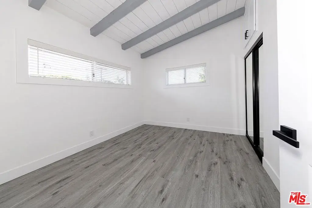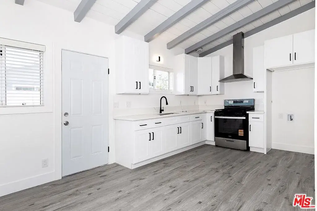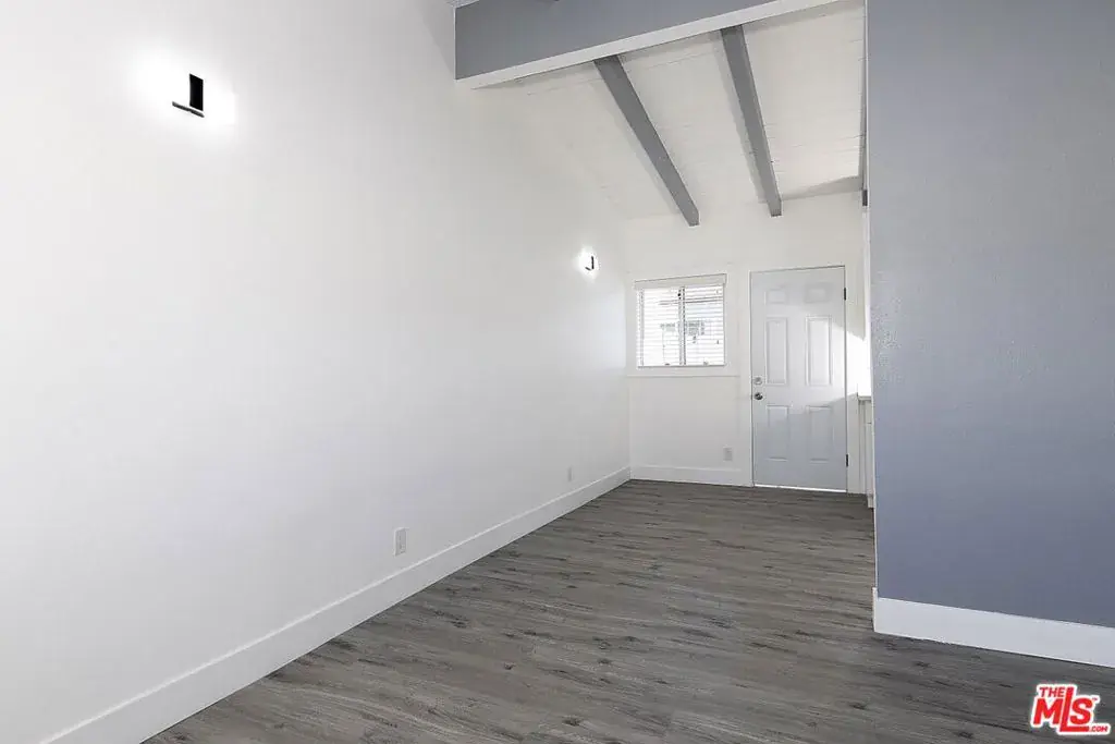 Beautifully remodeled 2-bedroom, 1-bath home offering 931 sq ft of comfortable living space. The interior features grey wood-style laminate flooring throughout, crisp white paint, and charming beamed ceilings that add warmth and character. The bright white kitchen is complemented by a stainless steel gas range and oven, creating a clean and modern feel. The remodeled bathroom showcases a tastefully tiled shower with contemporary finishes. Enjoy both front and back yard spaces, perfect for outdoor relaxation or entertaining. Washer and dryer connections are available, along with one uncovered parking space. Owner pays for water and trash. A move-in ready home combining style, comfort, and convenience.