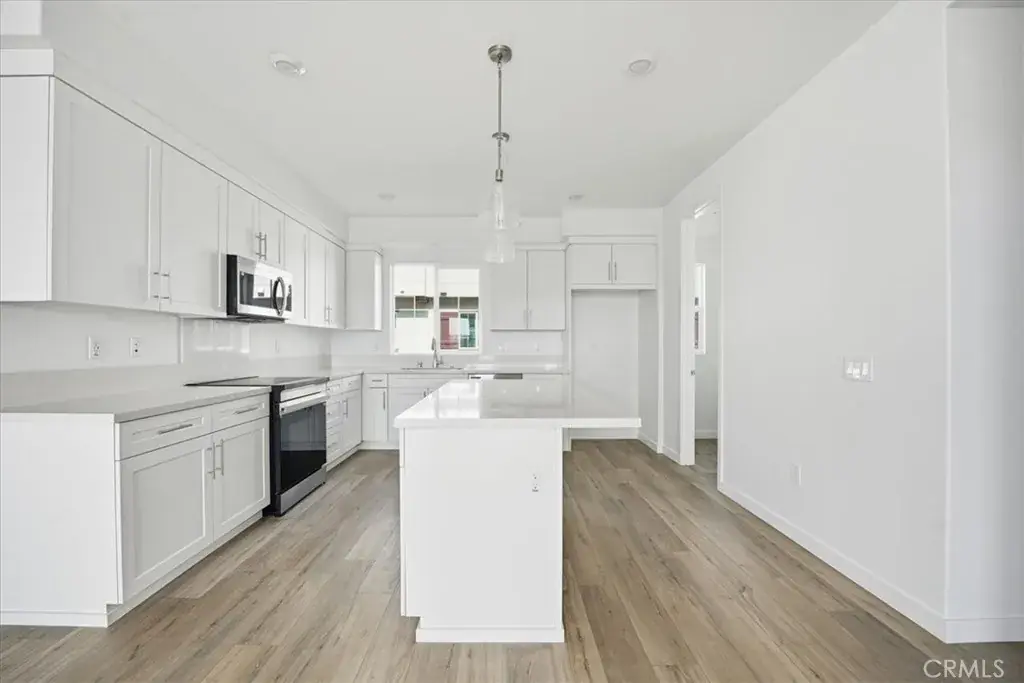 The second floor showcases an open-concept layout with a contemporary kitchen complete with a center island walk-in pantry, opening seamlessly to the great room—perfect for entertaining and family gatherings. A powder room with modern finishes adds convenience for guests.