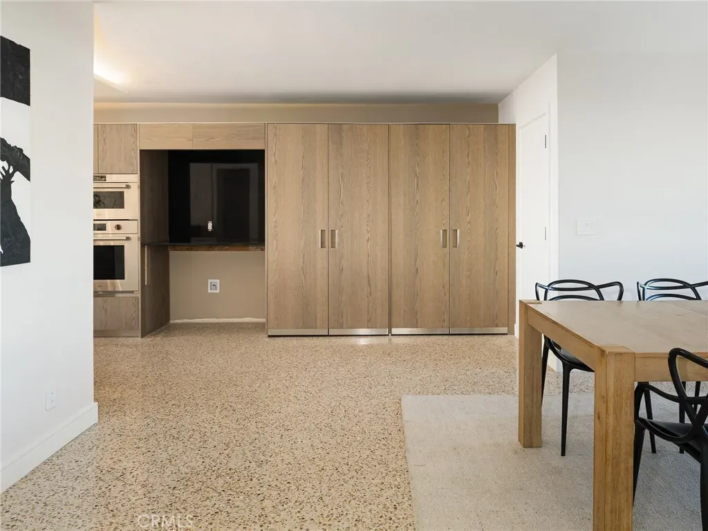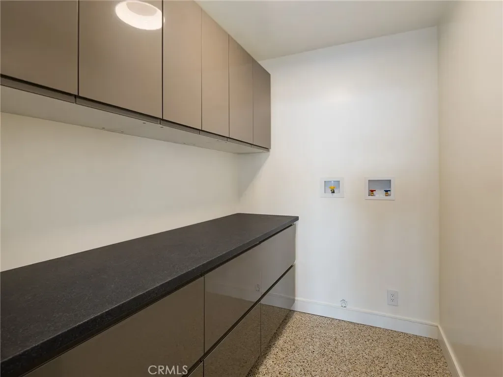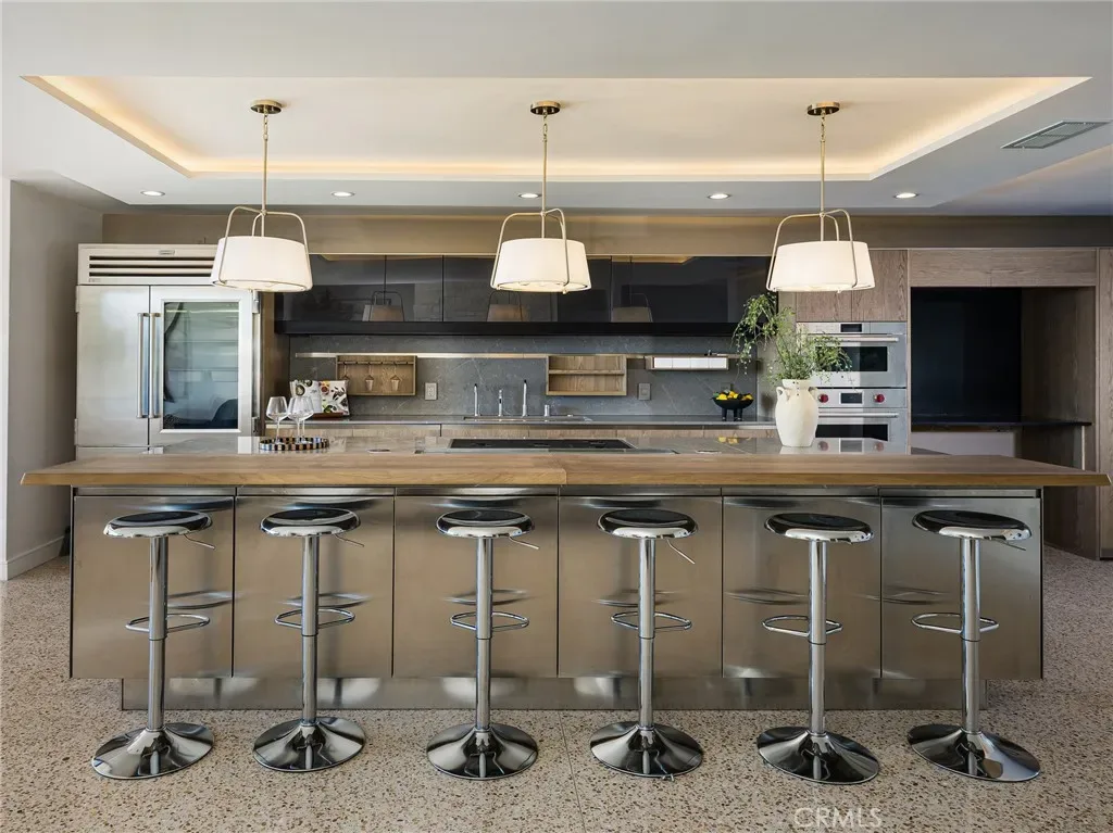 The chef’s Arclinea kitchen from EuroConcepts Beverly Hills, designed by Antonio Citterio, features automated touch-open cabinetry, an embedded downdraft hood, integrated food scale, custom silverware dividers, dual lighted pantry cabinets, appliance garage, Dornbracht fixtures, in-counter filtration, and exquisite quartz countertops. Premium Wolf appliances include a five-burner stove, traditional wall oven, and speed oven. Refrigeration includes a 48” glass-door Sub-Zero, under-counter Sub-Zero with built-in ice maker, and a Cove dishwasher integrated into oak veneer cabinetry.