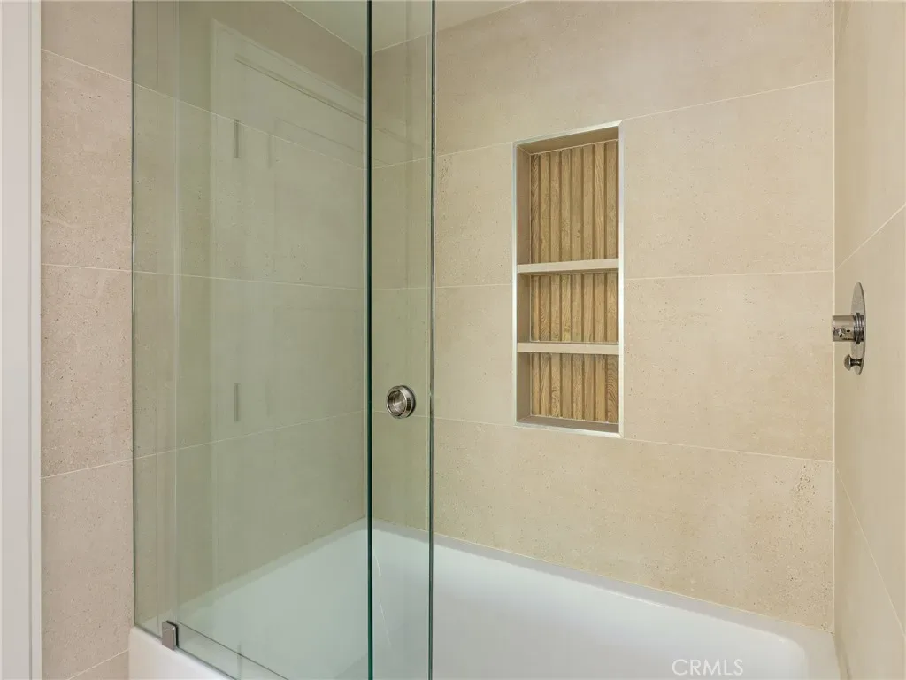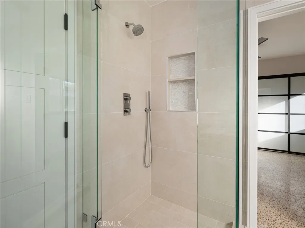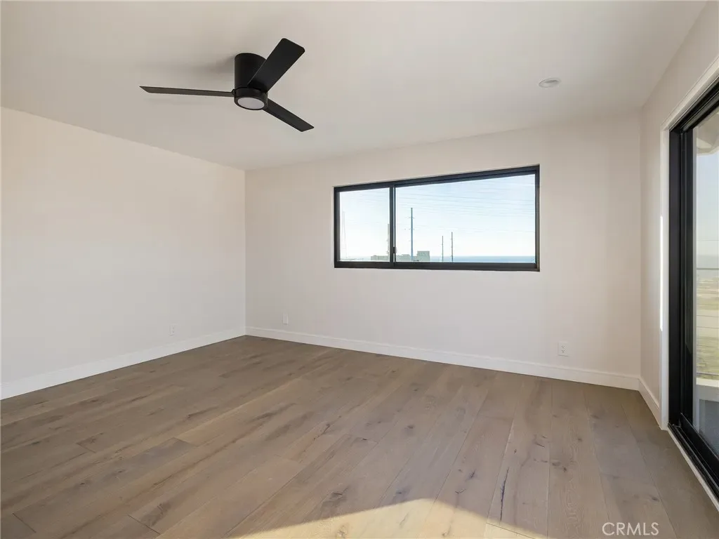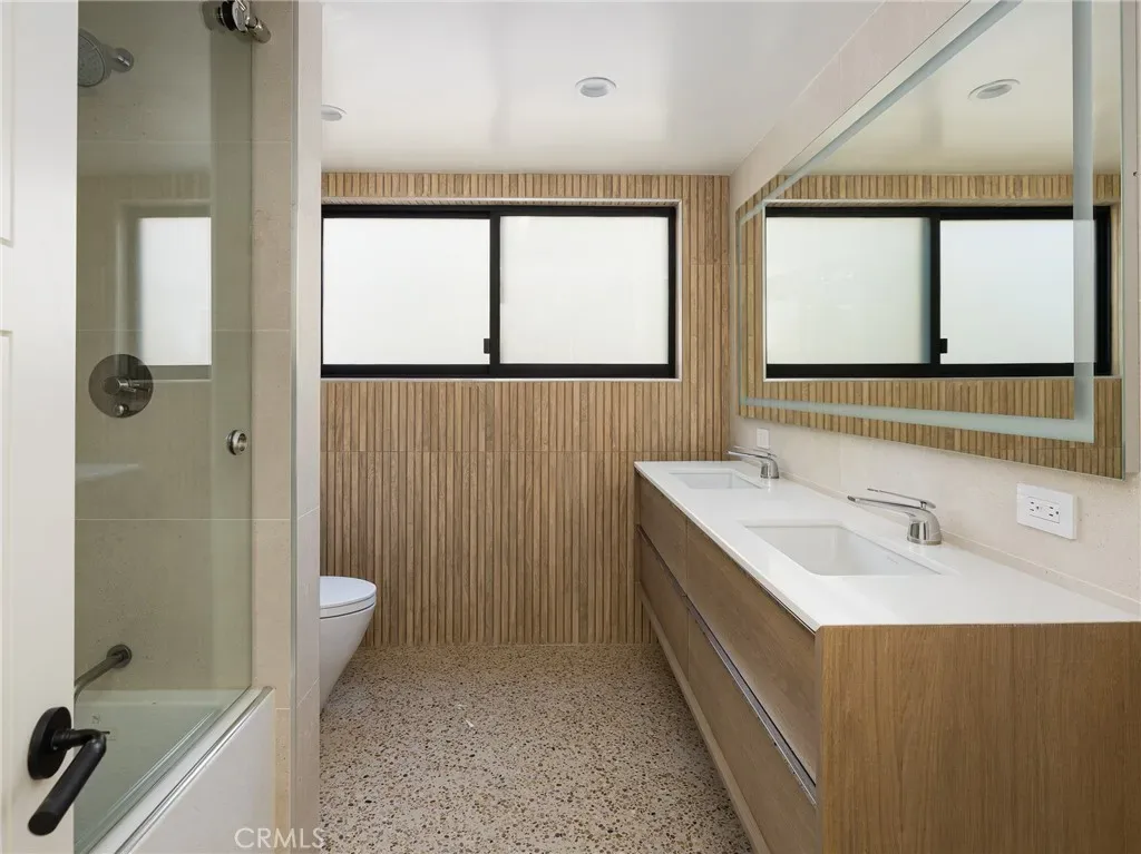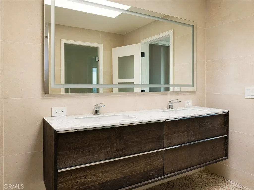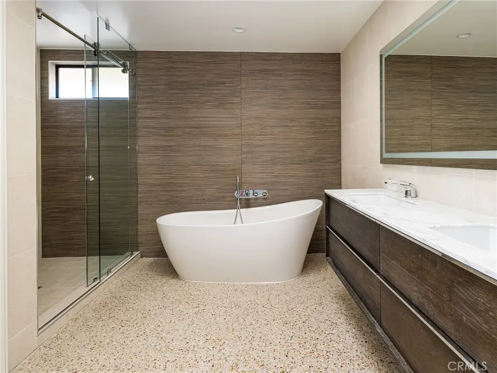 The private upper-level primary suite features an oversized deck with breathtaking ocean and coastline views. The luxurious en-suite bath showcases Porcelanosa tile and vanity, a soaking tub, glass-enclosed shower, dual vanities, Carrara marble, and a private Toto bidet toilet room, plus abundant storage. The main level includes a second upstairs bedroom with large operable windows and neighborhood views. The open-concept living area offers a wood-burning fireplace, new recessed and accent lighting, and seamless indoor–outdoor flow through a massive sliding glass door to the backyard.