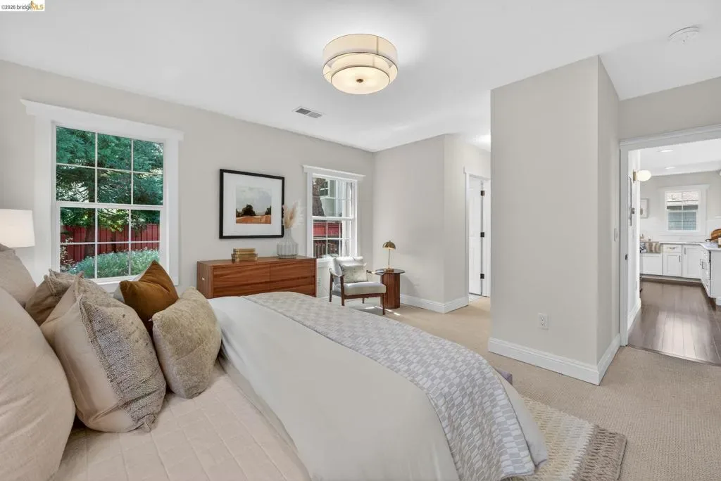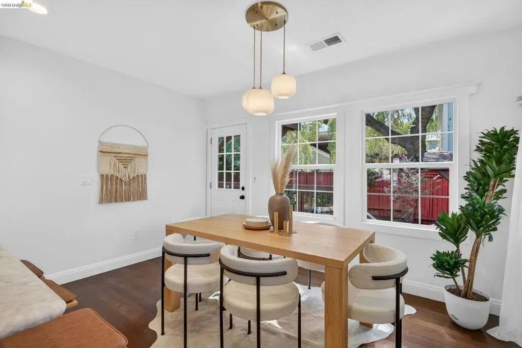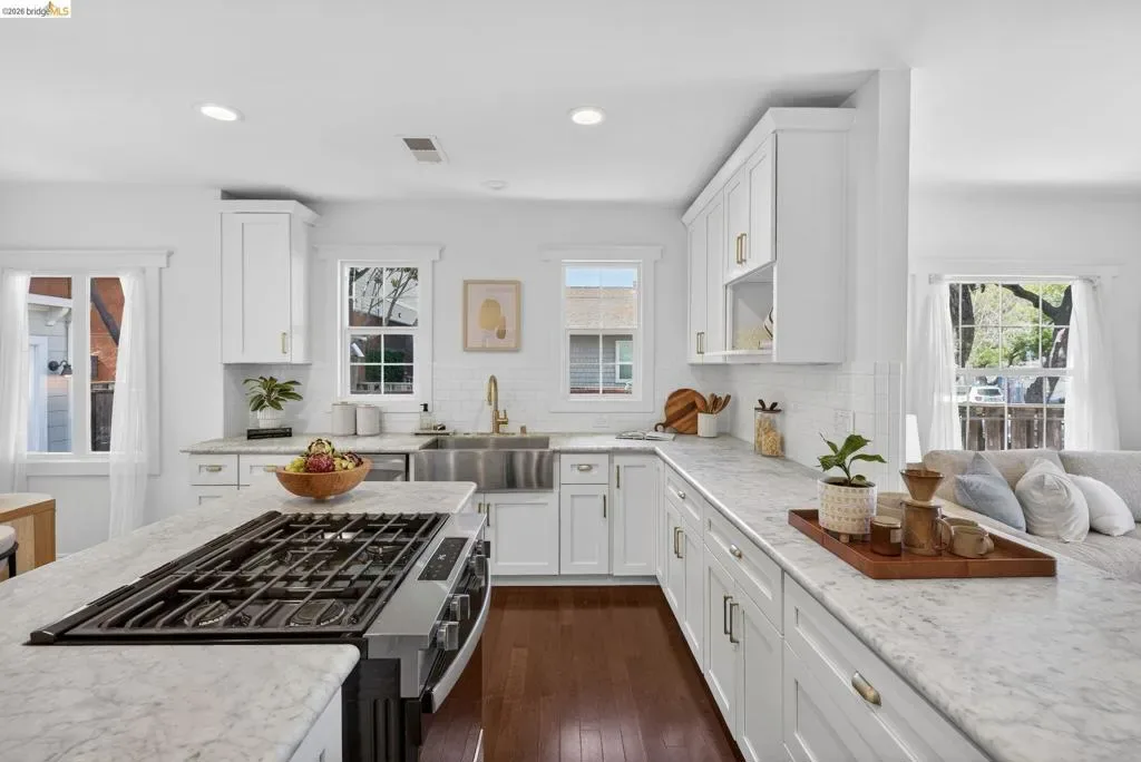 Modernly restored Craftsman on a picturesque, tree-lined street near the Emeryville–Oakland border. Tucked along a quiet single-lane block, yet just steps from favorite shops, restaurants, coffee, parks, and transit, and minutes to Bay Street and the Emeryville Public Market. A lush front garden, cheerful flower boxes, and an inviting enclosed porch welcome you home. Inside, a gracious entry opens to a light-filled, open-concept living room and kitchen. The spacious updated kitchen features a standalone island, stone countertops, built-in cabinetry, stainless steel appliances, and ample storage, with direct backyard access for seamless indoor-outdoor living. The main house offers two generous bedrooms with great closet space and two remodeled baths, including a primary ensuite. Outside, a sunny deck and native landscaping invite relaxation or gardening. And just when you think it couldn’t get better, a detached one-bedroom, one-bath studio provides flexible space for guests, a home office, or creative pursuits. An oversized driveway provides easy parking, though a 95 Walk Score encourages leaving the car behind and enjoying the best of East Bay living.