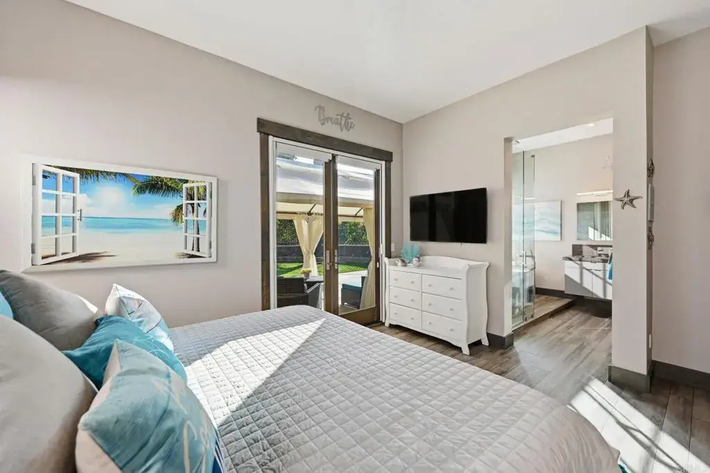 Experience the ultimate coastal California lifestyle in this stunning, fully furnished 3-bedroom, 2-bathroom home, just one mile from the beach. Designed for comfort and style, this home features a spacious primary suite plus two additional queen bedrooms (or a two-bedroom plus office option), all with ample closet space, including a walk-in closet with custom shelving. With high ceilings, ceiling fans, and five large flat screen TVs, the home is both airy and tech-savvy, complete with central air/heat, high-speed WiFi, and an EV charger. Enjoy a private garage gym, one-car garage parking, and an open-concept kitchen with modern stainless steel appliances, making it perfect for both relaxation and remote work. The private backyard oasis, overlooks the Encinitas Ranch Golf Course. Whether you’re hosting a barbecue or lounging by one of the multiple fire pits, this space is designed for enjoyment. The backyard also features a covered lounge area, outdoor dining, and plenty of space for yard games and entertainment, all with expansive golf course and sunset views. This modern retreat is the perfect coastal escape, offering a luxurious and comfortable space for families, friends, or remote workers.