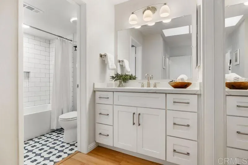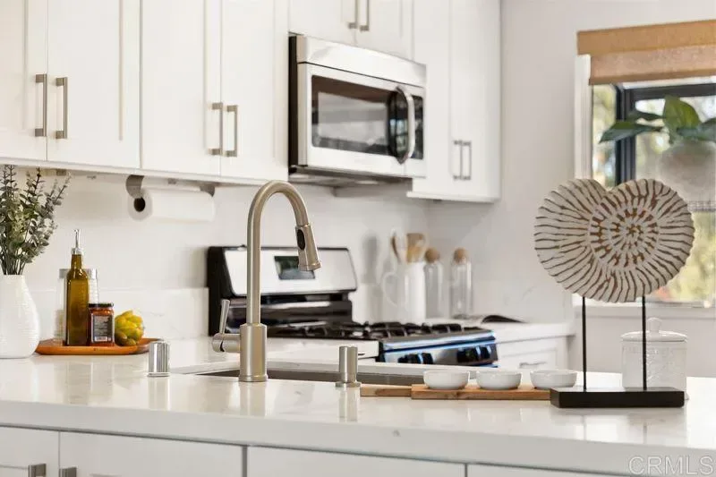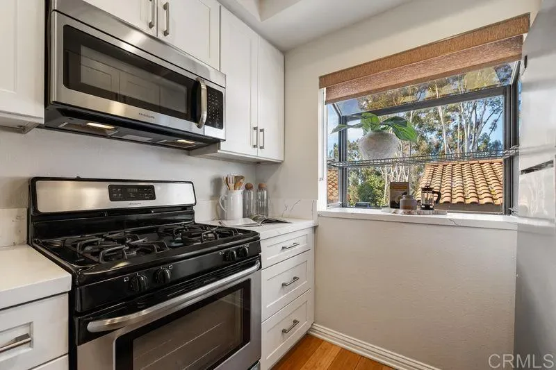 Welcome to resort style living! This remodeled and upgraded condo is perched on a hilltop looking east to Rancho Santa Fe and the mountains beyond. Located just 3.5 miles from the beach in the highly desirable Country View residential community (not age restricted) with luxurious amenities such as 2 pools with spas, an executive 9-hole golf course, pickle ball court, bocce ball court, and clubhouse that hosts regularly scheduled events. Walk-in access to Manchester Preserve hiking trails. This light and bright open floor plan features: – Vaulted ceilings and stunning panoramic views, – A fully updated functional kitchen with extra storage, quartz countertops, extra-large sink, – Meticulously crafted cabinets with soft close drawers, – Remodeled bathrooms with premium TOTO toilets & fixtures, and an extra deep soak tub, – Fresh interior paint and engineered wood flooring throughout, – Dual pane windows with upgraded window coverings, – Stackable LG washer and dryer units, – Energy-Efficient HVAC (Central Heating and Air) – A private balcony to enjoy for relaxing and entertaining, – One-car detached garage plus plenty of parking nearby. Conveniently located in Encinitas, just minutes away from grocery stores, restaurants, top rated schools, easy access to the freeway, shopping and all that the Southern California beach lifestyle affords! A must see!