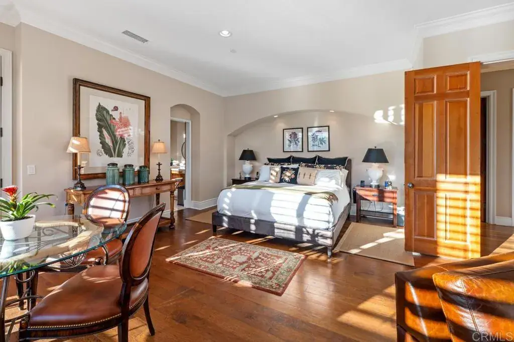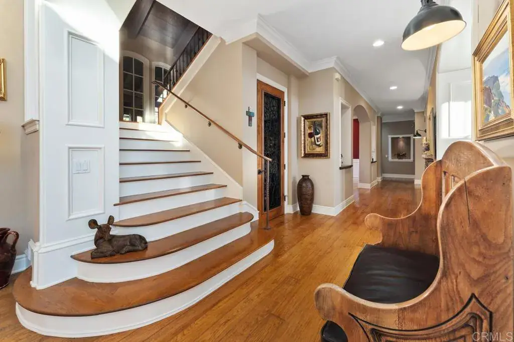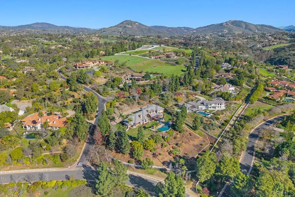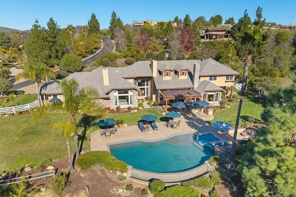 Commanding one of the premier-view lots in exclusive guard-gated Wildflower Estates, this exceptional estate captures unobstructed west-facing panoramic mountain and Olivenhain Valley views with breathtaking sunsets—among the finest in the community. Set high on a private hilltop and spanning nearly 1.9 acres, the property offers a rare combination of privacy, scale, and resort-style outdoor living. The expansive entertainer’s backyard features a sparkling vanishing edge pool and spa with waterfall, built-in BBQ, generous lawn areas, and multiple covered and open patios designed to fully embrace sunset views and seamless indoor-outdoor living. The residence offers 5 bedrooms and 5.5 baths, thoughtfully designed with a highly desirable first-floor layout that includes a luxurious primary suite and two additional en-suite bedrooms on the main level. Upstairs, two spacious bedroom suites provide ideal accommodation for family or guests. Recently updated interiors blend warmth and sophistication, highlighted by a custom-designed gourmet kitchen featuring 48” Wolf professional gas range with griddle, Wolf vent hood, 48” Sub-Zero refrigerator, Meile dishwasher, Magnifica Calcutta de Oro and Calcutta de Antica porcelain countertops, a farmhouse stainless steel-sink, and an oversized island. The kitchen is further enhanced by a custom coffee and beverage bar, imported Italian tile and flows effortlessly into the butler’s pantry, family room and outdoor entertainment spaces. Living, family, and formal dining rooms are all located on the main level, creating an exceptional layout for both everyday living and large gatherings. Architectural details throughout the home include exposed beam ceilings with heavy timbers, rich knotty pine wood finishes, multiple fireplaces—including indoor and outdoor—custom built-ins and a fire pit. Additional highlights include a private home gym with top-of-the-line equipment, wine storage, and an oversized four-car garage with extensive custom-built-in cabinetry, work bench and tool slat wall. The estate has been meticulously maintained with recently replaced HVAC and irrigations systems and water heaters for both the home and pool/spa. The grounds are professionally landscaped with lush mature gardens, palm trees, fruit orchards, planter beds, and expansive grass flat areas suitable for sports, recreation, gardens, or additional outdoor amenities. Wildflower Estates is a prestigious guard-gated enclave offering a private community park, scenic walking paths, and direct access to expansive equestrian and hiking trails—an unmatched natural setting unique to Olivenhain. Located just minutes from top-rated schools, beaches, shopping, dining, and coastal amenities, this extraordinary estate represents a rare opportunity to own one of the finest view properties in Wildflower Estates, where privacy, luxury, and natural beauty converge.