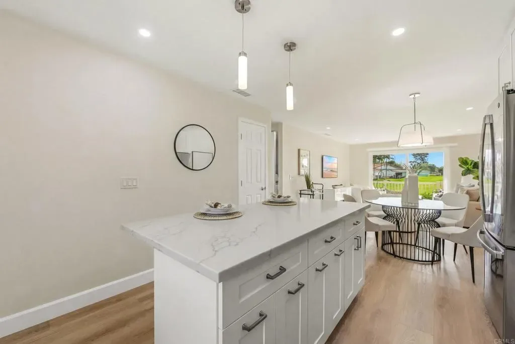 *** MARCH 2026 COMPLETED! BRAND NEW DESIGNER REMODEL NEVER LIVED IN! 2 BR. With 2 Primary BRS. Or one as an office. 100’s of thousands spent $$$ inside and out high quality improvements, designer customized and completely REDESIGNED . Be the first to enjoy the Panoramic lush green GOLF AND MOUNTAIN VIEWS! LOCATION LOCATION on the 1ST. HOLE of the desirable 55+ Community with a beautiful executive golf course, Pickle Ball, Heated Pool and Spa, Bocce Ball, Billiards, Clubhouse, Social events, Oscar movie nights, yoga, exercise classes, book club, travel club, Aquasize, many social amenities. This fresh new modern OPEN CONCEPT SINGLE STORY PATIO home with 2 newly designed landscaped & hardscaped large entertainment patios enjoy Indoor Outdoor living Entertainment. Also has a single car epoxy & drywall finished garage, and overflow parking. Convenient indoor laundry room washer dryer. A/C, new HVAC, Vinyl floors throughout. Quartzite kitchen, with large new island/ counter bar seating of quartzite, stainless appliances, custom cabinetry, and sink. Custom bath with newly designed tiled shower, and floor. Paint throughout new smooth coat paint, custom lighting inside & out. New Windows, custom designed window coverings, all new doors including the 2 sliding doors added to enhance views!! Model perfection! Best location In community, serene and peaceful location, lush green surrounds you! Clubhouse close! Near all shopping, restaurants, beaches, downtown Encinitas and borders on Rancho Santa Fe! Have it all! Live the lifestyle! NO EXPENSE SPARED! $$$$$$