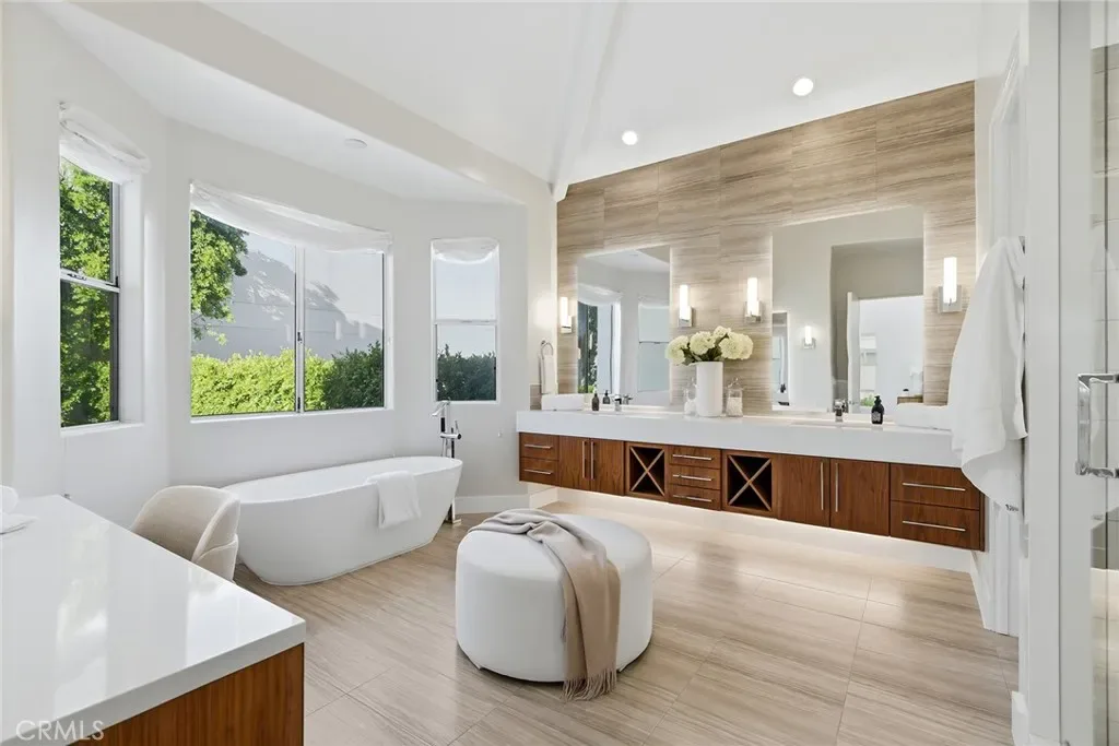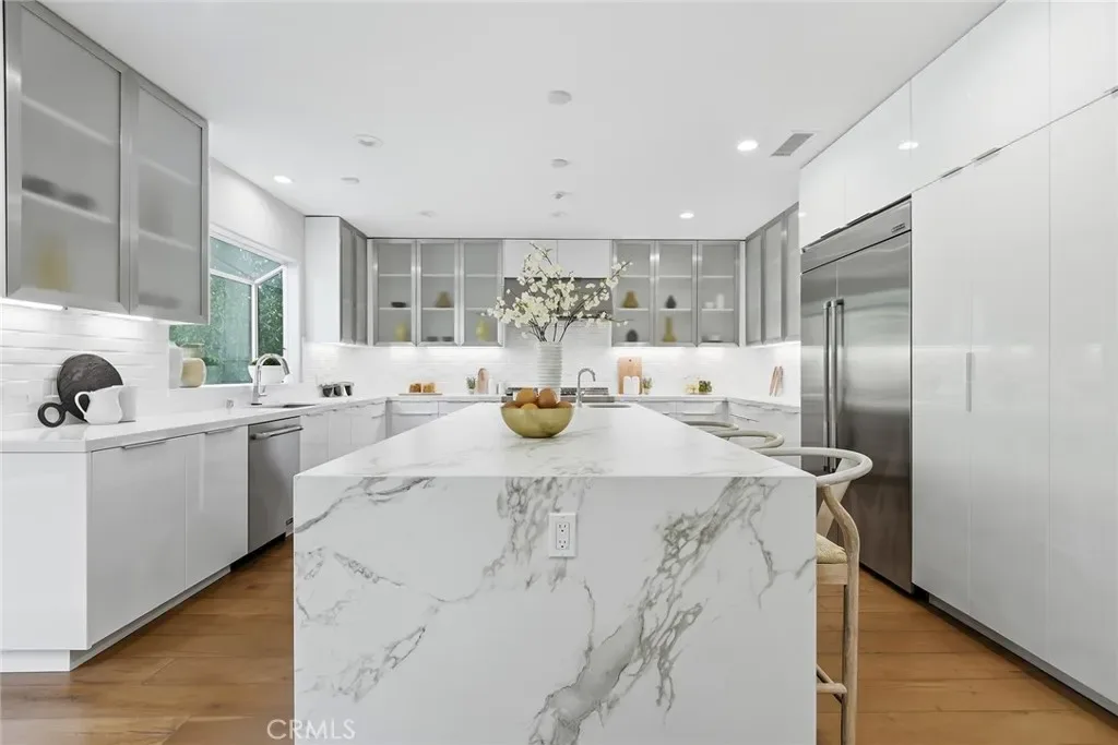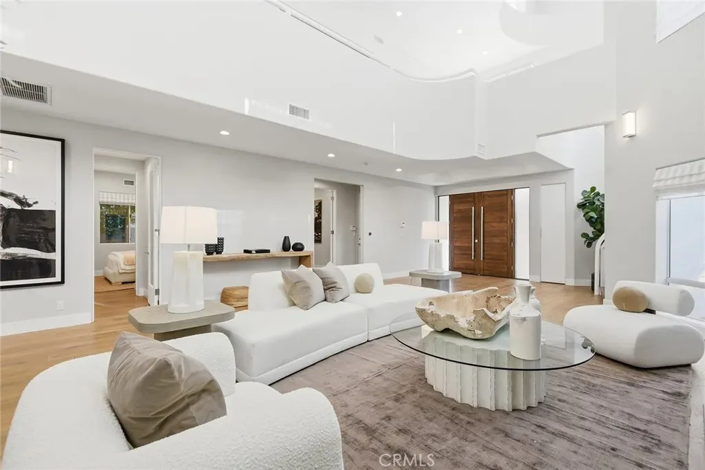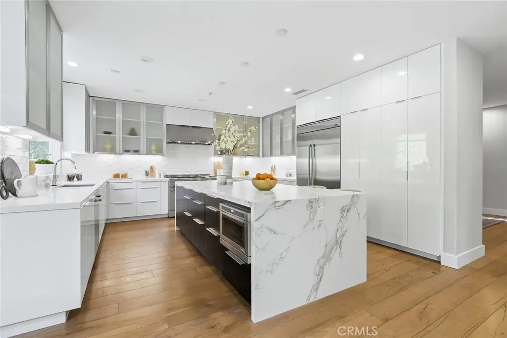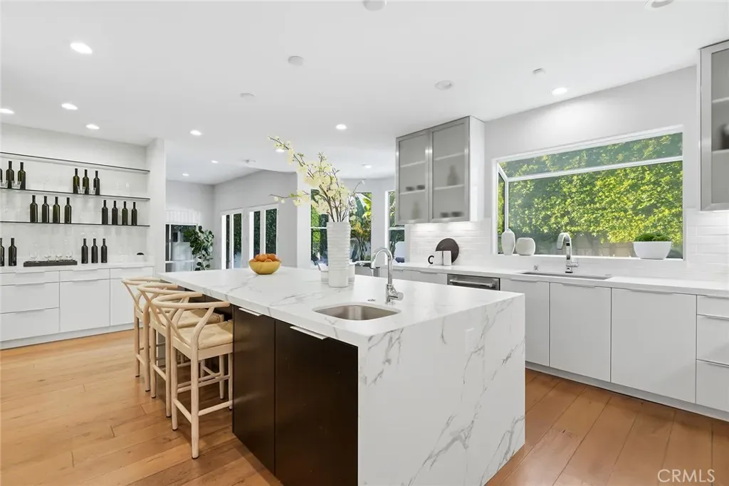 Striking, one-of-a-kind, fully remodeled residence located south of Ventura Blvd in Encino, offering exceptional scale, privacy, and refined design. Featuring 5 bedrooms plus an office (potential 6th) and 5.5 baths across approximately 5,224 square feet. A double door entry opens to a dramatic formal living room with soaring ceilings and beautiful wood floors that carry throughout. A thoughtfully designed floor plan offers distinct living and entertaining spaces, including a generous formal dining room, formal living room, and expansive family room. The chef’s kitchen is both functional and inviting, anchored by an oversized center island with eat-at bar, sink and dishwasher, designer countertops, a breakfast nook, built-in professional refrigerator, and high-end stainless steel appliances. Thoughtfully designed for both everyday living and elevated entertaining, the home offers multiple gathering spaces with effortless flow to the outdoors. Fireplaces in the living room, family room, and primary suite add warmth and character throughout. The private backyard is a true retreat, complete with a pool, built-in BBQ, and dedicated cooking area—ideal for hosting or unwinding. Upstairs, an elegant staircase leads to four spacious en-suite bedrooms, each with walk-in closets. Three balconies invite in natural light and enhance the indoor-outdoor connection. The expansive primary suite is a true retreat, featuring a fireplace and a spa-inspired bath with dual walk-in closets, a vanity area, separate shower, soaking tub, and private water closets with bidet. Additional features include an attached 2-car garage and a well-executed floor plan designed for both everyday living and elevated entertaining. Ideally located south of Ventura Blvd with close proximity to the Westside—approximately 15 minutes to UCLA, 20 minutes to West LA, and 25 minutes to Santa Monica and the coast. Just moments from Ventura Blvd’s top dining and shopping, this home offers a rare combination of space, privacy, and location in one of Encino’s most sought-after neighborhoods.