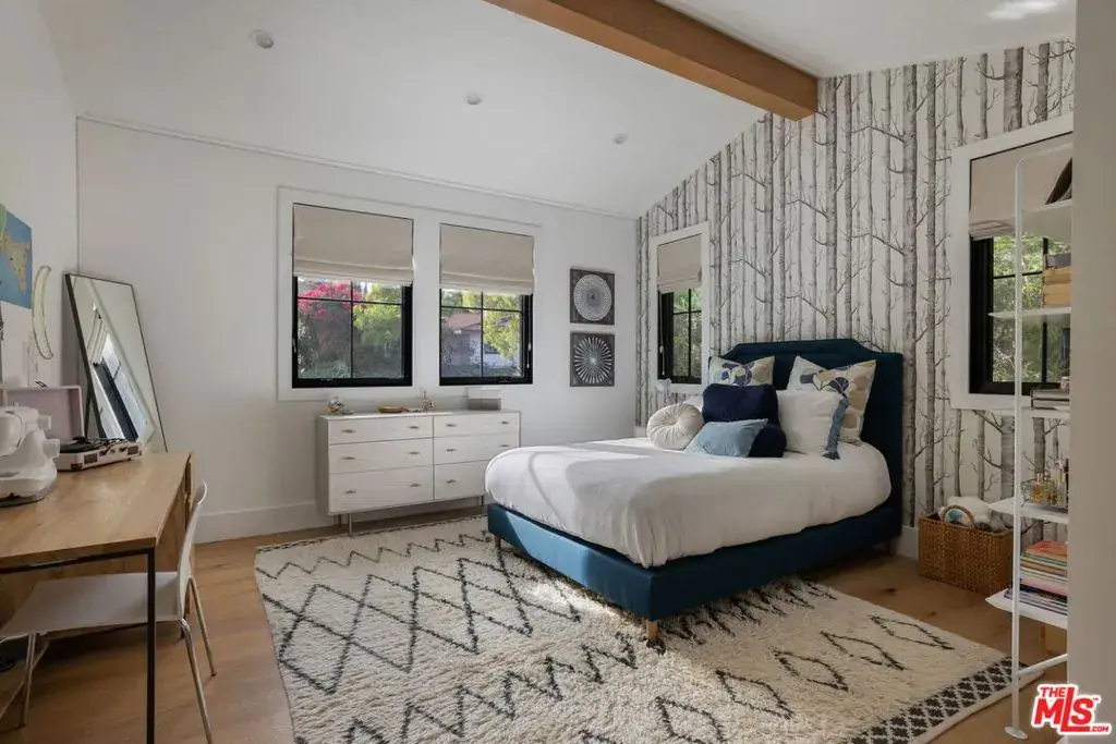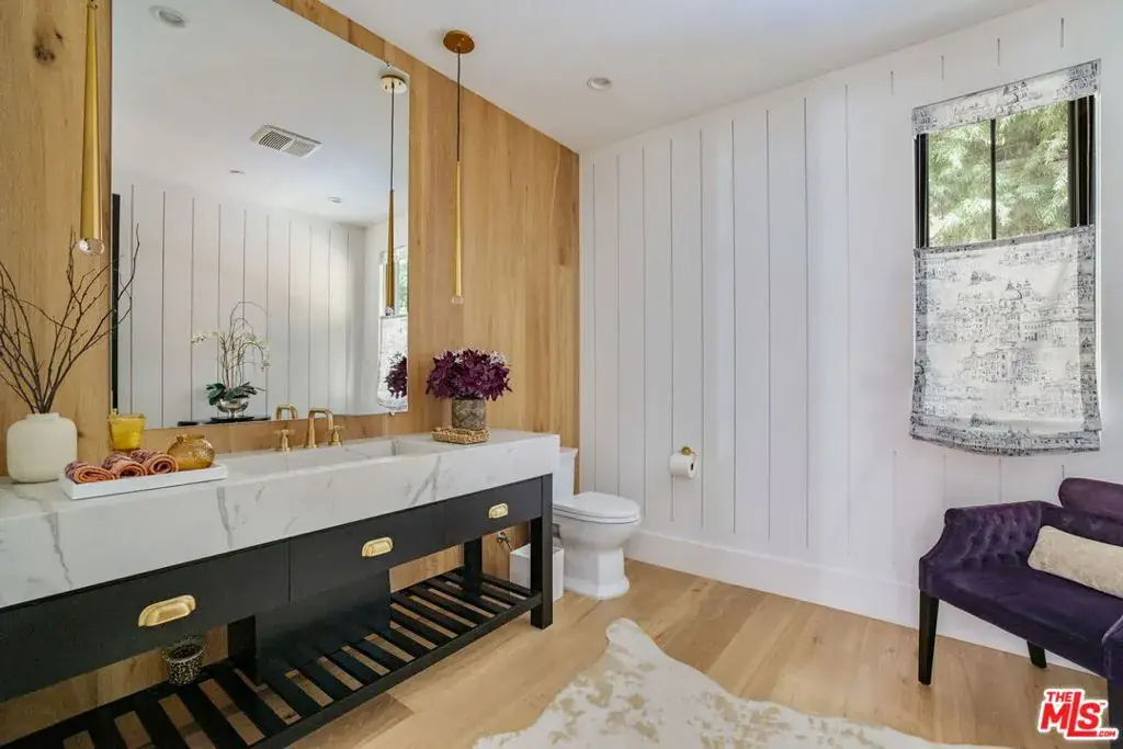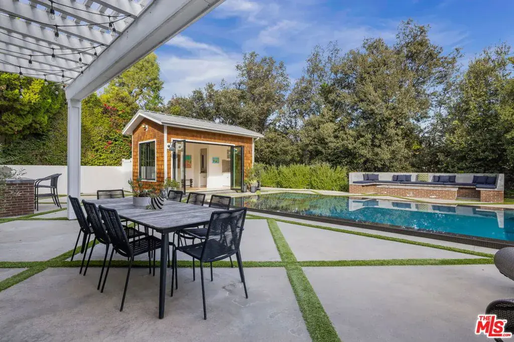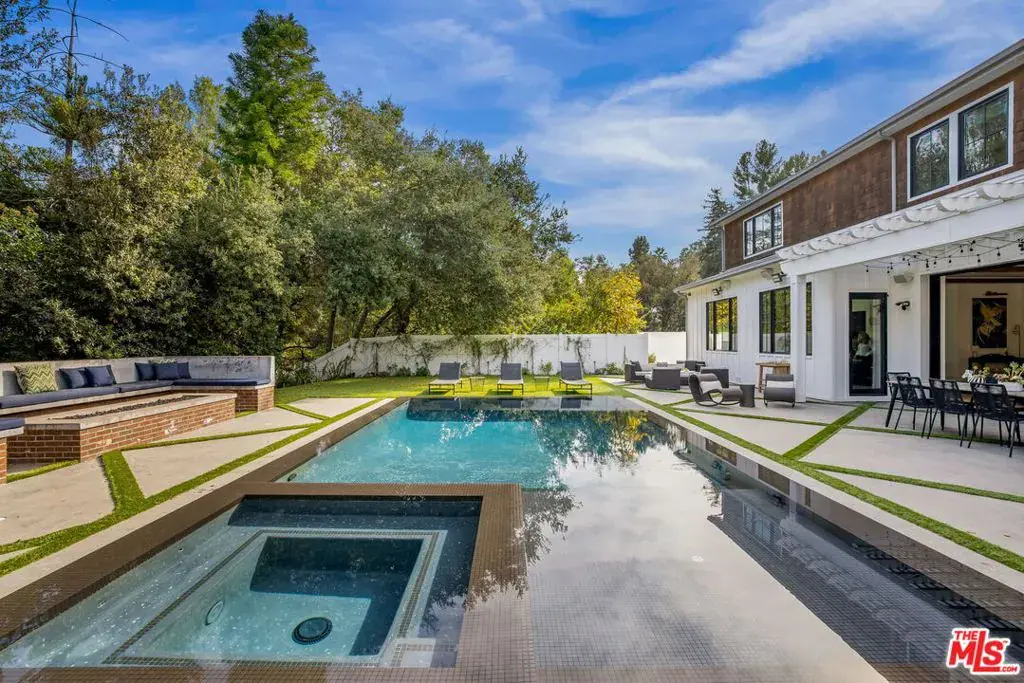 Set at the end of a quiet cul-de-sac on a coveted corner lot in Royal Oaks, this expansive newer-construction residence offers a rare combination of scale, privacy, and thoughtful design in one of Encino’s most sought-after neighborhoods. From the moment you enter, the home feels open, elevated, and effortlessly livable. Soaring cathedral-height ceilings with exposed beams, oversized proportions, and abundant natural light define the main living spaces. Designed for both entertaining and everyday living, the two-level floor plan flows seamlessly from formal living and dining rooms into a generous great room with fireplace and sliding pocket glass doors that open to the backyard. The show-stopping chef’s kitchen anchors the home with two substantial islands, a walk-in pantry, premium appliances, cozy eating area and ample space to gather with ease. Every living space feels intentionally oversized, including a dedicated home theater, library or study, private office, and a striking walk-in wine cellar. All five bedrooms are en suite, with three spacious secondary suites upstairseach offering walk-in closets and access to upper-level balconies. The primary suite is a true retreat, complete with a sitting room or office, a dramatic two-sided fireplace, and a spa-inspired bath finished in Carrera marble. Outdoors, the property transforms into a private, resort-style setting featuring an oversized turf lawn, expansive patio, fire pit, built-in BBQ, pool house, and a heated infinity-edge pool and spa ideal for year-round enjoyment. Additional highlights include dual-zone HVAC, security and alarm systems, and a three-car garage with glass doors. Ideally located within the Lanai Road Elementary School District and moments from studios, dining, shopping, canyon roads, and major freeways, this home delivers refined Encino living at an exceptional scale.