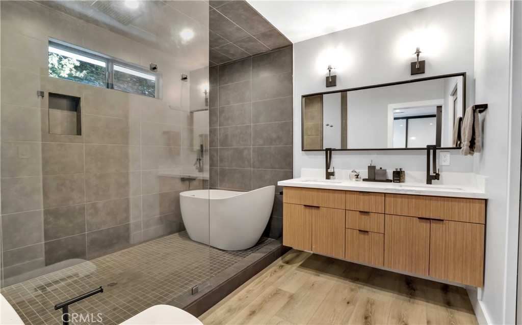 Located South of Ventura in Encino and zoned for award-winning Lanai Elementary School, this stunning single-story residence offers nearly 3,000 square feet of thoughtfully reimagined living space. Set back from the street for privacy, the five-bedroom, 3.5-bath home seamlessly blends sleek modern design with warm, inviting finishes and effortless indoor-outdoor living. At the heart of the home is a beautifully designed chef’s kitchen featuring striking Calcutta River quartz countertops, a dramatic waterfall island, seamless backsplash, custom cabinetry, premium Thermador appliances, and a 36″ Wolf Dual Fuel Range. A custom glass-enclosed wine and spirits display is a striking focal point, perfect for entertaining, flanked with a built-in wine fridge and a matching beverage fridge. Wide-plank contemporary flooring, recessed LED lighting, a stylish corner fireplace, and six custom skylights fill the home with natural light while highlighting the carefully curated designer details throughout. The spacious primary suite offers a private retreat with abundant natural light and a spa-inspired bath complete with a dual walk-in shower, soaking tub, custom vanity, and generous walk-in closet. Two additional bedrooms share a Jack-and-Jill bath, while another bedroom is currently configured as an office. A fifth bedroom, privately positioned with its own entrance and bathroom, provides flexibility for guests, an in-law suite, or a dedicated workspace. Additional features include a separate laundry room, dual Nest thermostats, updated HVAC ducting, newer windows, custom exterior finishes, ethernet throughout the home and outside, and lush landscaping. The expansive backyard is designed for entertaining with a covered patio for al fresco dining, plus a built-in BBQ and outdoor refrigerator. A rare opportunity to enjoy stylish, turnkey living in one of Encino’s most desirable neighborhoods with convenient Westside access.