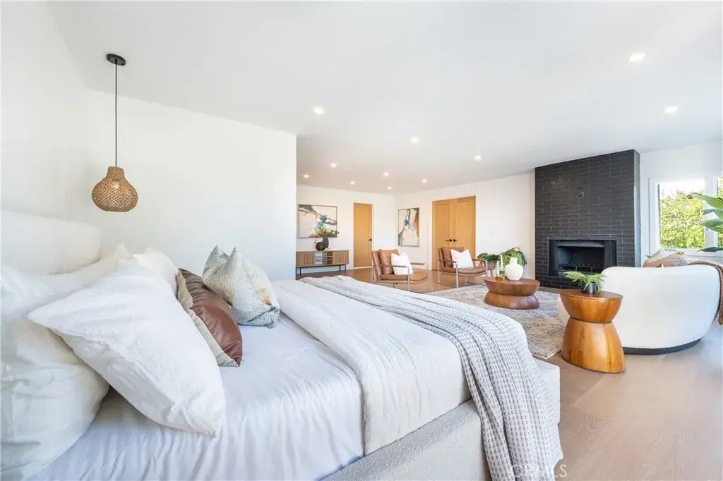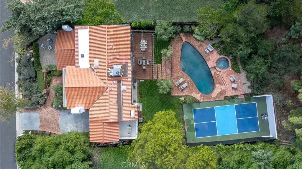 This reimagined Spanish Transitional located on nearly half an acre within the Lanai School District is a stunning fusion of architectural soul and modern sophistication. Double doors unveil a dramatic formal entry and a luminous open floor plan anchored by wide-plank wood floors, bespoke built-in niches, and striking beamed and cathedral ceilings. The living room is crowned by a stone-encased fireplace and framed by walls of glass that reveal an intimate patio/courtyard ideal for relaxed luxury. Designed with both artistry and functionality in mind, the chef’s center-island kitchen boasts generous seating and storage, stone counters, soft-close cabinetry, and a suite of premium appliances, including a Wolf 6-burner range and stove. The adjoining family room, complete with a refined wet bar and wine fridge, elevates everyday living and effortless entertaining. The formal dining room showcases designer pendant lighting, plantation shutters, and tranquil views of surrounding greenery, an elegant setting for gatherings. The home’s private spaces are nothing short of exceptional, with five en-suite bedrooms plus a chic powder room and secondary bedrooms featuring pro-organized closets. The luxurious primary suite serves as a serene sanctuary, featuring a cozy fireplace, dual sets of French doors opening to a secluded balcony, and an expansive, professionally curated walk-in closet with its own wine fridge. The spa-inspired bath exudes resort-level indulgence with a soaking tub, dual-person rain shower with built-in seating, dual vanities, privacy toilet, and an additional private balcony. A convenient upstairs laundry room enhances day-to-day ease. The expansive, sprawling backyard is the star of the show which unfolds as a true California resort oasis complete with a pickleball court, gated pool and spa, pergola-covered lounge, brick-lined patios, and lush grassy areas crafted for both relaxation and recreation. A rare offering where timeless design, elevated amenities, and the quintessential indoor/outdoor CA lifestyle converge in perfect harmony.