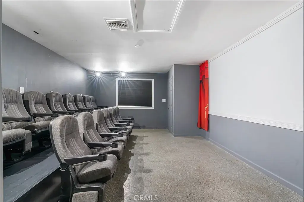 The detached guest structure of approximately 857 sq. ft. offers multiple rooms, including an office and a media room with built-in theater elements, providing a flexible layout for a variety of uses.