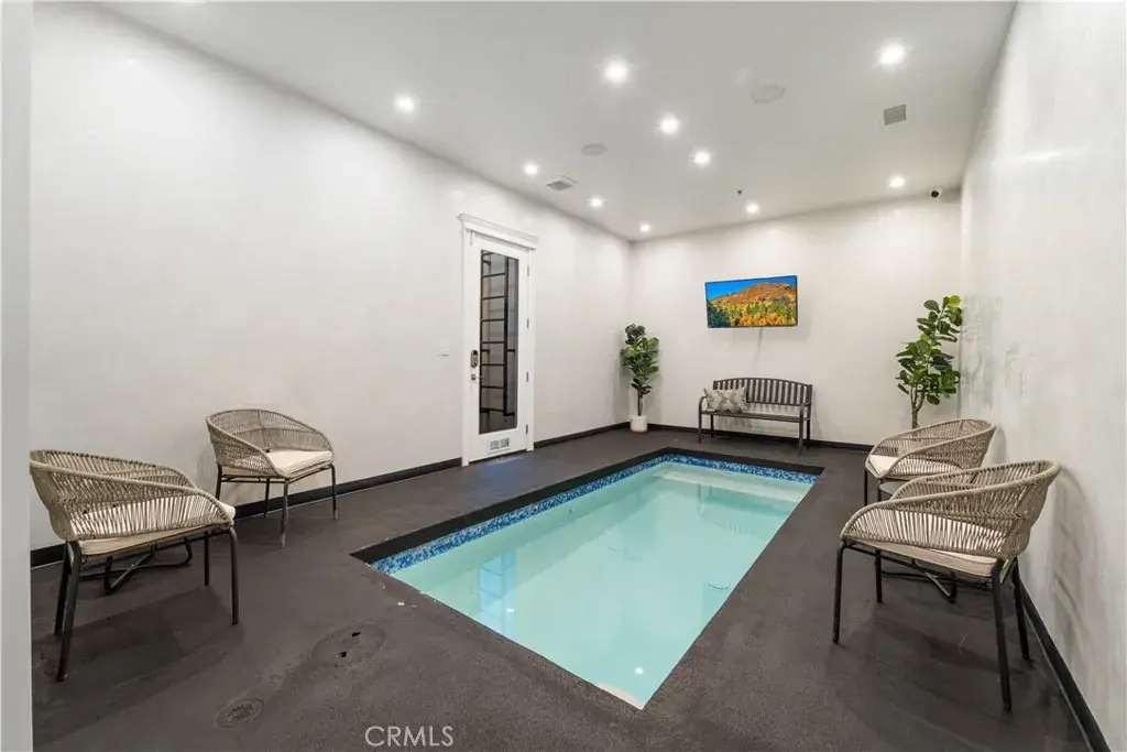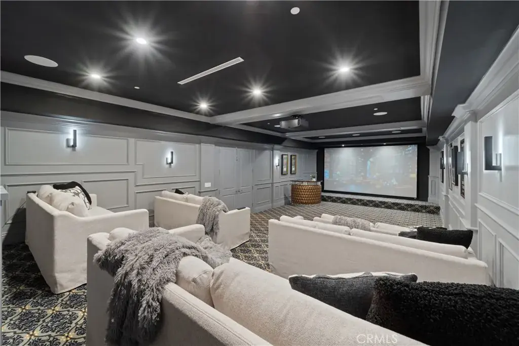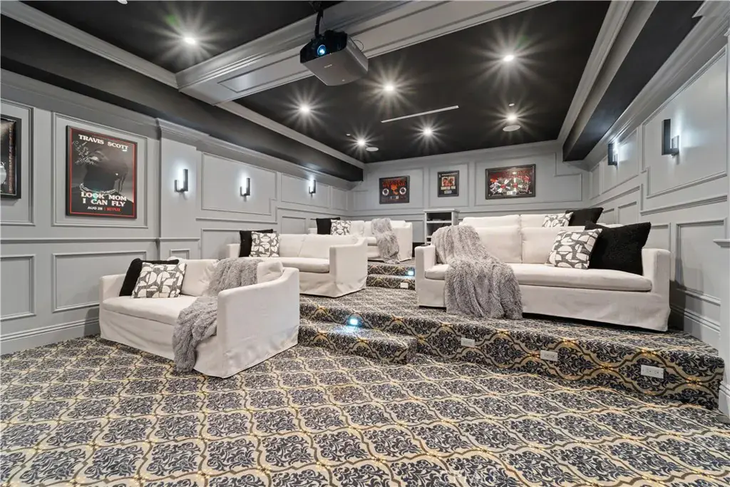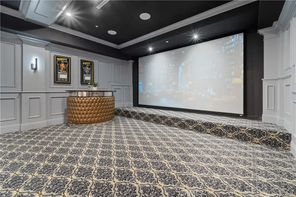 • Oversized luxury movie theater with elevated seating + floor-to-ceiling screen