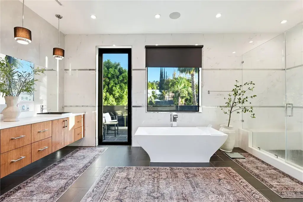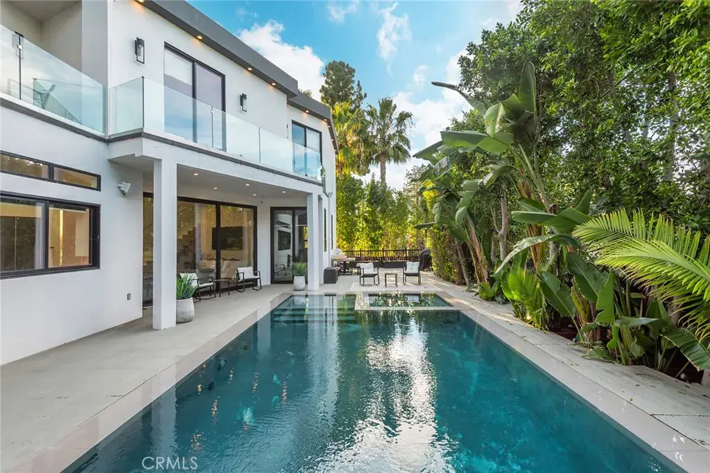 Extraordinary newer built contemporary with a prime South of the Blvd location in Encino! Ideally set on a corner lot with sensational privacy is this custom 4132 square foot beauty. The tremendous open concept floorplan boasts 20 foot ceilings with 4 bedrooms and 4.5 baths. The center island kitchen opens seamlessly to the great room which is graced with a full floor to ceiling wine cellar and sliders that open to the backyard. The primary is warmed by a fireplace, underscored with hardwood floors and provides a spa-like bathroom and private balcony with city light views! In addition to the primary, there are are two secondary en-suite bedrooms upstairs and one en-suite bedroom down. The backyard boasts a zero edge pool and spa and mature tropical landscape. Among the homes other attributes are a Control 4 Smart home system, small front exterior wall with pedestrian gate entrance and electric gated driveway leading to a beautifully designed 2 car garage. Winner!