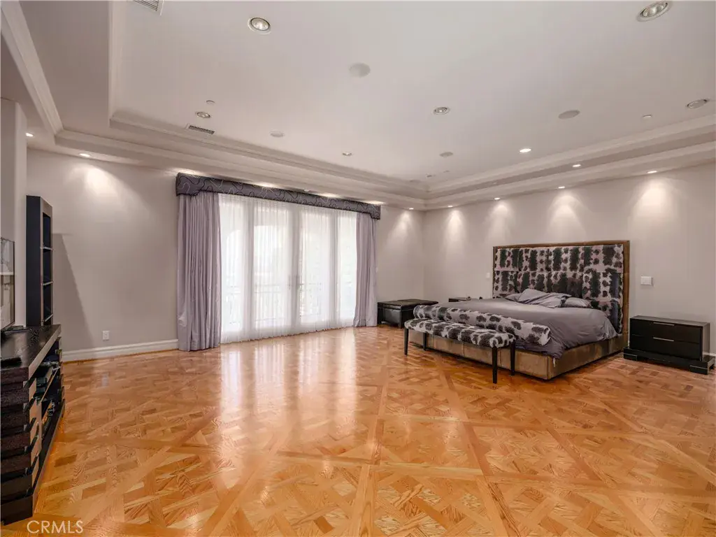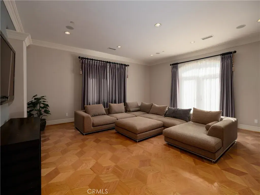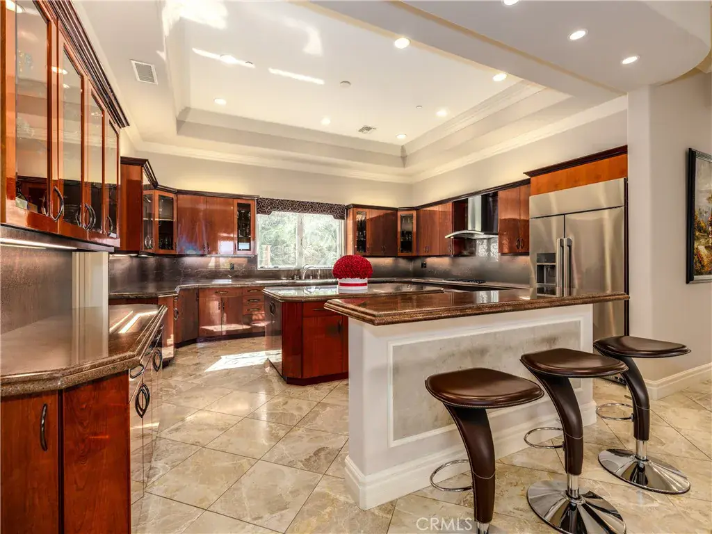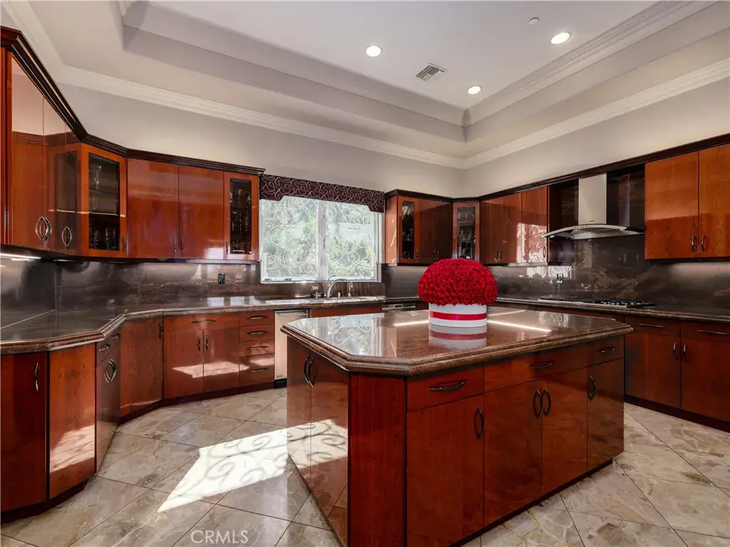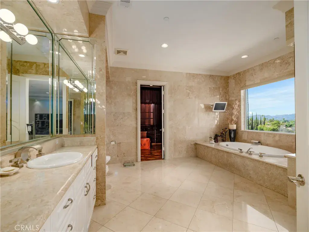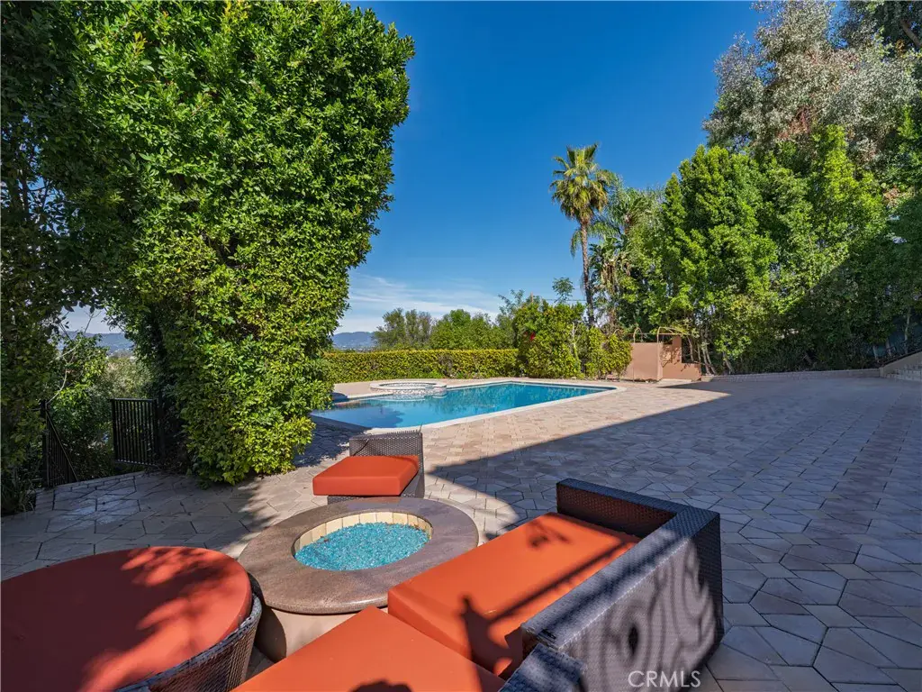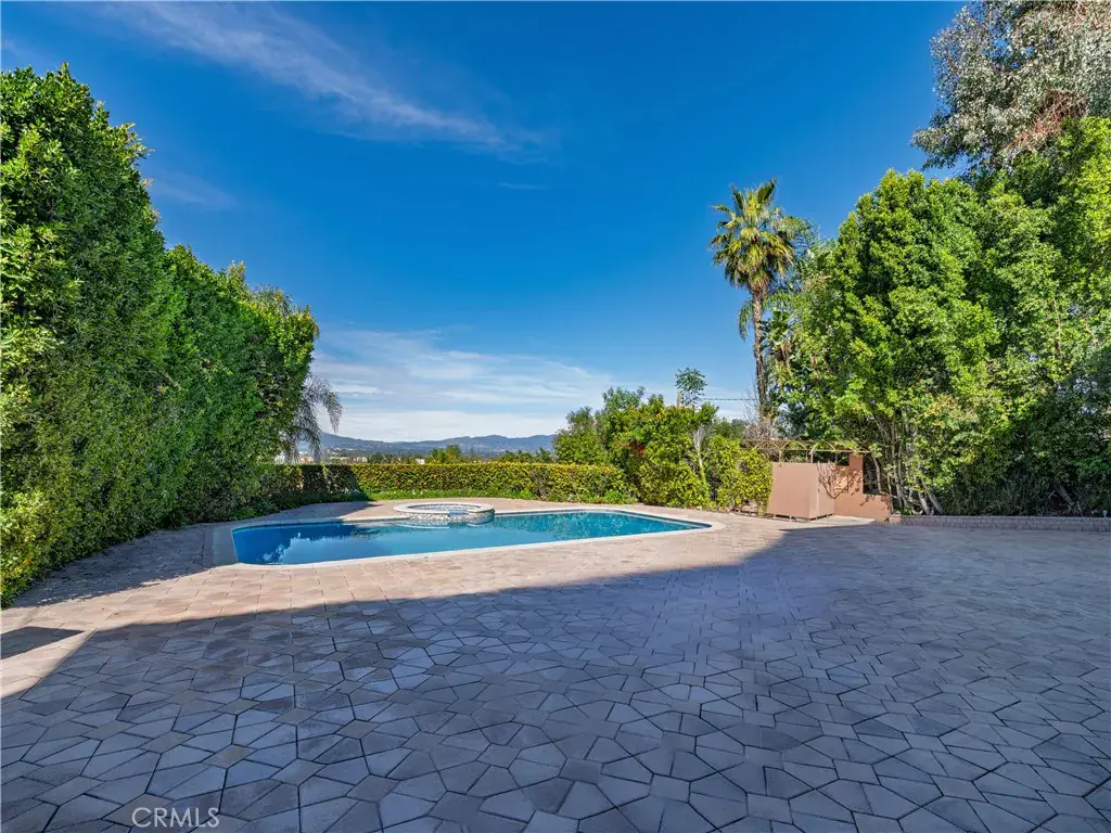 Located behind private gates in one of Encino’s most desirable South of Ventura Boulevard locations, this impressive Mediterranean estate offers exceptional privacy, grand scale living, and panoramic valley views. Built in 2009, the residence showcases timeless architecture and elegant finishes throughout. A dramatic two-story entry with custom wrought-iron double doors, soaring ceilings, and a sweeping staircase creates an unforgettable first impression. Rich hardwood floors, extensive custom millwork, and expansive windows fill the home with natural light while framing beautiful views of the surrounding hills and valley. The thoughtfully designed floor plan offers multiple formal and casual living spaces ideal for entertaining. The gourmet chef’s kitchen with custom cabinetry, stone counters, and center island opens to spacious gathering areas and flows seamlessly to the outdoor entertaining spaces. The expansive primary suite serves as a luxurious retreat, featuring a sitting area with fireplace, balcony overlooking the valley, spa-style bathroom with soaking tub and walk-in shower, and large custom walk-in closets. Additional luxury amenities include a home theater, elevator, fitness room, wet bar lounge, and beautifully appointed bathrooms throughout. Designed for indoor-outdoor living, the resort-style backyard features a sparkling pool and spa, multiple lounge areas, and covered terraces ideal for year-round entertaining while enjoying sweeping valley views. A private gated motor court with expansive paver driveway and attached three-car garage provides ample parking and privacy. Ideally located just minutes from Ventura Boulevard’s premier shopping, dining, and entertainment, this exceptional property offers the perfect blend of luxury, scale, and convenience in the heart of Encino.
