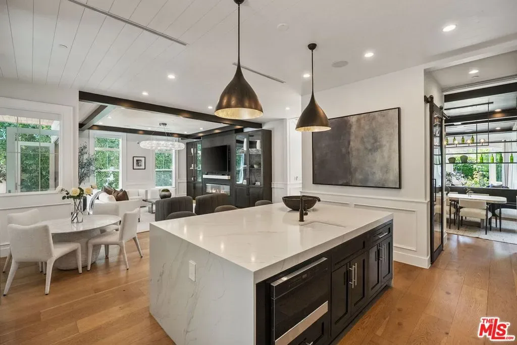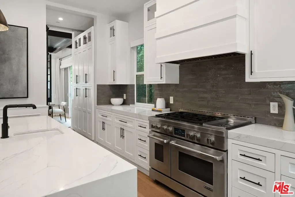 Welcome to the perfect combination of classic East Coast elegance, seamlessly blended with modern California living. Privately gated and masterfully crafted, this five-bedroom, five-bathroom estate is situated on the quietest section of Valley Vista Blvd. Spanning over 3,600 square feet of refined interiors and resort-caliber amenities, this home offers elevated living at every turn. A gated front courtyard welcomes you into a serene garden sanctuary featuring lush landscaping, a vegetable and flower garden, and a peaceful sitting area. Step inside the grand foyer where ceilings soar over 20 feet, accented by intricate moldings, a dramatic statement staircase, and hand-blown glass chandelier. Wide-plank European oak floors in rich natural tones contrast beautifully against bespoke black coffered ceilings, setting the stage for timeless sophistication. Anchored by a massive center island with waterfall edge quartz countertops, the entertainer’s kitchen is outfitted with premium JennAir appliances, custom cabinetry, two separate sinks, and a built-in wine display wall. The center island is suitable for large brunches or a quick after-school snack. The space flows seamlessly into the sun-drenched breakfast area and inviting family room with modern electric fireplace and an indoor-outdoor experience through expansive glass accordion doors. Upstairs, the primary suite is a private retreat with a fireplace, vaulted ceilings, and French doors opening to a sprawling balcony with treetop views. The spa-inspired bathroom offers a freestanding soaking tub, dual vanities, oversized shower for two, and boutique-style walk-in closet. Additional bedrooms on the second floor are all ensuite and beautifully appointed with access to balconies. The backyard is a true oasis complete with a sparkling pool and spa with an ambient waterfall, custom wood decking, built-in barbecue, covered patio, and multiple areas for lounging and entertaining. Additional features include a spacious main-level guest suite, upstairs laundry room, Sonos sound system, smart home technology ready, automatic blackout shades, wired security system with interior and exterior cameras, and a two-car garage with direct entry. This home offers easy access to Encino’s finest amenities including top-rated schools, Equinox, Trader Joe’s, Encino Commons, Balboa Park, Los Encinos State Historic Park, El Caballero Country Club and the 101 freeway. Whether you are dining out, shopping, or seeking nature and wellness, everything is just minutes away.