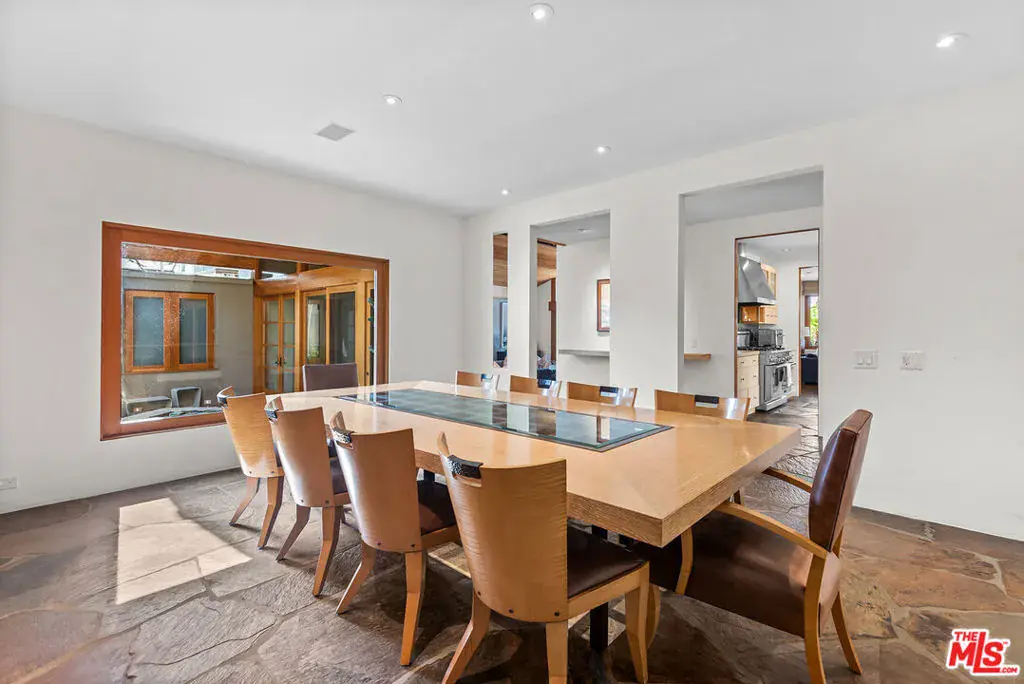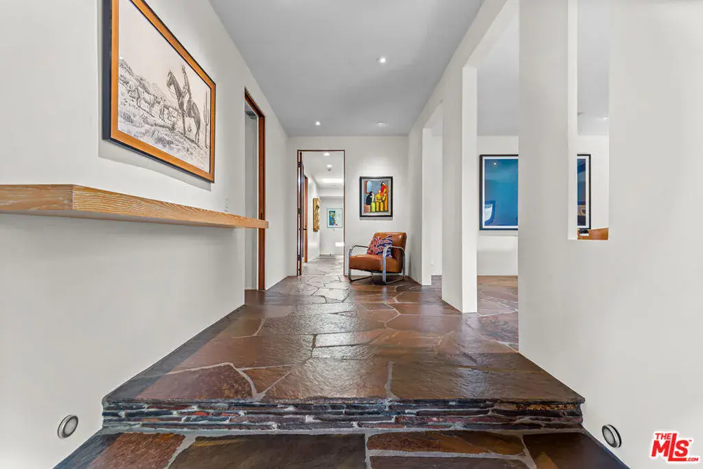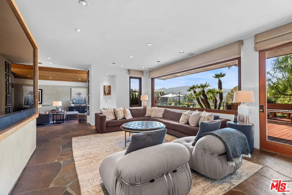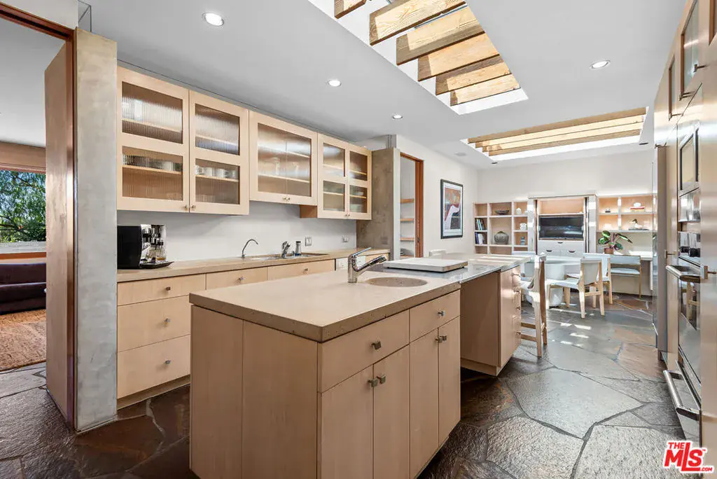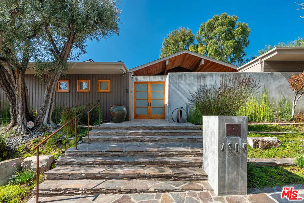Tucked behind a sculptural concrete wall in Encino’s coveted Royal Oaks enclave, this striking residence is a masterwork of California Mid-Century Modern design reimagined with organic and contemporary influences. A private courtyard with a burbling fountain sets a tranquil tone, while open living spaces showcase exquisite craftsmanship, natural textures, and refined simplicity. The living room’s soaring exposed-wood vaulted ceiling crowns a wall of glass that highlights the home’s effortless indoor-outdoor flow. The primary suite serves as a serene, Zen-inspired retreat, while its spa-like bath is a study in natural luxury featuring warm wood accents, hand-set stone walls, a skylit rain shower, and a deep soaking tub. Beyond, an architectural landscape of flagstone terraces, olive trees, and sculptural plantings unfolds to reveal sweeping canyon views. The expansive Ipe deck offers built-in seating, an outdoor kitchen, and seamless flow to a stunning stone-framed pool with an adjacent cold plunge. A glass-enclosed sauna with panoramic views and a secret treehouse nestled among mature trees complete the property’s resort-like atmosphere an inspired fusion of design, nature, and quintessential California modern living.