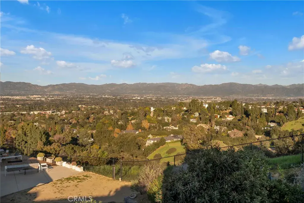 Set high above the city in the Encino Hills—where sky, light, and landscape converge—this privately gated residence offers a rare sense of seclusion paired with commanding, cinematic views. Adjacent to the Encino Reservoir and perched to capture sweeping 180-degree panoramas across the San Fernando Valley, the home feels suspended above it all: quiet, luminous, and profoundly private. Spanning approximately 4,755 square feet, this 5-bedroom, 5.5-bath home is a refined contemporary reimagining of its mid-century origins, fully rebuilt in 2019 with exceptional taste and architectural restraint. Walls of glass dissolve the boundary between indoors and out, framing the ever-changing valley below and bathing the interiors in natural light from dawn through dusk. A long, gated approach heightens the sense of arrival. Inside, a dramatic great room unfolds with soaring vaulted, beam-accented ceilings, an oversized statement fireplace, and a built-in bar—an expansive yet intimate space designed for both quiet evenings and large-scale entertaining. The home flows effortlessly to outdoor terraces, where the view remains the constant focal point. The open kitchen is sleek and purposeful, anchored by a generous central island, custom cabinetry, and high-end appliances, with a sunlit breakfast area positioned to take full advantage of the vistas. Multiple ensuite bedrooms provide flexibility for guests, office, gym, or media use, including a sound-insulated den or theater. Upstairs, the primary suite is a true sanctuary, featuring dual walk-in closets, a spa-caliber bath, and a private glass-railed balcony floating above the valley. Outdoors, the property becomes a private hillside resort: wraparound patios, pool with Baja shelf and spa, firepit, outdoor kitchen, lush landscaping, mature fruit trees, and abundant rose gardens. Thoughtfully rebuilt with luxury finishes, fire sprinklers, tankless water heaters, and an attached two-car garage, this is a home where design, engineering, and setting align—minutes from Ventura Boulevard, Mulholland, and the Sepulveda Pass. This is not simply a house with a view, but a rare vantage point above the city.