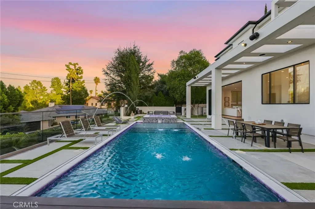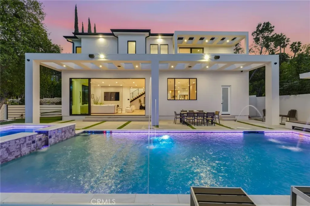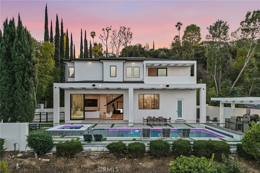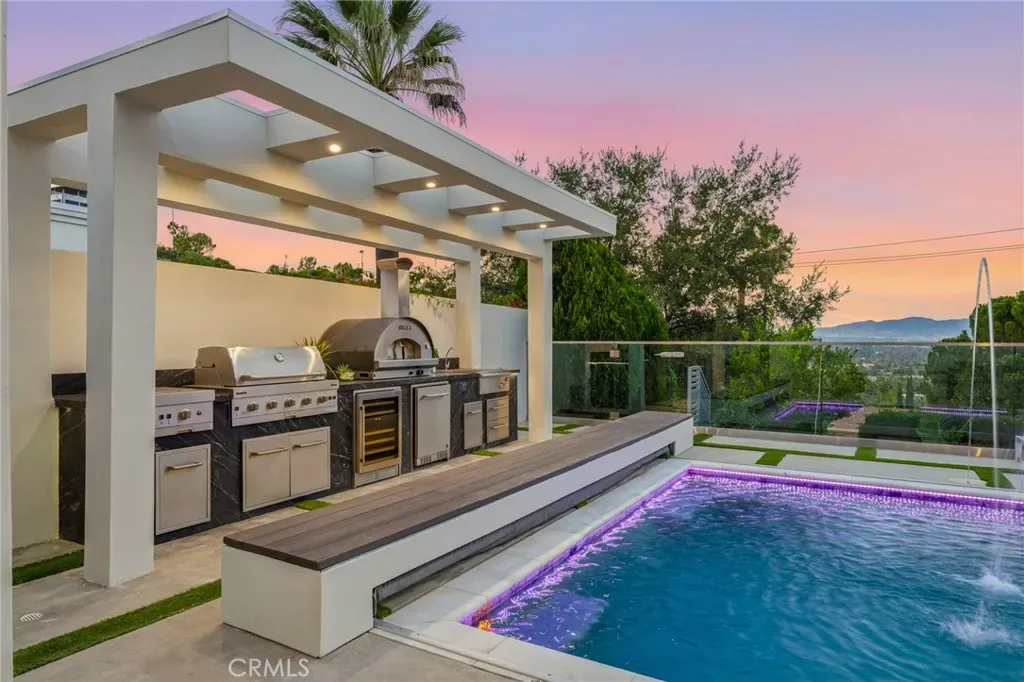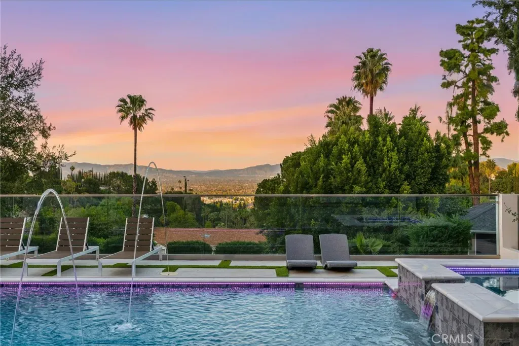 Ultra-private gated Encino compound offering rare seclusion, security, and refined design on an expansive over 18,500 Sqft lot. Fully enclosed with security fencing and mature landscaping, the property delivers complete privacy from every direction while capturing tranquil valley and green nature views. From the moment you enter through the gates, the residence feels intentionally removed from the outside world quiet, serene, and thoughtfully composed. Designed by one of Los Angeles’ most respected interior designers, the approx. 5,717 Sqft home showcases soaring ceilings, abundant natural light, and an open-concept layout that balances architectural presence with warmth and livability. High-end finishes, custom carpentry, and curated materials define every space, creating a cohesive aesthetic that feels luxurious yet inviting. The floor plan offers five generously sized bedroom suites, a private office ideal for focused work, a dedicated theater, and an oversized walk-in pantry designed for daily ease and entertaining. The primary suite serves as a private retreat with spa-inspired bath, expansive steam shower, and serene outlooks framed by lush greenery. Outdoor living is designed as a true extension of the home, featuring a resort-style pool and spa with sweeping views and total privacy, fire pit, and a fully equipped outdoor kitchen with BBQ, pizza oven, cooktop, refrigerator, and temperature-controlled beverage cooler. An additional approx. 300 SF outdoor gym and storage/doghouse add versatility. Smart home technology enhances comfort, security, and efficiency throughout. A large three-car garage and gated driveway provide ample secure parking. A rare Encino offering that prioritizes privacy, design, and lifestyle where luxury feels intentional and value is found in what cannot be replicated.