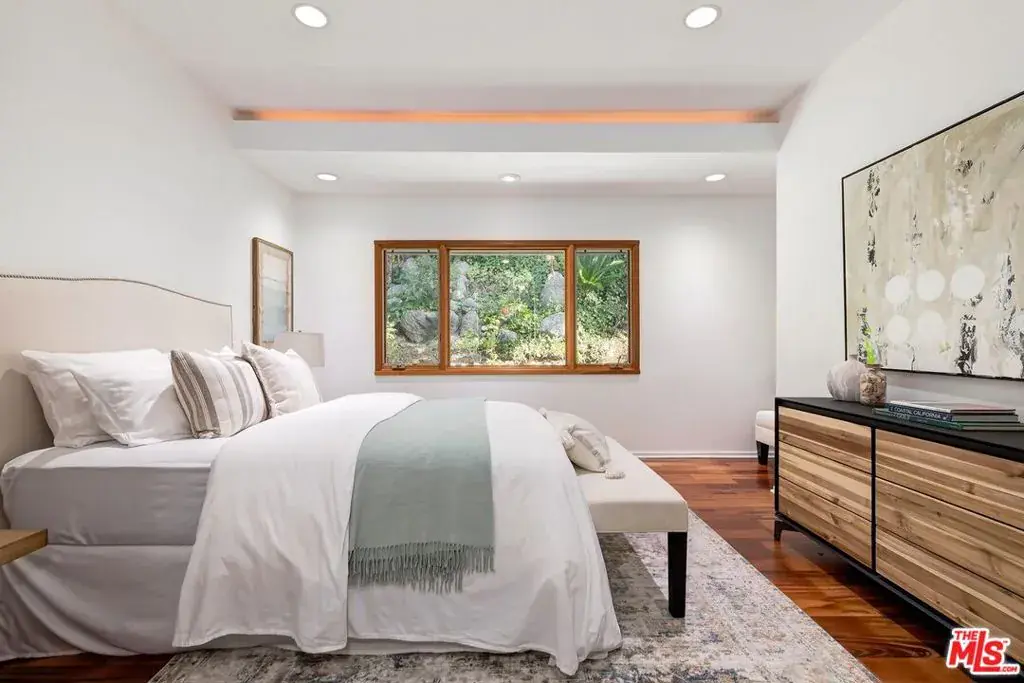 Tucked away at the end of a long gated driveway, this rare Traditional home sits on a lush, expansive lot surrounded by mature landscaping. The living room features hardwood floors, new carpeting, a fireplace, and walls of glass that seamlessly bring the outdoors in. The open floor plan flows effortlessly through the dining room, breakfast area, and chef’s kitchen ideal for both everyday living and entertaining. The sumptuous primary suite overlooks a serene, park-like setting and offers a generous bath and oversized closets. A second bedroom suite is conveniently located on the main level. Upstairs, a spacious family/den is joined by two additional bedrooms, each with balcony access. Outdoors, the pool and gardens create a tranquil private retreat. There is a convenient changing room and full bath next to the pool. Additional highlights include a two-car garage, gated entry for maximum privacy and security, and a quiet cul-de-sac location. Rustic, resort-style living in the heart of Encino.