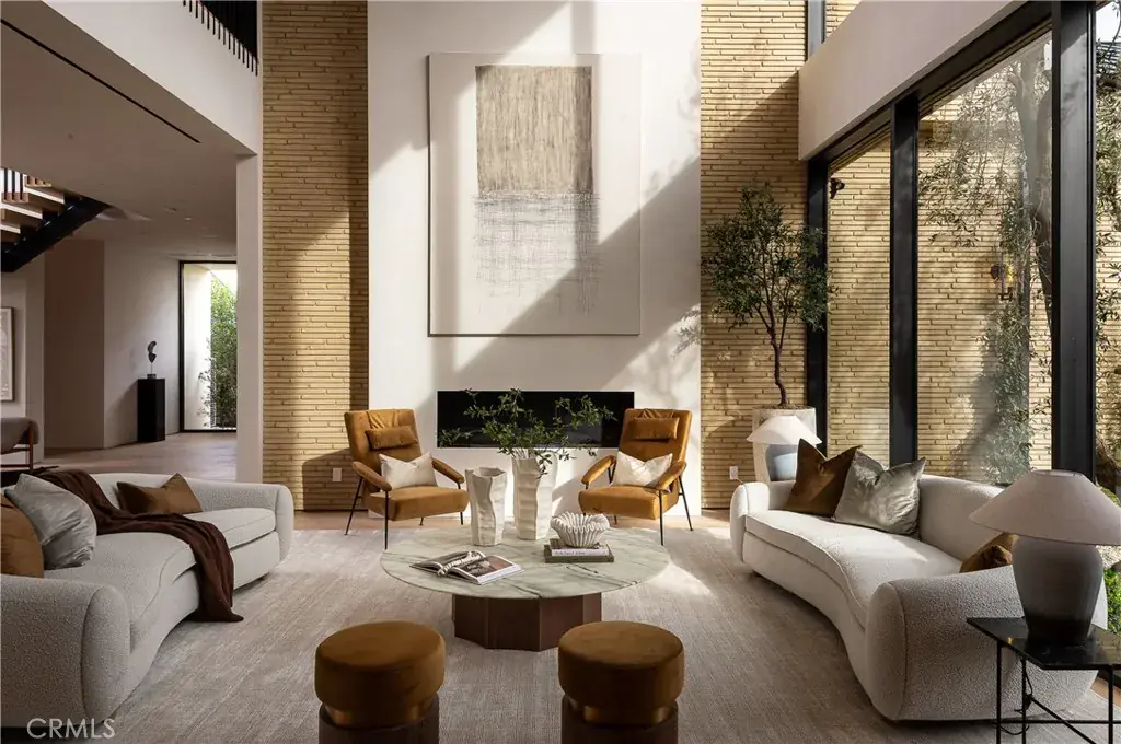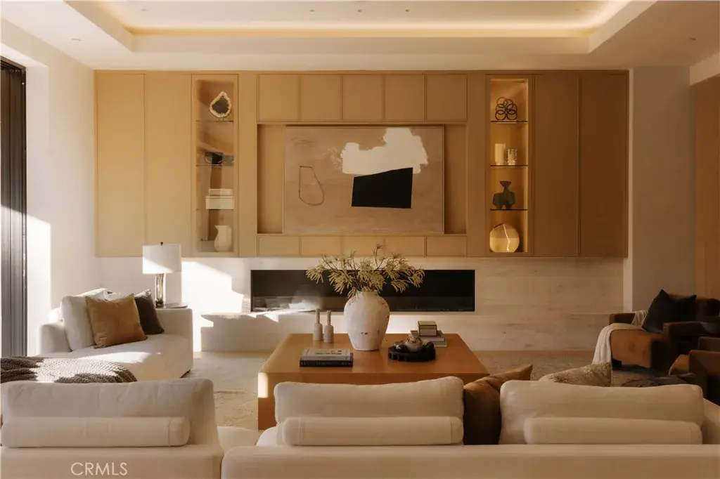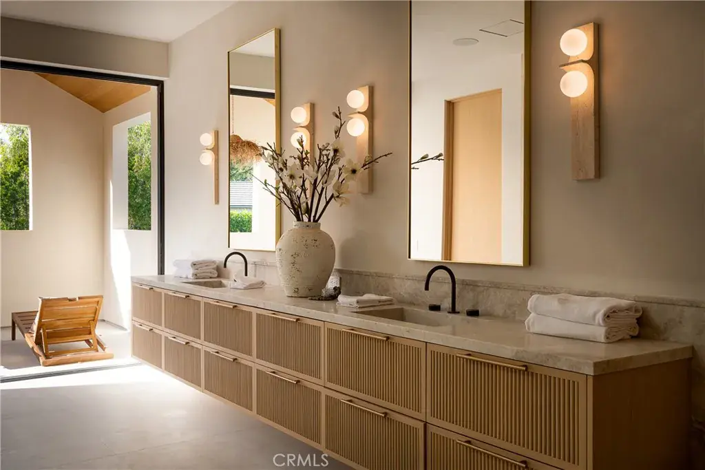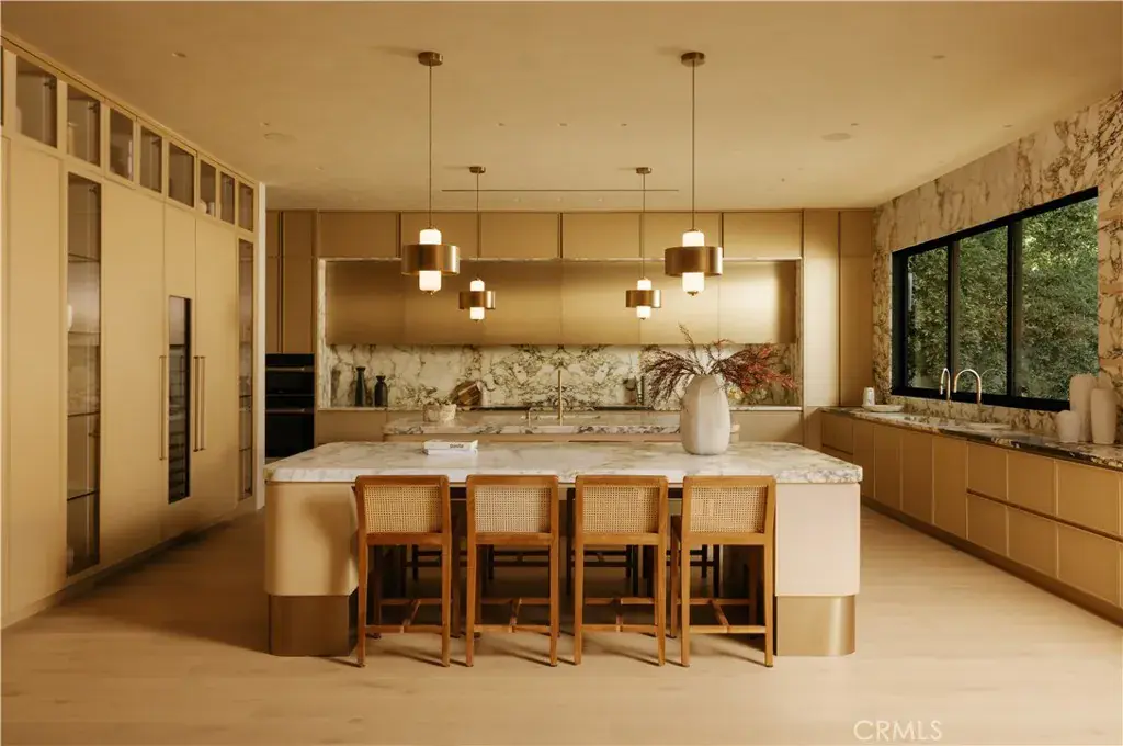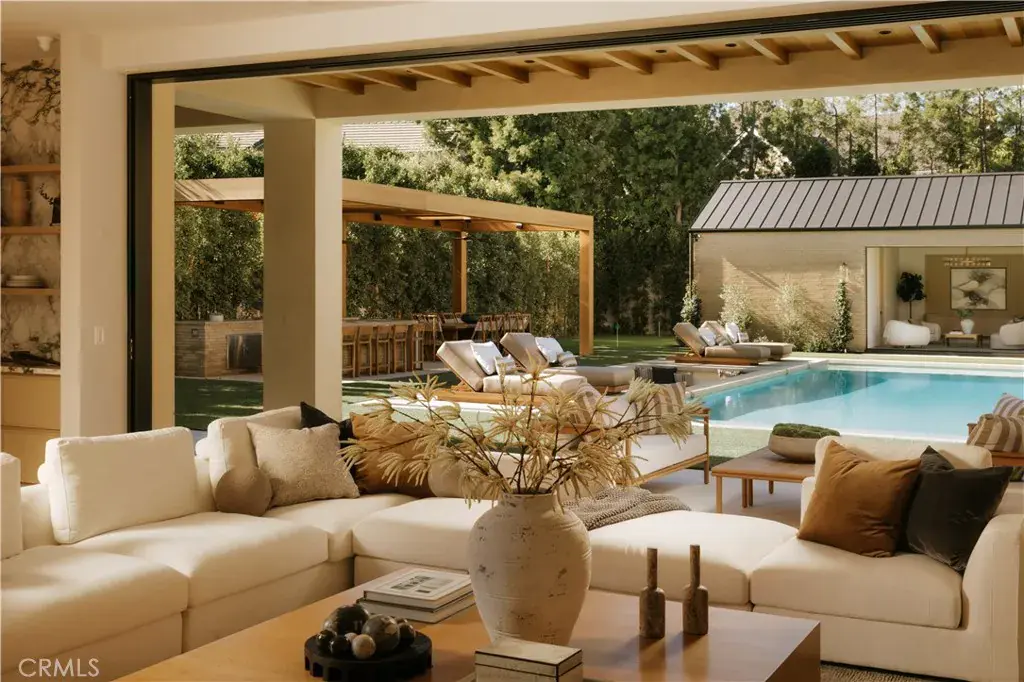 Introducing a masterfully crafted gated estate that redefines luxury living, privacy, and scale in the heart of Encino’s prestigious Royal Oaks enclave. Designed by acclaimed architect Eran Gispan and elevated by bespoke interiors from Sophea Design, the residence delivers a seamless balance of modern sophistication and resort-style living—crafted at the highest level. A grand circular motor court with paver detailing, and two mature olive trees creates a timeless sense of arrival and privacy. Inside, soaring two-story ceilings, hand-applied plaster walls, and warm wood detailing frame a light-filled, open floor plan. Wide-plank white oak floors extend throughout the entire home. The kitchen is a true statement of form and function, anchored by a double island wrapped in dramatic Calacatta Viola marble, Custom white oak cabinets, premium Miele appliances, and a separate prep kitchen with walk-in pantry. Adjacent to the dining area, a serving bar with limestone countertops and backsplash enhances entertaining flow, while the family room is defined by a sculptural travertine stone. The main residence features six bedrooms, all en-suite, in addition to an office, a dedicated movie theater, gym, lounge and game room. The primary suite is a private sanctuary, highlighted by a private balcony and a spa-inspired bath wrapped in leathered Taj Mahal stone, complete with a skylit shower that fills the space with soft natural light. Designed for year-round enjoyment, the grounds unfold as a true private resort. The expansive backyard includes an oversized pool with spa, sunken firepit, basketball court, putting green, generous grassy yard, and a fully equipped outdoor kitchen and barbecue—ideal for both intimate evenings and large-scale entertaining. Completing the compound is a detached guest house featuring one bedroom, one bathroom, and a living area, offering exceptional flexibility for guests, extended family, or a private studio. Additional highlights include a four-car garage, expansive gated driveway, exceptional privacy throughout, and a full Control4 smart-home system managing lighting, climate, interior and exterior audio, alarm system, and security cameras. Located moments from Ventura Boulevard’s premier dining and boutique shopping, and within the highly coveted Lanai Road School District. This one-of-a-kind estate offers the scale of a private compound, the sophistication of a designer residence, and the lifestyle of a world-class retreat.