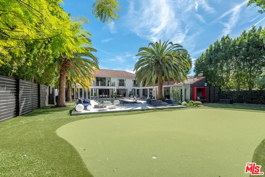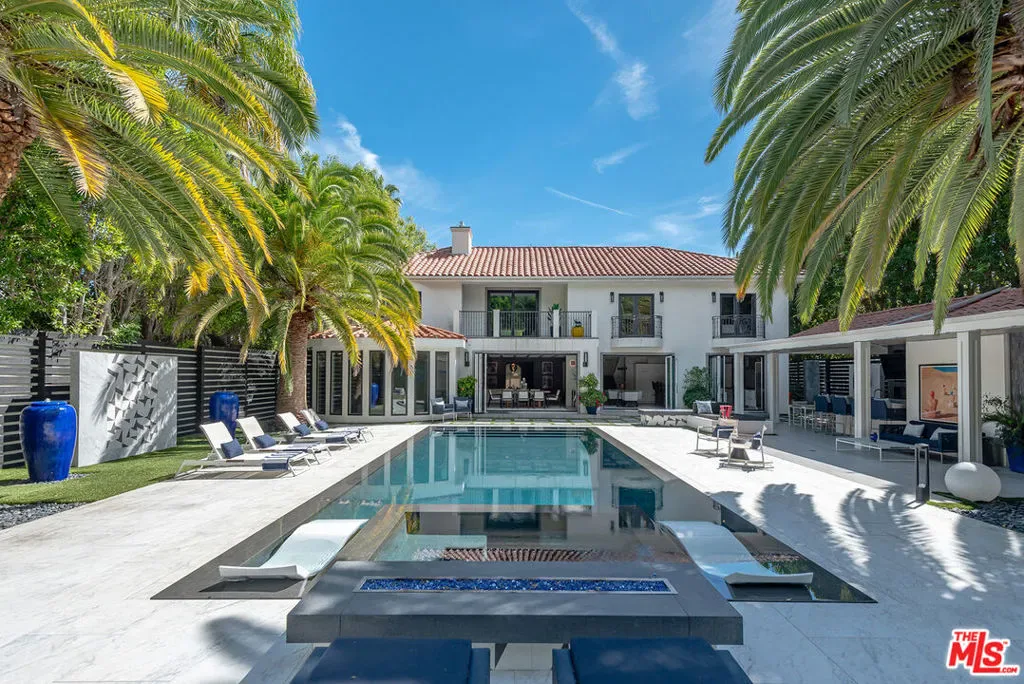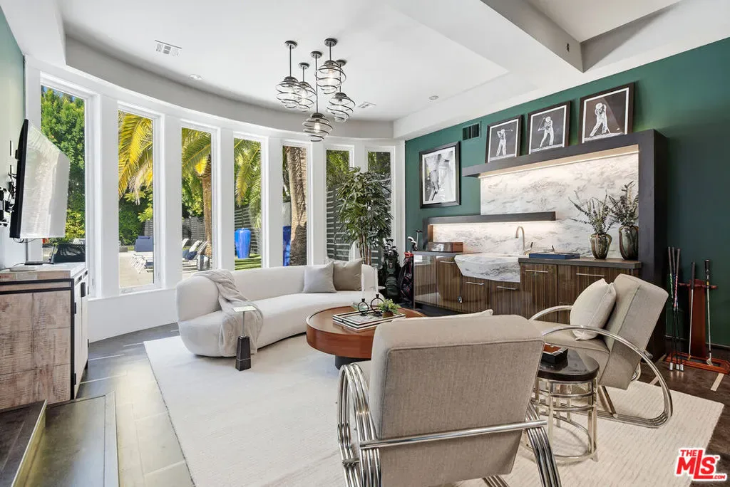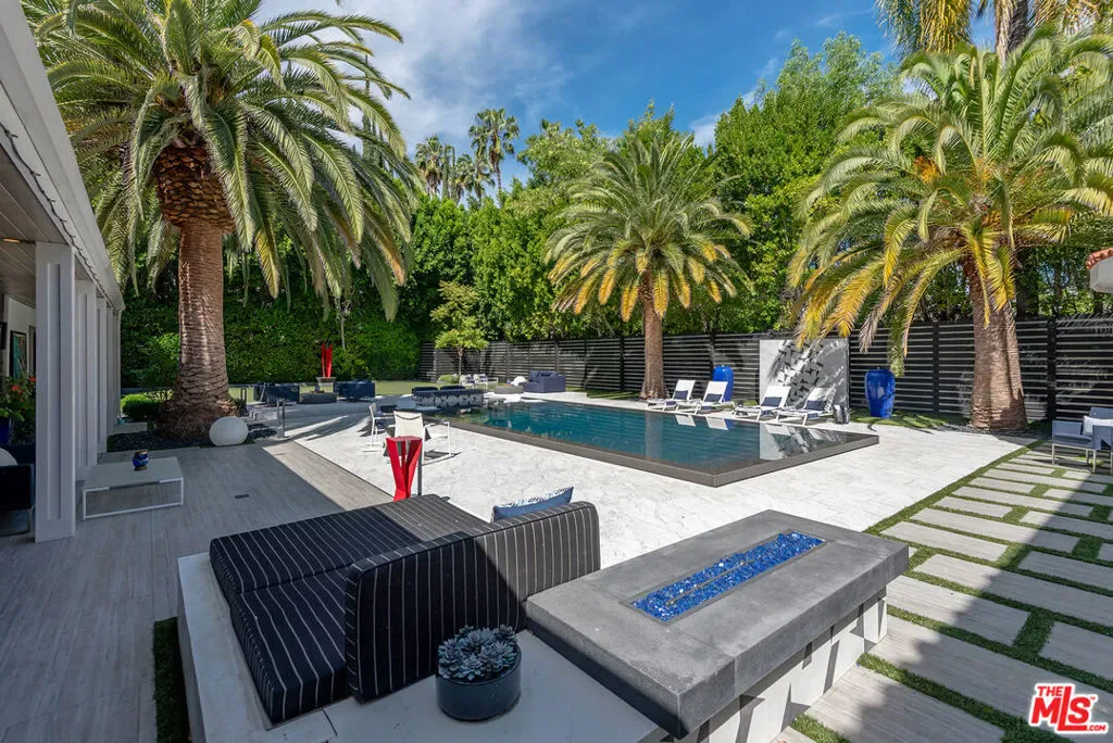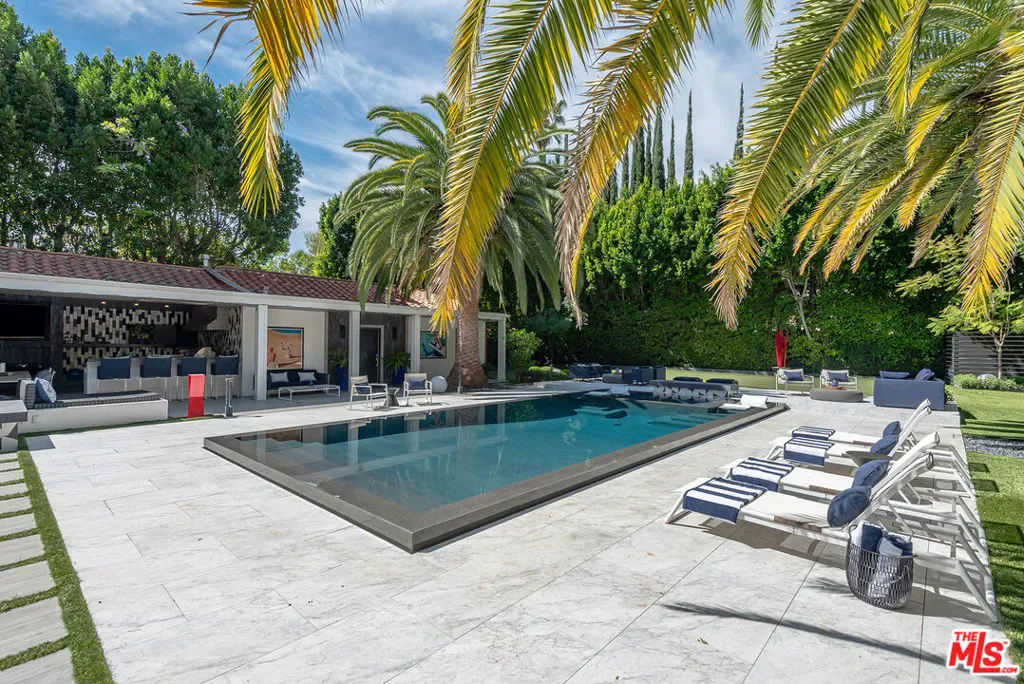 Supremely private Stately gates with imposing 25′ high hedges hide a true miracle of a home that serves as the ideal host for fantastic entertainment. State of the art Movie theater. State of the art Golf Simulator with cigar lounge that has humidifier filtration for fresh clean air. Bold designer choices abound – gorgeous on-trend fixtures and dynamic wallpaper coverings. Two downstairs en suite bedrooms, two other upstairs en suite large bedrooms. Another bedroom converted into a complete spa with wet and dry sauna and massage table. The other bedroom adjacent to the Primary suite has been opened to serve as a huge killer office. Upstairs laundry has been added to complement the downstairs laundry off the secondary staircase. This is truly a luxurious floorplan. La Cantina folding doors open to reveal an immaculate backyard that blows you away. Placid infinity pool reflects the subtle exterior lighting with various daybeds and conversation lounges surrounding cozy fire pits. The outdoor kitchen offers a veritable restaurant experience with the pizza oven, fireplace, TV and bar.