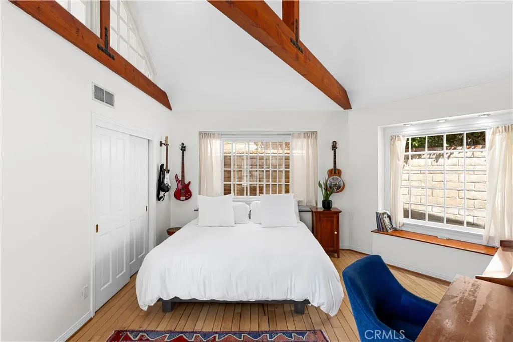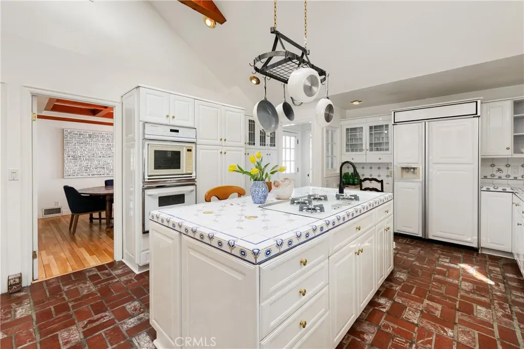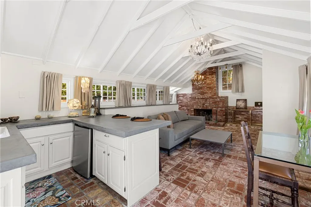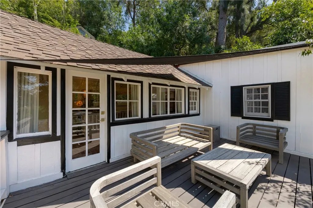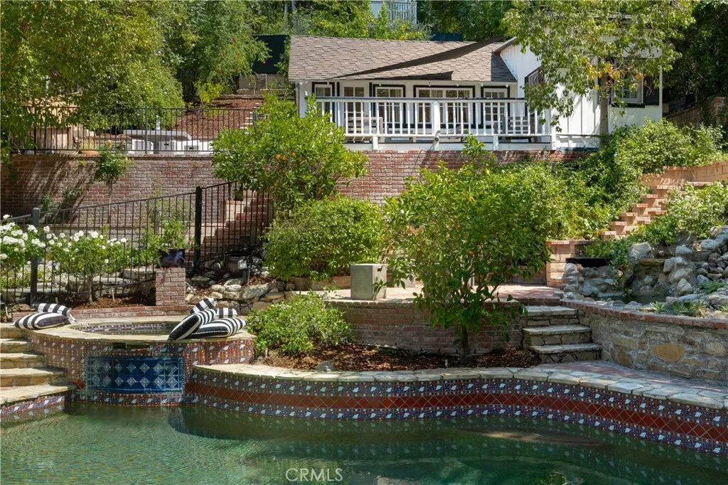 Tucked away on a peaceful cul-de-sac in the celebrated Rancho Estates, this enchanting, gated property offers a rare blend of privacy, charm, timeless character, and pure emotion. Set on an expansive approx. 18,000 sq. ft. sprawling lot, this storybook hideaway, reminiscent of a “writer’s retreat,” feels worlds away-yet is just minutes away from Ventura Blvd and its many vibrant dining and shopping options. Featuring 3 spacious bedrooms, 4 bathrooms, plus a captivating multi-purpose guest house, this Traditional-style residence is rich with warmth and architectural detail. A welcoming living room showcases a vaulted wood-beamed ceiling, bay window, wood floors, built-in bookshelves, and a classic brick fireplace. This space flows seamlessly into a generous formal dining room with a coffered ceiling, French windows, and a door that leads to a delightful rear patio. The hub of the home is a sunlit country kitchen, featuring vaulted ceilings, a center island with gas cooktop, generous storage, a built-in desk, and bright breakfast area. Adjoining the kitchen is a large guest suite with its own full bath, while a versatile flex space off the living room makes for a perfect study, library, or music room. The bedroom wing includes a secondary ensuite bedroom overlooking the front yard, and an alluring, primary suite with a walk-in closet, French windows, and a newer remodeled bath with separate shower, soaking tub, and decorative tile flooring. Perched above the main home, the intimate and secluded guest house offers its own tranquil space, complete with vaulted wood-beamed ceilings, brick floors, kitchenette, full bath, and engaging outdoor spaces including a viewing deck and entertaining patio, ideal for guests, a home office, or creative studio. Explore the lushly landscaped grounds embellished with fruit trees, including pomegranate, cherry, olive, and a dozen citrus trees, or meander among the multiple flagstone and brick pathways. Host unforgettable summer barbecues around the gated, pebble bottom pool and spa surrounded by flagstone decking, lounge areas, and a separate waterfall. Additional amenities are a 2-car garage, ample driveway parking, storage shed, dual-zone HVAC, and an alarm system. Separate entrances make it easy to work from home. A unique and special sanctuary, this one-of-a-kind property is the perfect blend of countryside tranquility and city convenience, custom made for those seeking the ultimate in location, environment, and beauty.