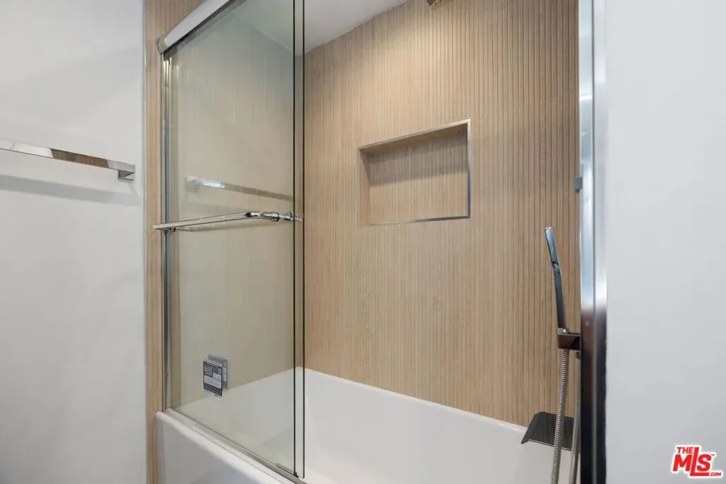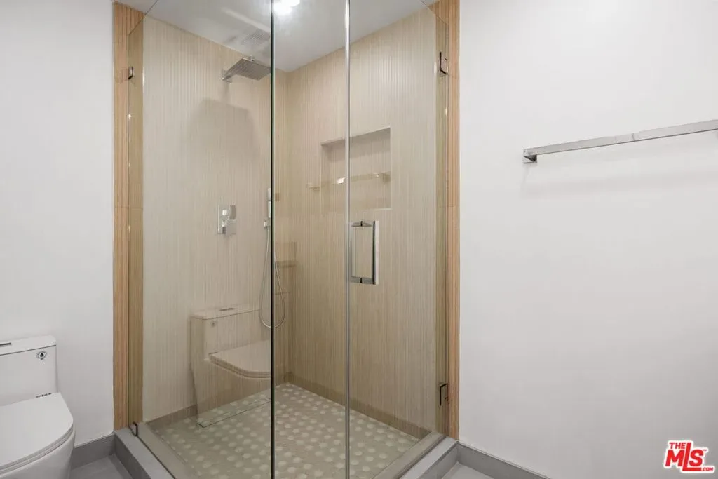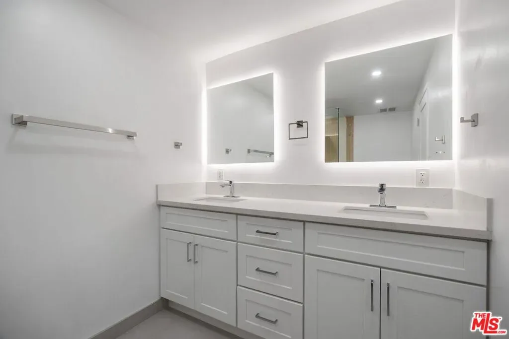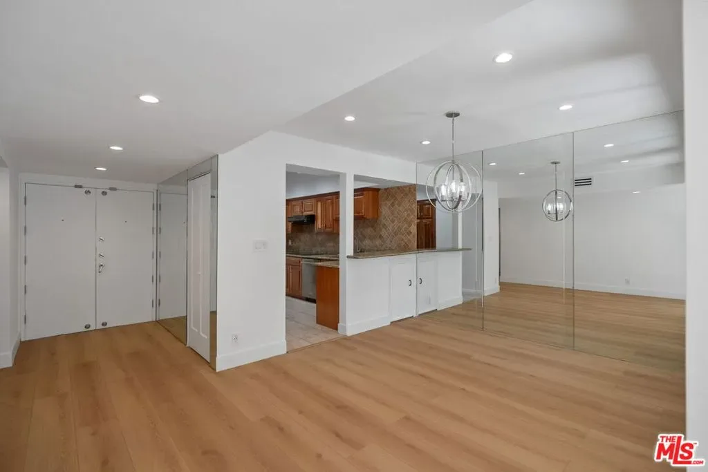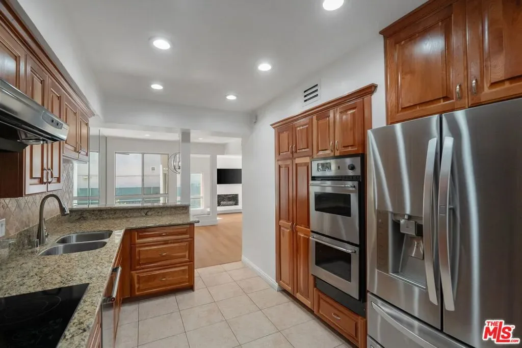 Welcome home to one of Encino’s most distinctive condo addresses. This recently renovated 3-bedroom, 2-bath residence at the iconic Woodley building delivers a living experience that is rare in the condo market, combining refined interiors, spa-quality finishes, and a private outdoor terrace, all on the top floor with no neighbor above. Step inside to find wide-plank blonde hardwood floors flowing throughout a sun-drenched open floor plan. The living and dining areas make an immediate impression: a full-wall mirrored panel doubles the sense of space, while an orbital globe chandelier adds effortless elegance. Sliding glass doors connect the living room seamlessly to your private covered patio, a true outdoor living room complete with a wall-mounted TV and ceiling fan, perfect for California indoor-outdoor living. The kitchen features rich raised-panel cabinetry, granite countertops, a diamond-pattern stone tile backsplash, and stainless steel appliances, including a French door refrigerator and dishwasher. A peninsula bar opens to the dining area, ideal for entertaining. A wet bar with a beverage refrigerator is tucked into the living space, adding a convenient hospitality touch. The primary suite is a retreat unto itself, with a spa bathroom showcasing dual backlit LED vanity mirrors, quartz countertops, white shaker cabinetry, and a frameless glass walk-in shower wrapped in floor-to-ceiling wood-look tile with a rain head fixture and built-in niche. The second bath continues the theme with a tub/shower combo, glass sliding doors, and a rain shower. The third bedroom offers exceptional versatility as a home office, guest suite, or creative space. Residents enjoy one of the best lobbies in the Encino condo market: elegant designs, terrazzo floors, and a welcoming lounge area that creates a genuine sense of arrival. The secured garage features gated key-access entry with elevator, and includes two separate assigned parking spaces, one on each side of the drive aisle, and four guest parking spaces, offering privacy and ease of access. Top-floor living, refined finishes, and a private outdoor retreat. This is Encino condo living elevated. Schedule your private showing today.