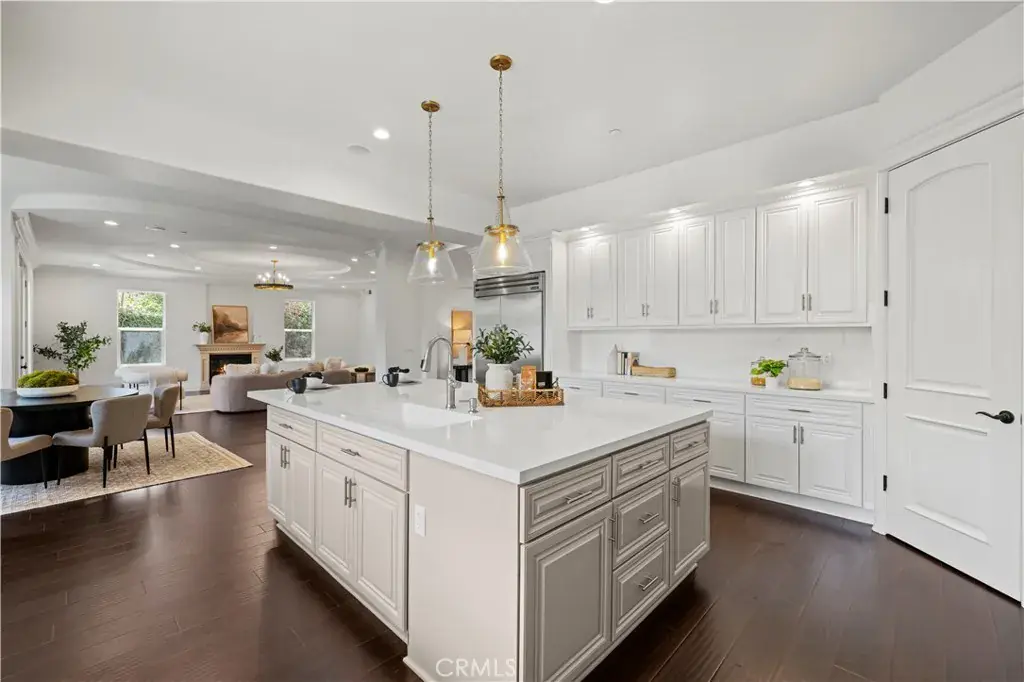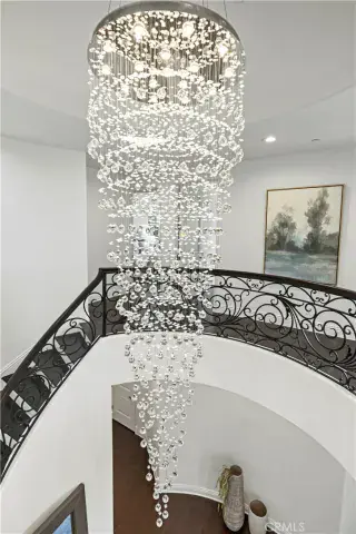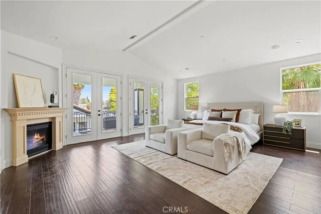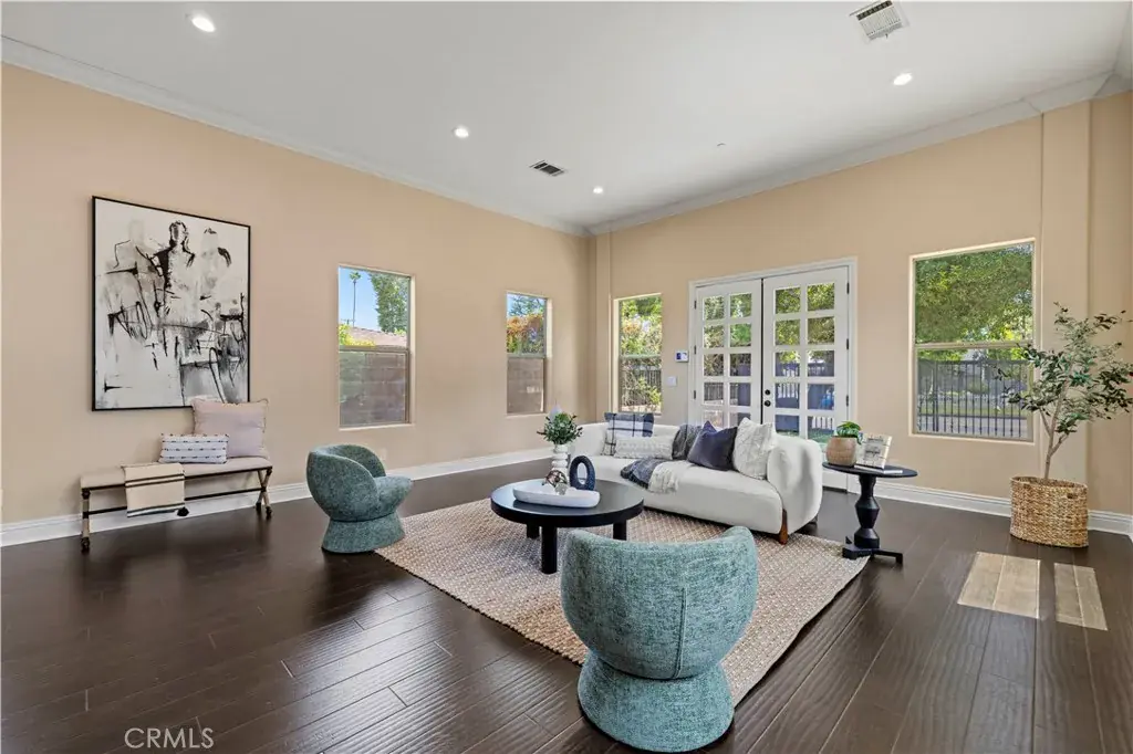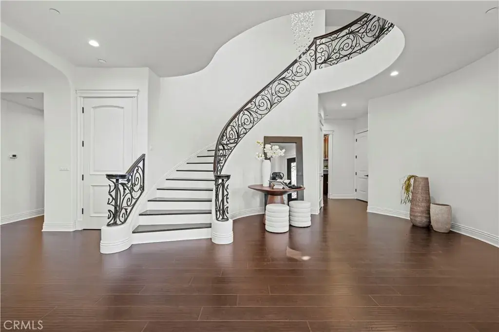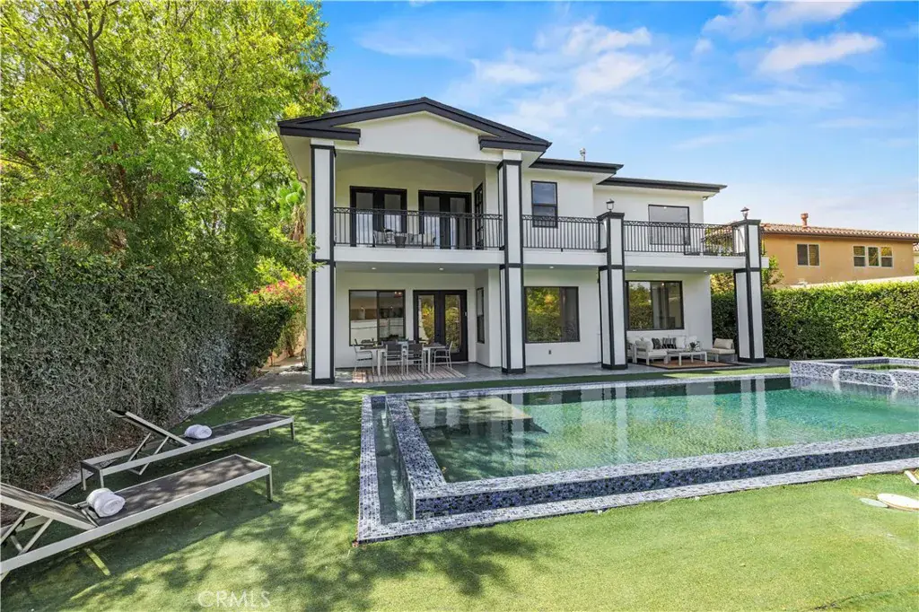 Tucked away at the end of a private cul-de-sac, this French Chateau inspired trophy estate offers timeless elegance, grand scale, and a rare detached ADU guest house. A dramatic double height foyer sets the tone, highlighted by a sweeping wraparound staircase and striking custom chandelier. The formal living room impresses with soaring ceilings, a statement fireplace, and towering bay windows that fill the space with natural light. Designed for both everyday living and entertaining, the chefs kitchen features custom cabinetry, a generous center island, high end stainless steel appliances, and an expansive walk in pantry. The kitchen opens seamlessly to the family room with fireplace and French doors, creating exceptional indoor outdoor flow. All five bedrooms are oversized, each offering ensuite bathrooms and walk in closets. The romantic primary suite is a true retreat, complete with a private foyer, sitting room, dual walk in closets, a spa inspired bath with custom shower and soaking tub, and a private balcony. The entertainers backyard provides a resort style setting with pool, spa, covered patio, and low maintenance turf, ideal for gatherings or quiet relaxation. The detached guest house includes a spacious living area, full kitchen and bath, and a large bedroom, perfect for guests, multigenerational living, or additional income potential.