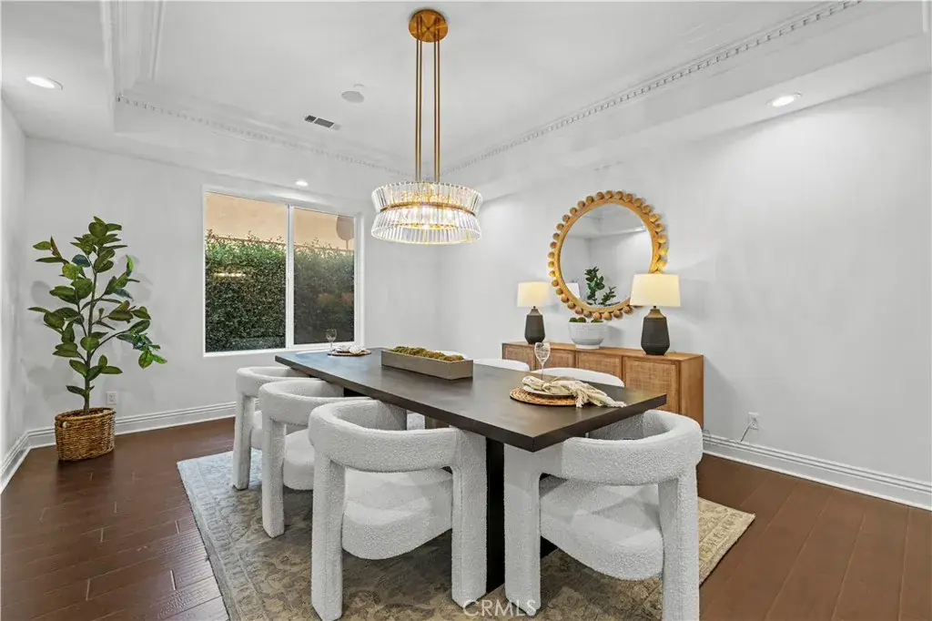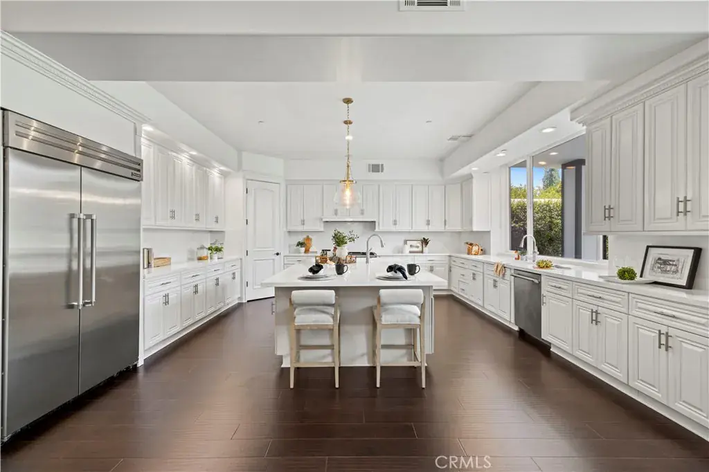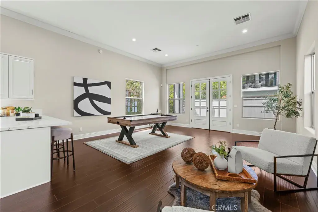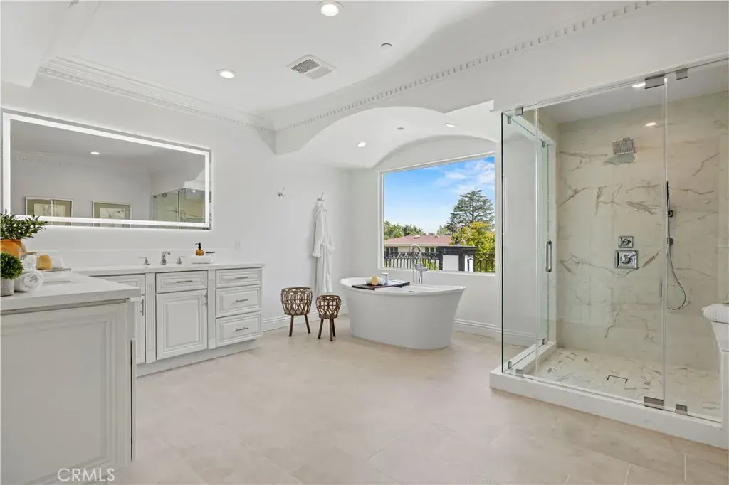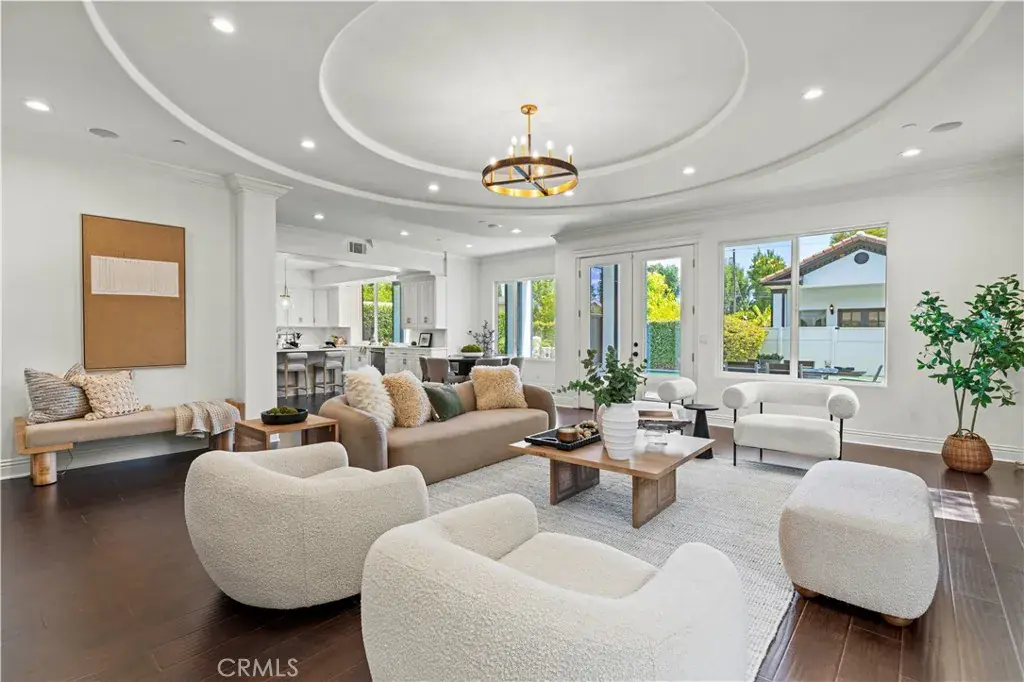 Tucked away at the end of a private cul-de-sac, this French Chateau inspired trophy estate offers timeless elegance, grand scale, and a rare detached ADU guest house. A dramatic double height foyer sets the tone, highlighted by a sweeping wraparound staircase and striking custom chandelier. The formal living room impresses with soaring ceilings, a statement fireplace, and towering bay windows that fill the space with natural light. Designed for both everyday living and entertaining, the chefs kitchen features custom cabinetry, a generous center island, high end stainless steel appliances, and an expansive walk in pantry. The kitchen opens seamlessly to the family room with fireplace and French doors, creating exceptional indoor outdoor flow. All five bedrooms are oversized, each offering ensuite bathrooms and walk in closets. The romantic primary suite is a true retreat, complete with a private foyer, sitting room, dual walk in closets, a spa inspired bath with custom shower and soaking tub, and a private balcony. The entertainers backyard provides a resort style setting with pool, spa, covered patio, and low maintenance turf, ideal for gatherings or quiet relaxation. The detached guest house includes a spacious living area, full kitchen and bath, and a large bedroom, perfect for guests, multigenerational living, or additional income potential.
