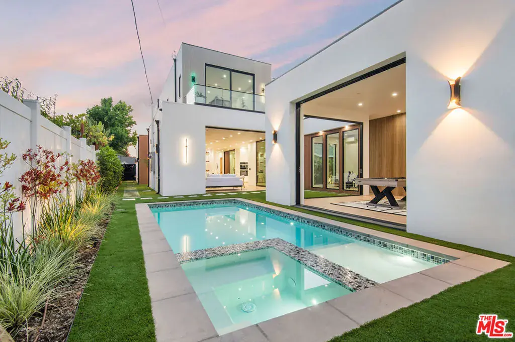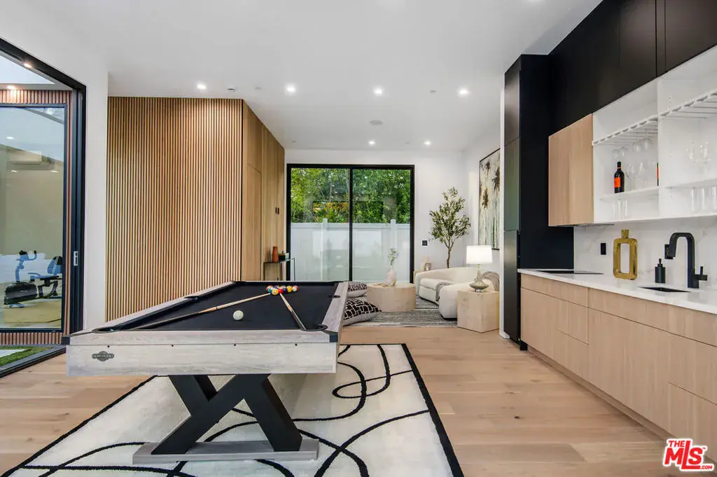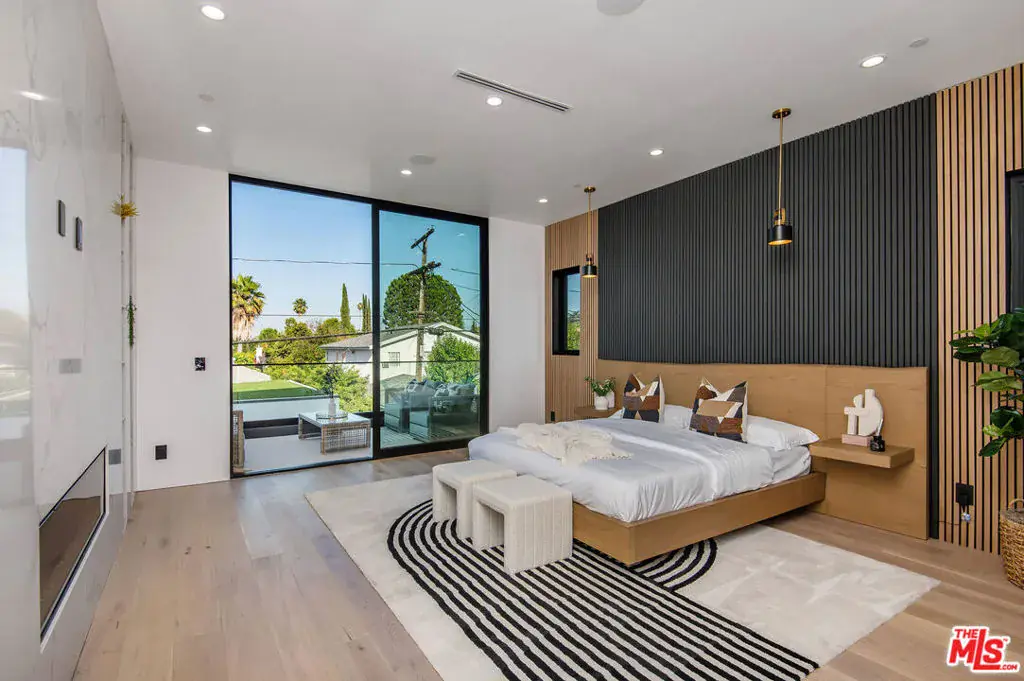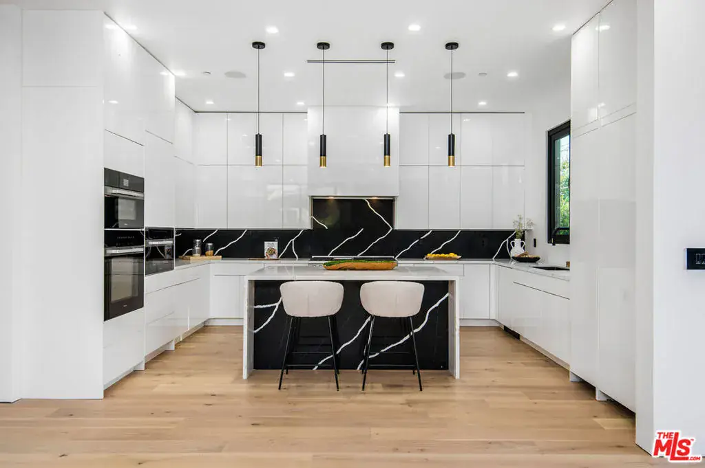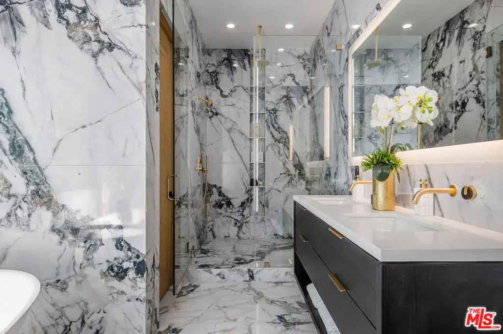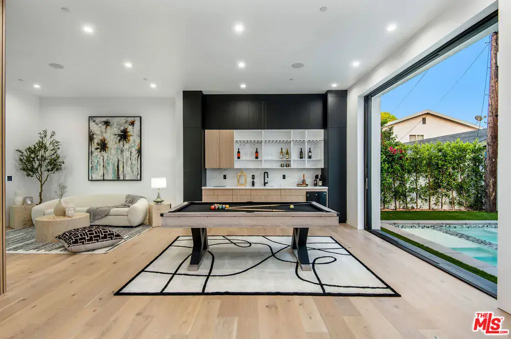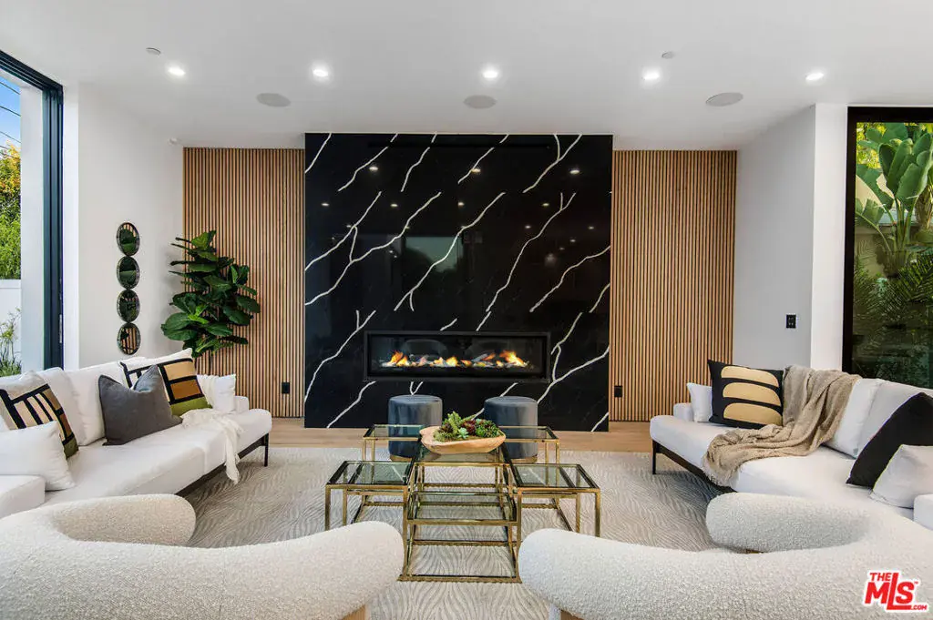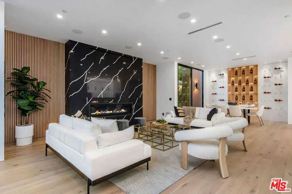 Wonderfully expansive contemporary home uniquely sited south of Ventura Boulevard, close to El Caballero Country Club in an enviable part of Encino. Two stories, with an architectural entry, 5132 Lindley Avenue boasts vast entertainment spaces, many with wood paneled walls and grand moonstone quartz that emulates the impressive exterior entrance. The living room is anchored with a custom-built floor-to-ceiling black and white fireplace, elegant paneling, and banks of modern bespoke doors offering backyard vistas to the pool and family room, a dining area, wine wall, and a beautifully appointed modern chef’s kitchen with Miele appliances, 60″ dual oven range and a generous marble pull-up waterfall island. This bright 5-bedroom, 6-bathroom home, completed in 2024, features a cohesive neutral color palette with unmatched quality throughout, including meticulous stonework, beaded wood panels, bespoke cabinetry, and large windows, complemented by wide-plank light oak flooring. All bathrooms feature intricate marble work and brass fixtures; the primary suite boasts a glass-fronted gas fireplace, marble shelving, a walk-in closet, and a stand-alone bathtub. A second ground-floor vocational space features a private additional living area. Oversized pocket doors lead to the outdoor heated pool and spa, and are surrounded by manicured gardens. Other amenities include wired speakers, a comprehensive security system, and WiFi extenders throughout the home, Apple iPad tablets to control home systems, and two AC units for optimal climate control.