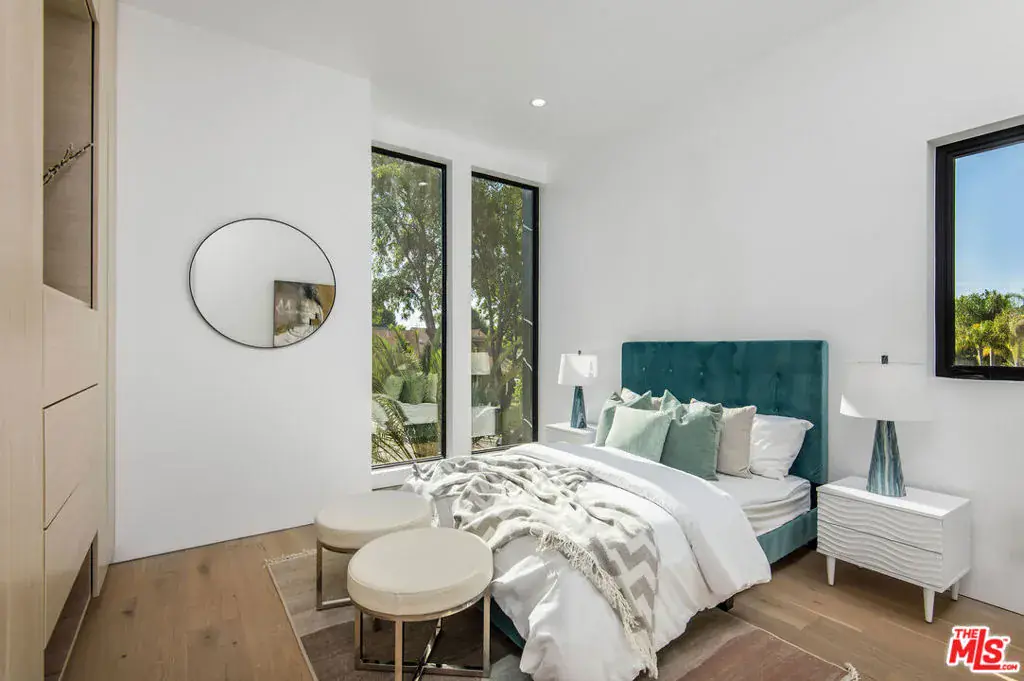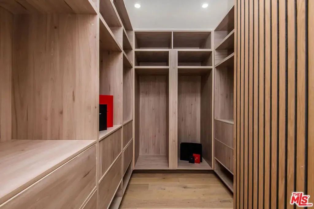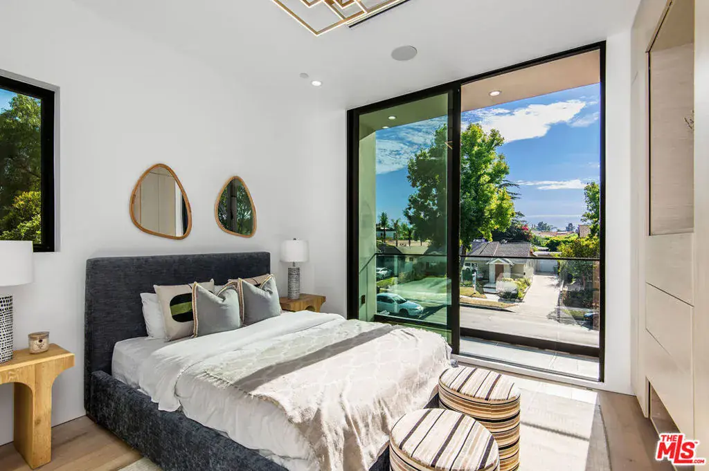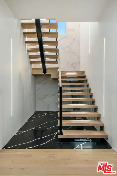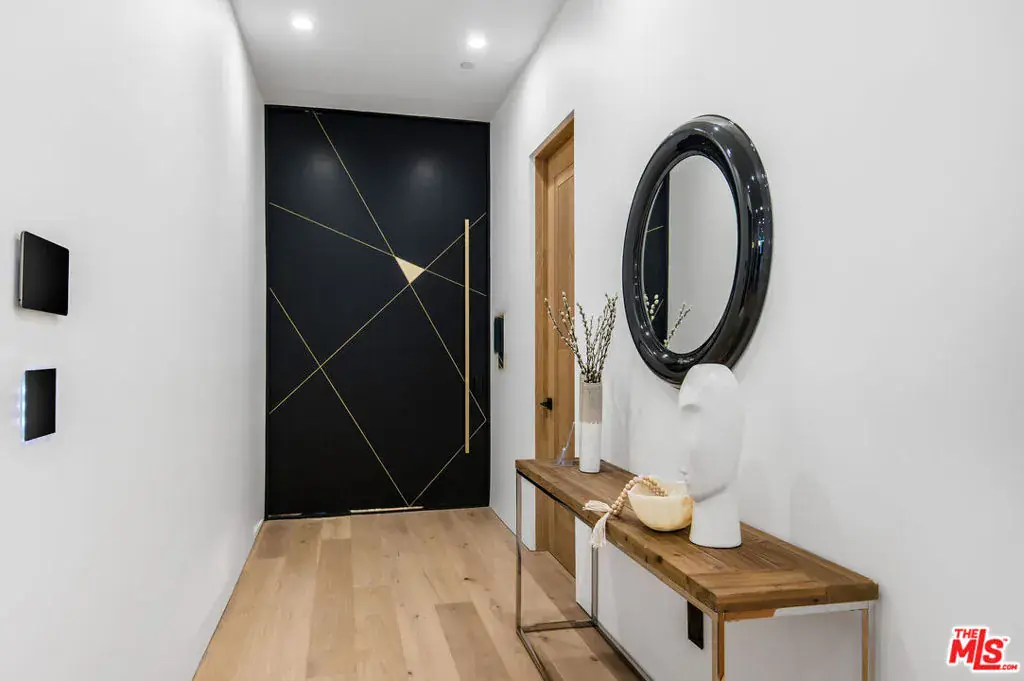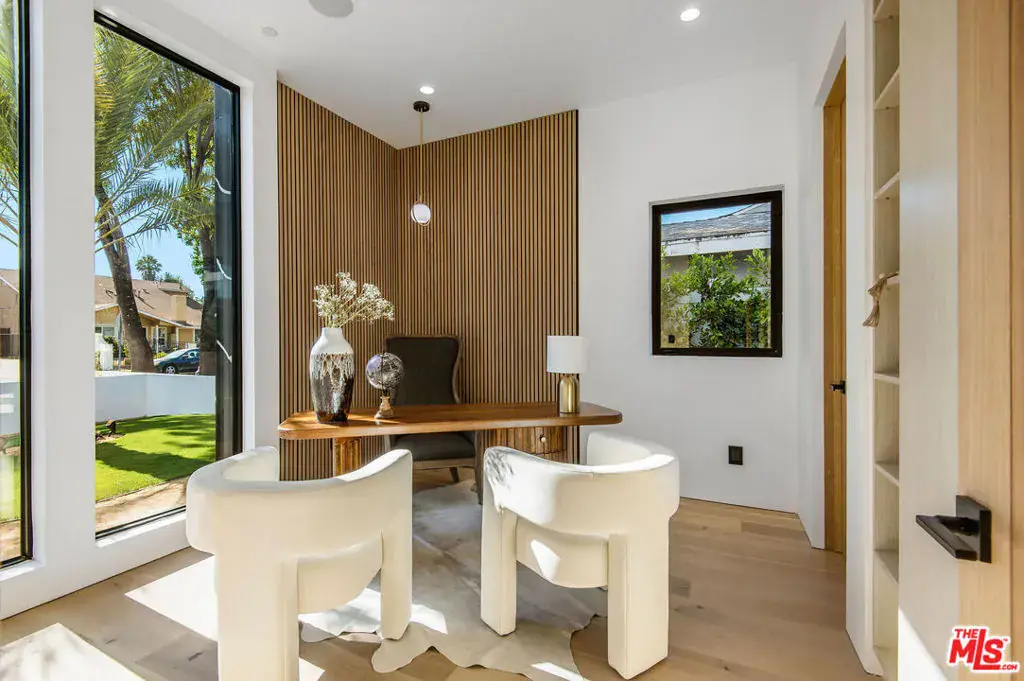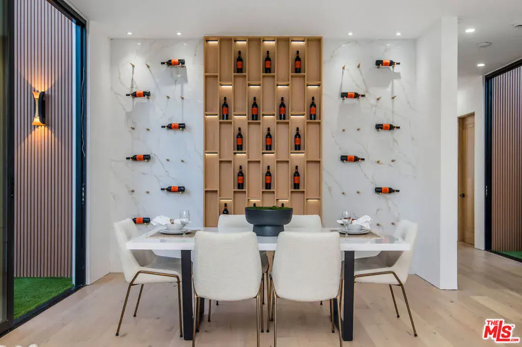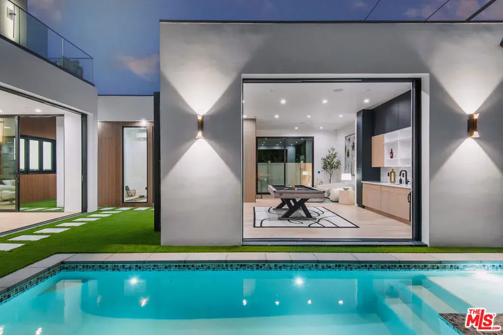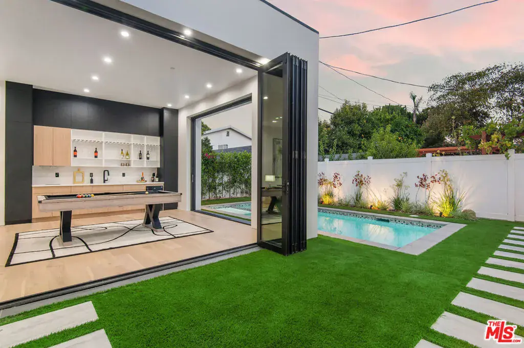 Wonderfully expansive contemporary home uniquely sited south of Ventura Boulevard, close to El Caballero Country Club in an enviable part of Encino. Two stories, with an architectural entry, 5132 Lindley Avenue boasts vast entertainment spaces, many with wood paneled walls and grand moonstone quartz that emulates the impressive exterior entrance. The living room is anchored with a custom-built floor-to-ceiling black and white fireplace, elegant paneling, and banks of modern bespoke doors offering backyard vistas to the pool and family room, a dining area, wine wall, and a beautifully appointed modern chef’s kitchen with Miele appliances, 60″ dual oven range and a generous marble pull-up waterfall island. This bright 5-bedroom, 6-bathroom home, completed in 2024, features a cohesive neutral color palette with unmatched quality throughout, including meticulous stonework, beaded wood panels, bespoke cabinetry, and large windows, complemented by wide-plank light oak flooring. All bathrooms feature intricate marble work and brass fixtures; the primary suite boasts a glass-fronted gas fireplace, marble shelving, a walk-in closet, and a stand-alone bathtub. A second ground-floor vocational space features a private additional living area. Oversized pocket doors lead to the outdoor heated pool and spa, and are surrounded by manicured gardens. Other amenities include wired speakers, a comprehensive security system, and WiFi extenders throughout the home, Apple iPad tablets to control home systems, and two AC units for optimal climate control.