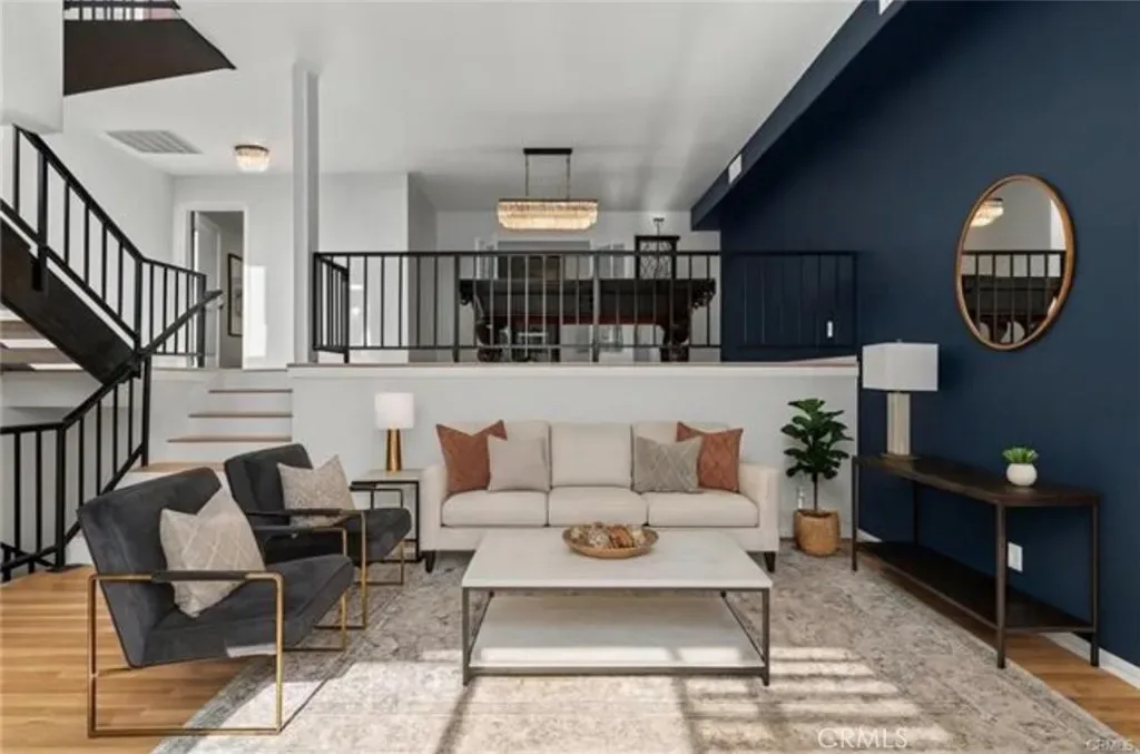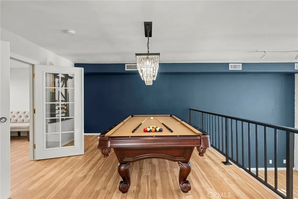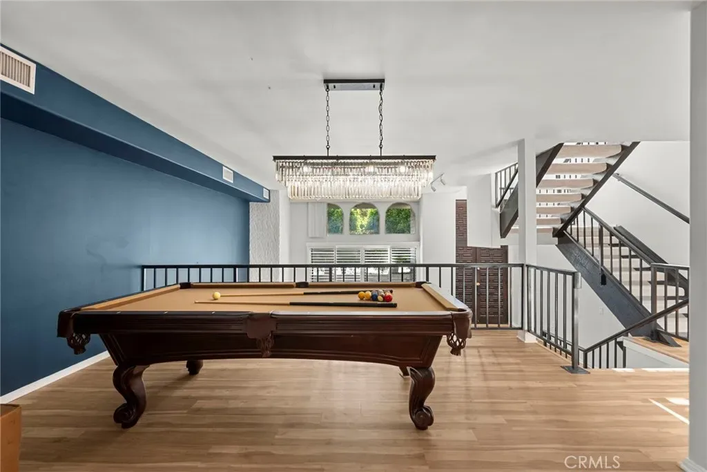 Upgrades & features: brand-new LVP flooring, updated kitchen and baths, $3,000 marble mosaic tile, new plantation blinds, new stair carpeting, smart-home controls, $10,000 earthquake retrofit paid, one shared wall, private entrance, split A/C units (2024), stainless appliances (approx. 2 years old), three crystal chandeliers, pool table, and a hidden door to the third bedroom.