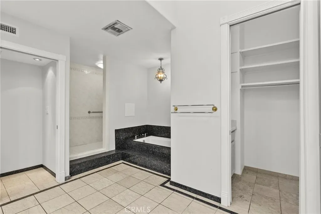 Upstairs, a striking mid-century modern floating staircase leads to three spacious bedrooms. The primary suite is a true retreat with a spa-inspired bath, soaking tub, dual vanities, a dedicated makeup/dressing area, and generous closet space.