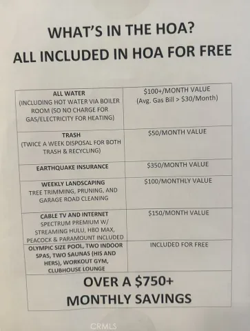 Water (including hot water via central boiler — no gas or electricity charge for heating), trash service, earthquake insurance, weekly landscaping, and Spectrum Premium cable & high-speed internet, including Hulu, HBO Max, Peacock, and Paramount+.