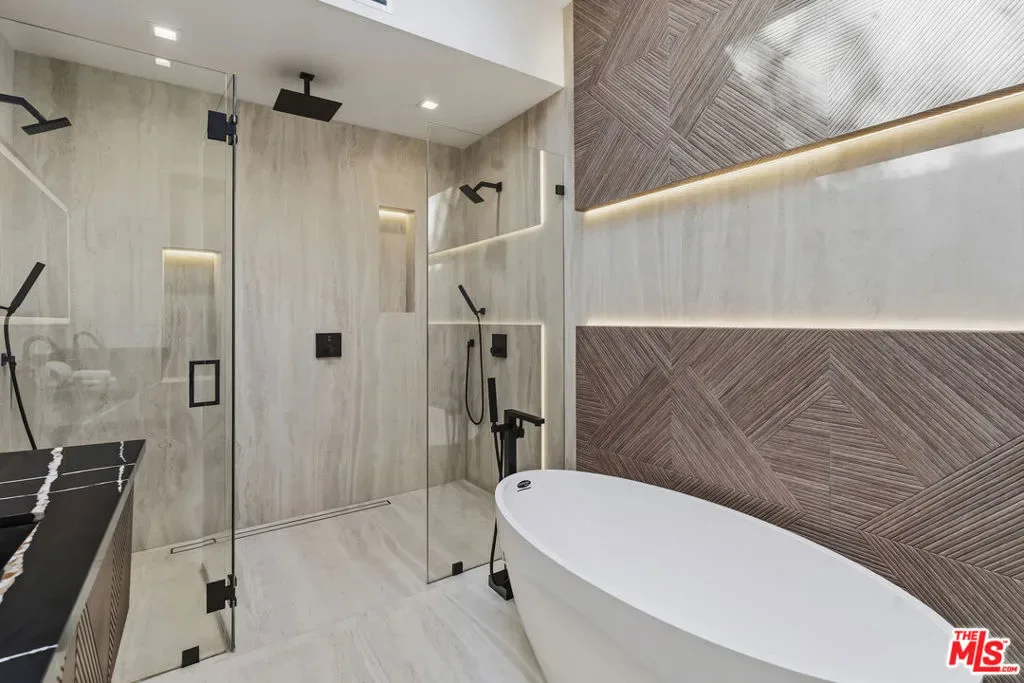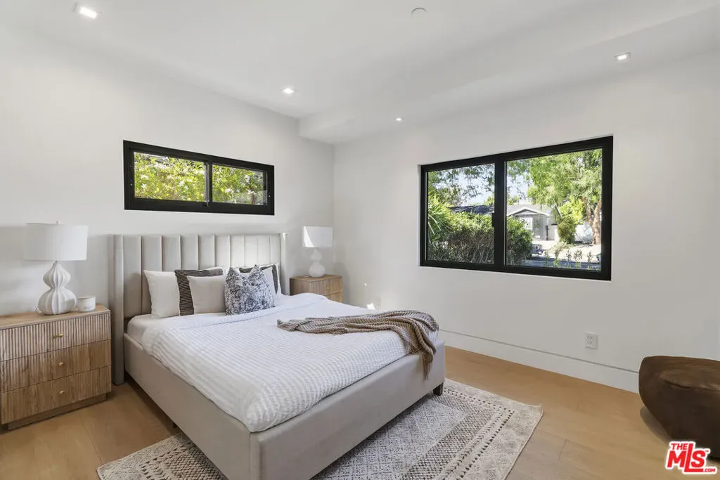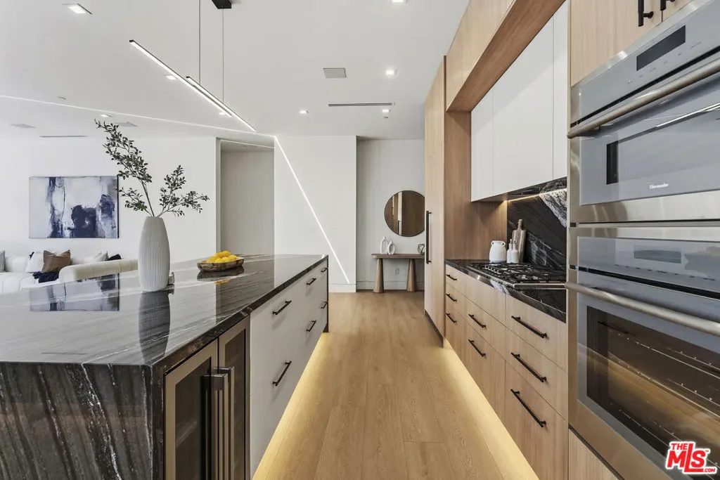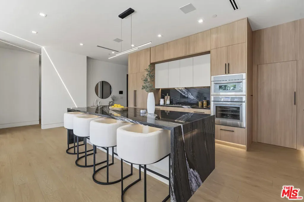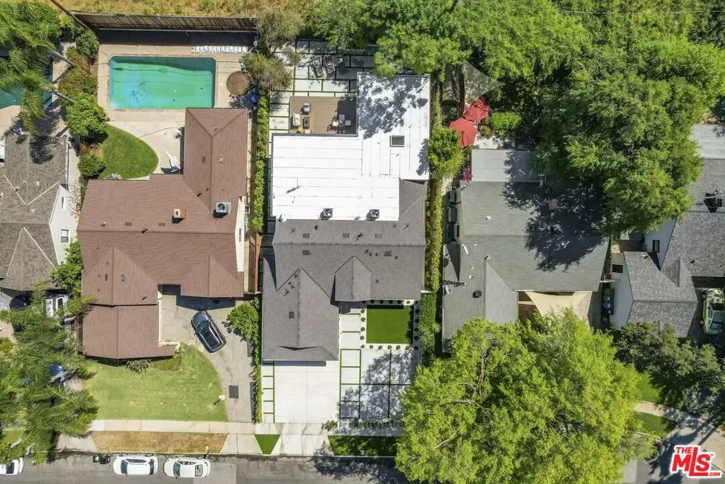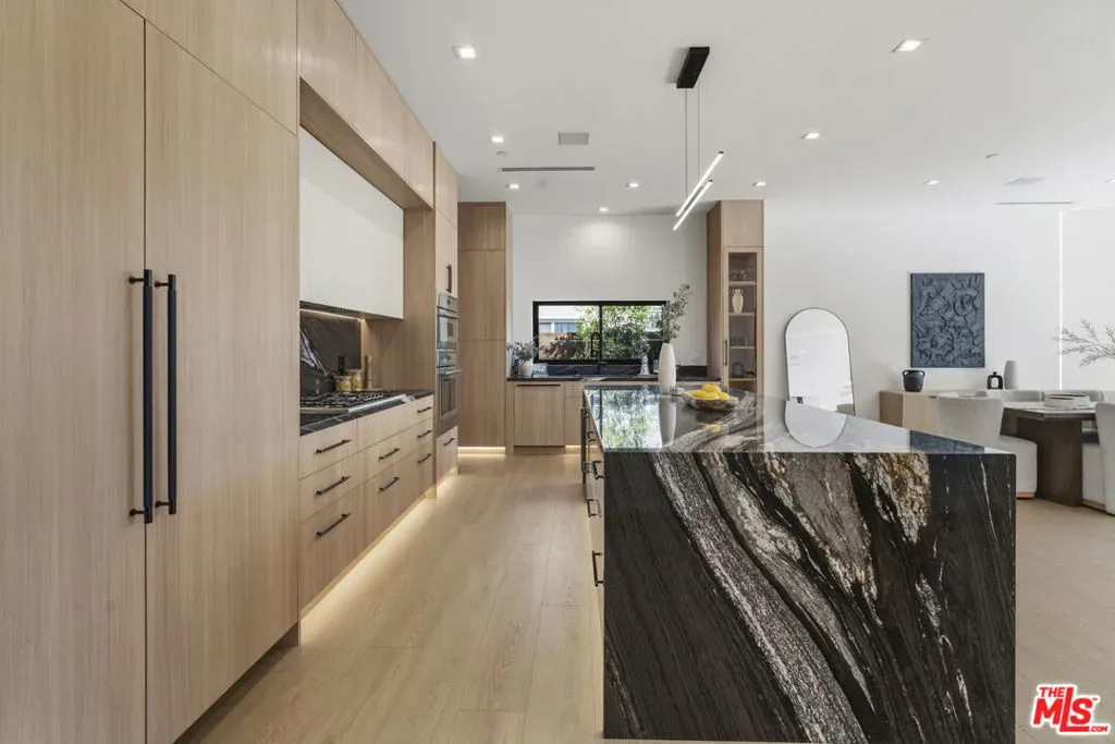 Welcome to this exquisite modern estate in the heart of Encino. This magnificent single-story residence offers 4 bedrooms and 4 bathrooms, thoughtfully designed with elegance, comfort, and seamless indoor-outdoor living in mind. As you step inside, you are greeted by an open-concept floor plan that flows effortlessly from the entryway to the backyard. The chef’s kitchen features custom cabinetry, premium Thermador appliances, a sleek modern island, and a spacious walk-in pantry with direct access to the garage perfect for everyday convenience. The living room is light-filled and inviting, highlighted by expansive sliding pocket doors that beautifully blur the line between indoor and outdoor living. Just off the entry, you’ll find a well-appointed in-law suite complete with its own bathroom and a custom-designed closet ideal for guests, extended family, or a private home office. The primary suite is a true retreat, featuring a luxurious spa-inspired bathroom, a thoughtfully designed walk-in closet, and sliding pocket doors that open to a serene outdoor deck, creating a peaceful and airy ambiance. Two additional bedrooms are conveniently located on the same wing, along with a dedicated laundry area and a stylish powder room. Beautifully landscaped front yard offers great curb appeal with clean modern lines, mature greenery, and a welcoming entry. The private backyard is designed for both relaxation and entertaining, featuring low-maintenance landscaping, ample space for outdoor dining and BBQ, and a serene setting ideal for gatherings or quiet evenings under the stars. Prime Encino location, centrally situated near parks, convenient freeway access, and an array of top dining and shopping options.