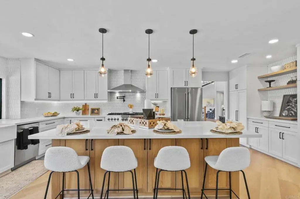Fully renovated 6-bedroom, 4-bath home on a 41,382 sq ft lot in southwest Escondido. Property includes extensive interior and exterior upgrades completed throughout. Interior upgrades include: – New vinyl plank flooring throughout – New baseboards, interior doors, frames, hardware – New electrical wiring, panels, outlets, switches, thermostats, and lighting (120+ recessed lights) – New drywall ceilings and plaster – New chandelier at entry – Custom-built fireplace and custom staircase railings – New AC vents, ducts, and serviced equipment – 5 new windows Kitchen features: – All-new custom oak cabinetry – Quartz countertops – Farm sink, pot filler, new faucet fixtures – New backsplash, garbage disposal – New appliances (stove, range, hood, refrigerator, dishwasher, microwave) – Soft-close hardware Bathroom renovations include new plumbing, tile, glass enclosures, vanities, toilets, fixtures, exhaust fans, and a soaking tub in the main bath. Additional improvements include 1 added bathroom upstairs and 1 added bedroom downstairs. Lower level includes a new second kitchen with custom oak cabinets, electric stove, dishwasher, farm sink, soft-close hardware, faucets, disposal, and new washer/dryer. Additional interior upgrades include new water heater, custom built-in linen closet, and new garage drywall and epoxy flooring. Garage includes new doors, rails, openers, and controls. Exterior upgrades include: – New asphalt driveway – New exterior lighting fixtures – New tiled entry walkway and columns – New landscaping, grading, mulch, irrigation system, and over 70 new perimeter trees – New wooden fencing, new under-deck iron fencing – Resurfaced patio flooring – Refreshed shingle roof – Serviced septic system Pool area includes: – New pool plaster and tile – New pool equipment (pump, heater, etc.) – New handrails – Updated BBQ area with new grill, tile, and doors Garage accommodates up to 5 vehicles and includes dual EV charging. Property has potential for gated entries on both sides and includes plans for a future ADU. Lower level can be configured as a separate approx. 1,200 sq ft 2-bed/1-bath unit. Located near Lake Hodges and area hiking trails.