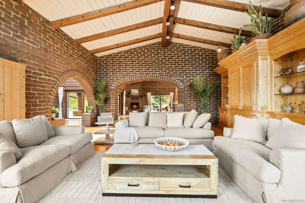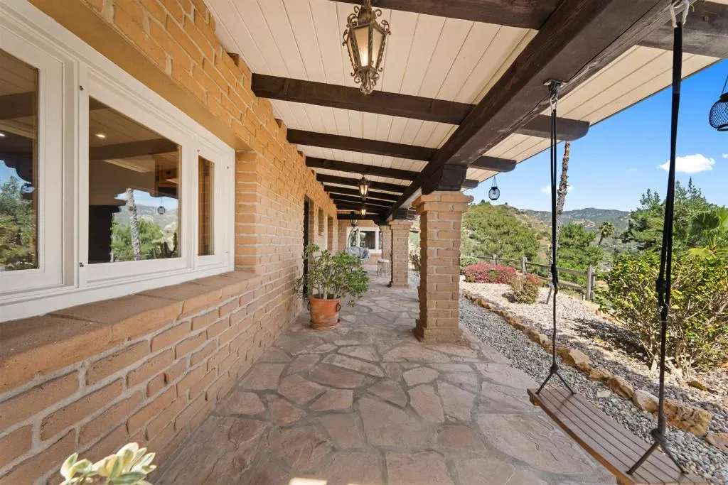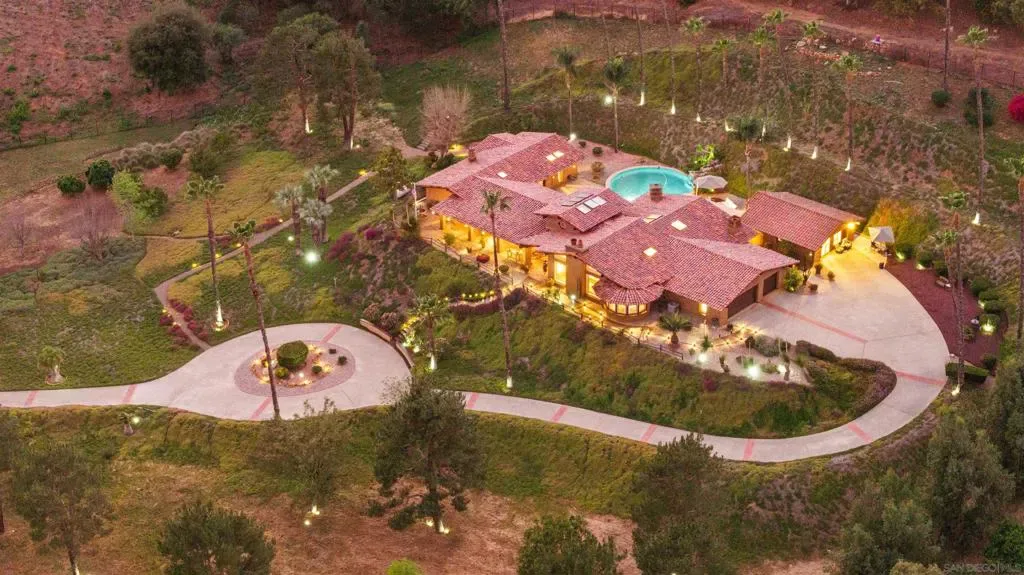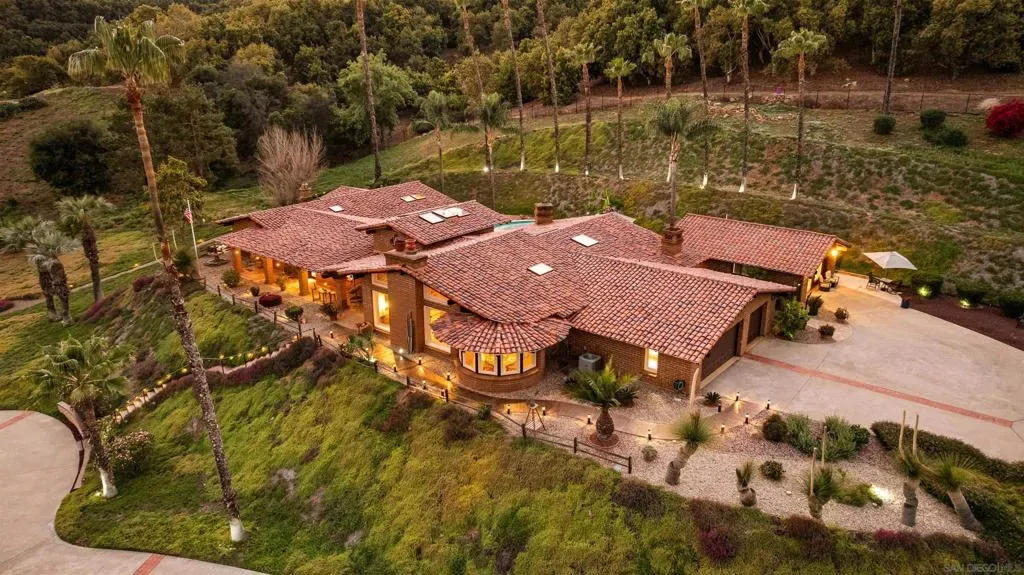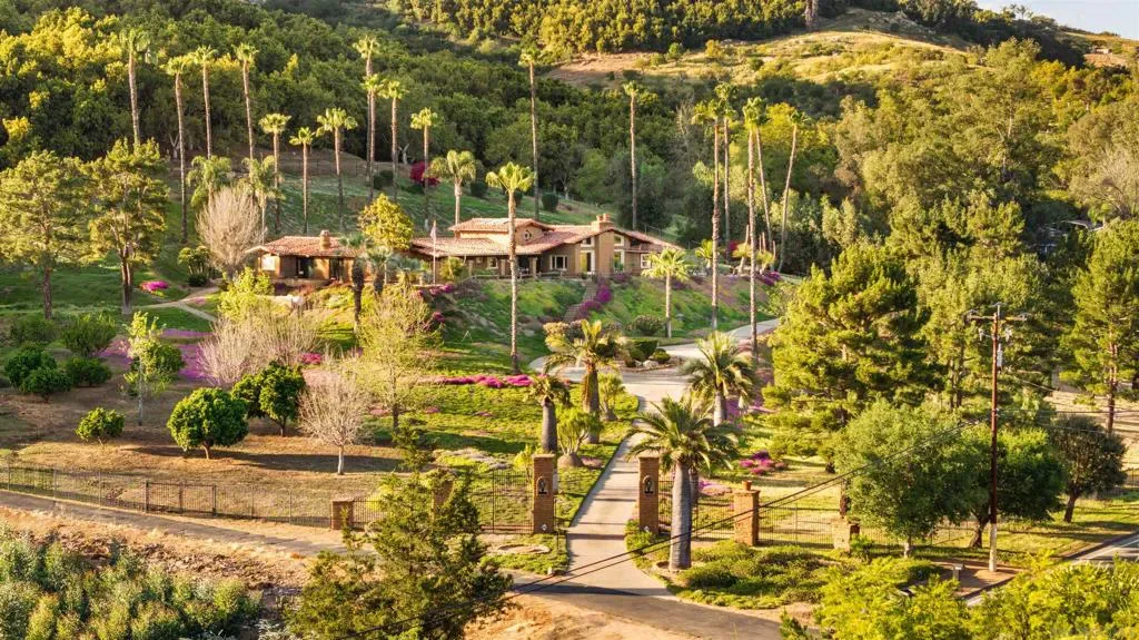 Perched atop a private hillside, this exceptional Spanish-style Adobe estate offers sweeping panoramic views and ultimate privacy on approximately 4.55 acres of beautifully usable land—a rare blend of scale, serenity, and functionality. A long, winding driveway leads through a gated entrance to a warm and inviting residence surrounded by lush landscaping, mature palms, and thoughtfully designed lighting that creates a stunning ambiance at sunset. Designed in timeless Spanish Mission style, the home features authentic adobe construction, clay tile roofing, soaring ceilings, exposed wood beams, and rich architectural details. Expansive windows fill the interior with natural light, highlighting multiple living areas and fireplaces, perfect for both everyday living and entertaining. The open-concept kitchen flows seamlessly into the main living and dining areas, creating an ideal indoor-outdoor California lifestyle. Step outside to expansive grounds with breathtaking sunrise and sunset views, offering space for entertaining, relaxation, or future enhancements. A detached garage provides flexible use as a workshop, studio, or additional storage. The property includes generous flat, usable land with potential for an ADU or additional structures (buyer to verify), ideal for multigenerational living or investment. Recent improvements include a refreshed pool with new equipment, upgraded water heater, refinished flooring, updated bathrooms, new perimeter fencing, enhanced landscaping, and a professionally serviced roof. A rare opportunity!