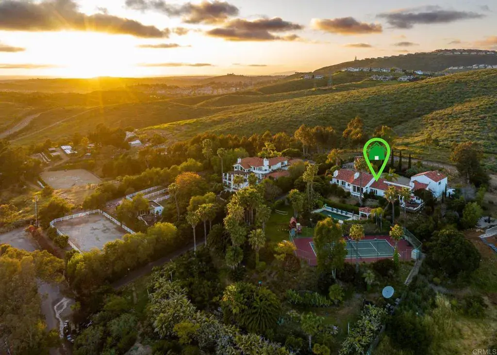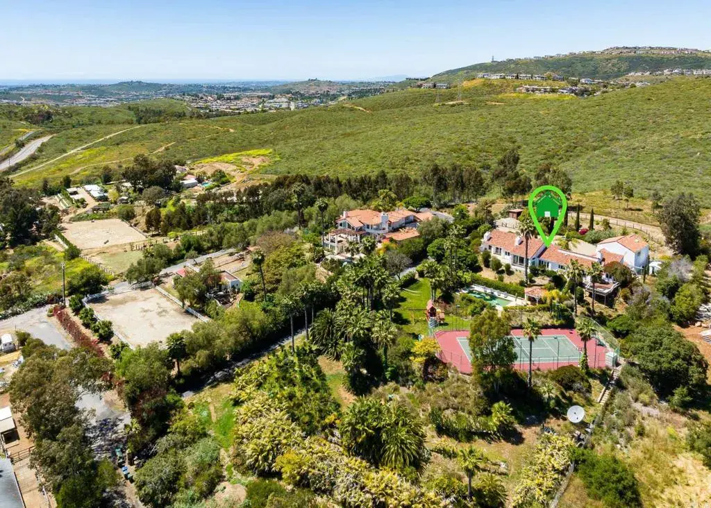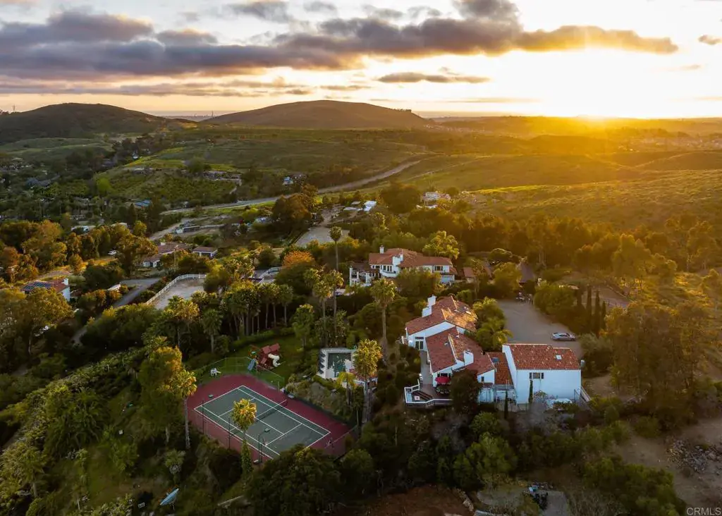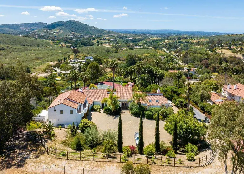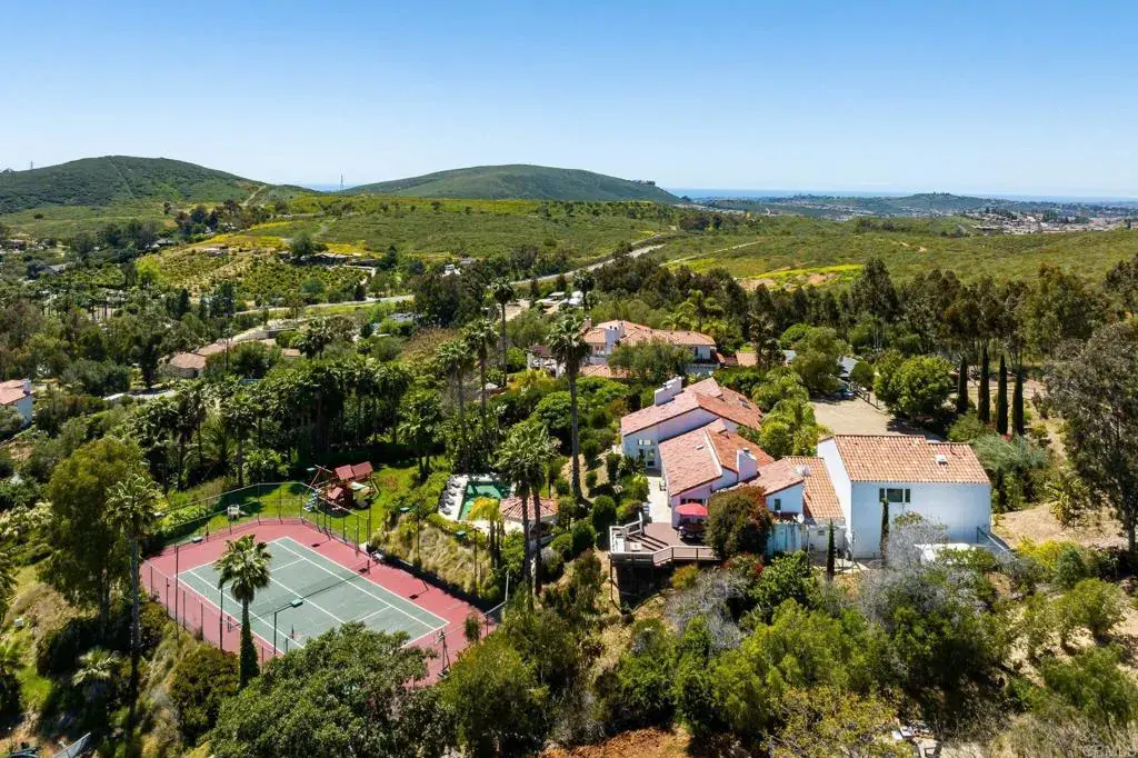 Set atop a quiet hillside in the Elfin Forest community of San Diego, this gated California Mediterranean style estate is situated on 2.5 gently sloped acres and offers broad views over surrounding natural open space and the region beyond, creating a private estate setting. The property overlooks miles of protected coastal chaparral & the trail system of Sage Hill Nature Reserve, contributing to preserved surroundings and limiting neighboring development. The home enjoys an elevated outlook spanning a wide portion of San Diego, with distant views of the La Jolla are skyline. The setting provides an expansive perspective over the preserved land and surrounding communities. The estate includes a heated swimming pool, a lighted tennis court, lawn areas, a playground structure and mature landscaping throughout the grounds. The property also features a variety of established citrus trees. With its acreage, layout and access, the property also offers potential equestrian use. Located approximately 8 minutes from the shops, dining and services of San Elijo Village and within a resonable driving distance to North County beaches, The property is also located within the attendance area of the Roger Rowe K-8 public school district of Rancho Santa Fe. This property presents a rare opportunity for a gated estate with acreage, views and immediate proximity to designated open space in one of North County’s most majsetic and sought after hillside communities.