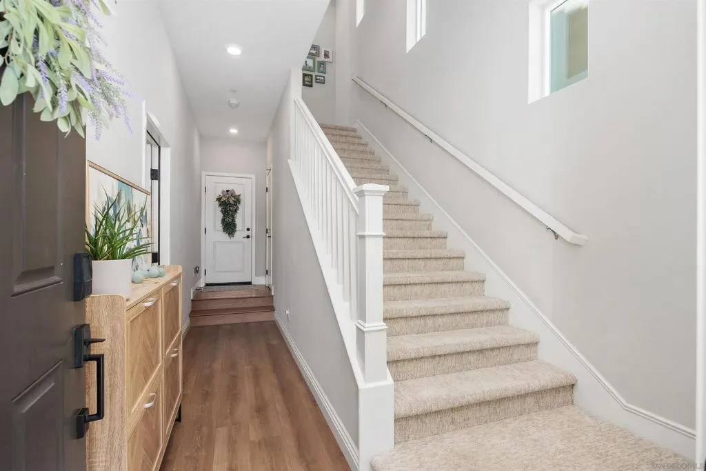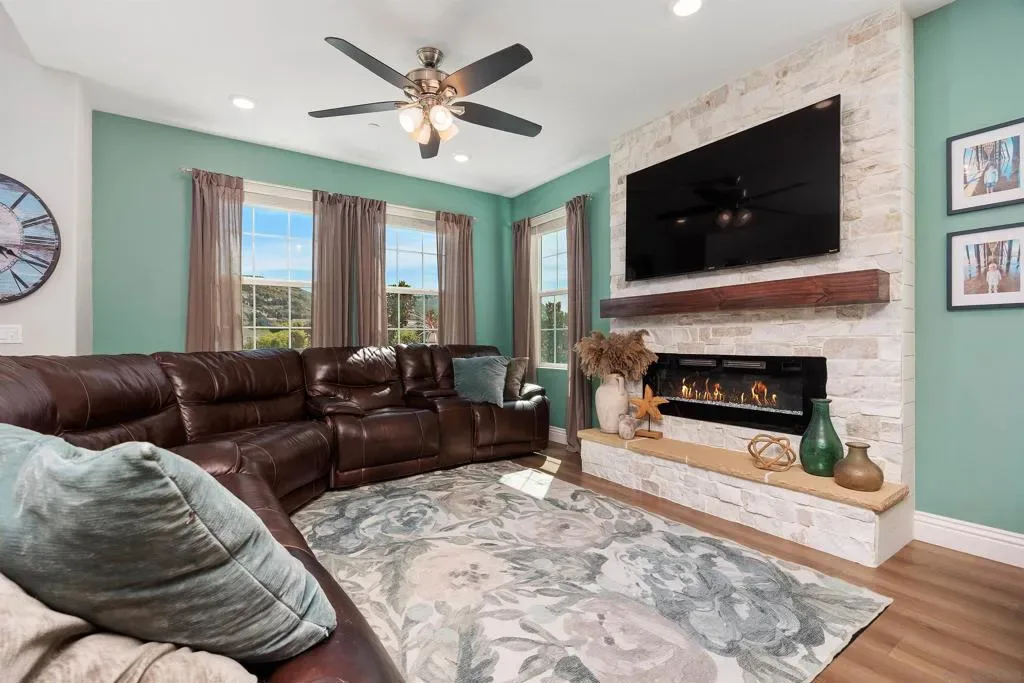 Stunning home in Harmony Grove Village, perfectly positioned with serene park views. Thoughtfully designed with high-end finishes and custom upgrades throughout. Brand-new luxury vinyl plank flooring. Stylish electric fireplace with a striking stone accent, creating a warm and modern living space. The versatile first-floor room provides the perfect flex space ideal for a home office, hobby room, or an optional 4th bedroom. Enjoy indoor-outdoor living with an upper patio and spacious side patio with a grass yard. The oversized garage features high ceilings and abundant storage space. Owned solar. Owned whole house water softener/chemical treatment system.