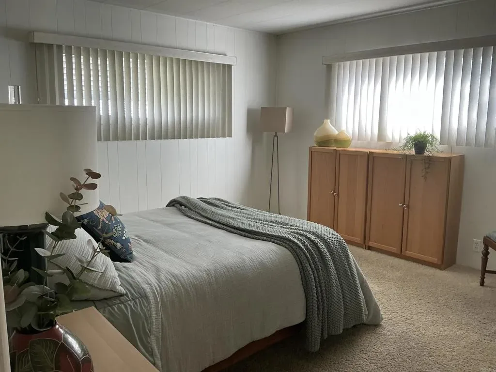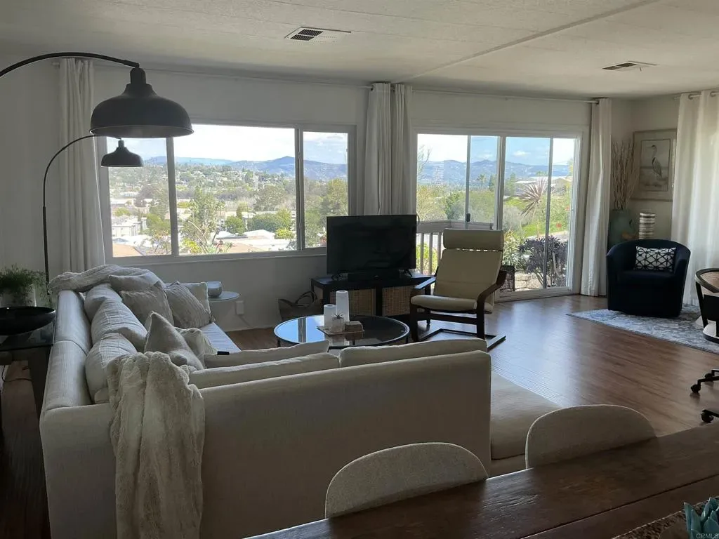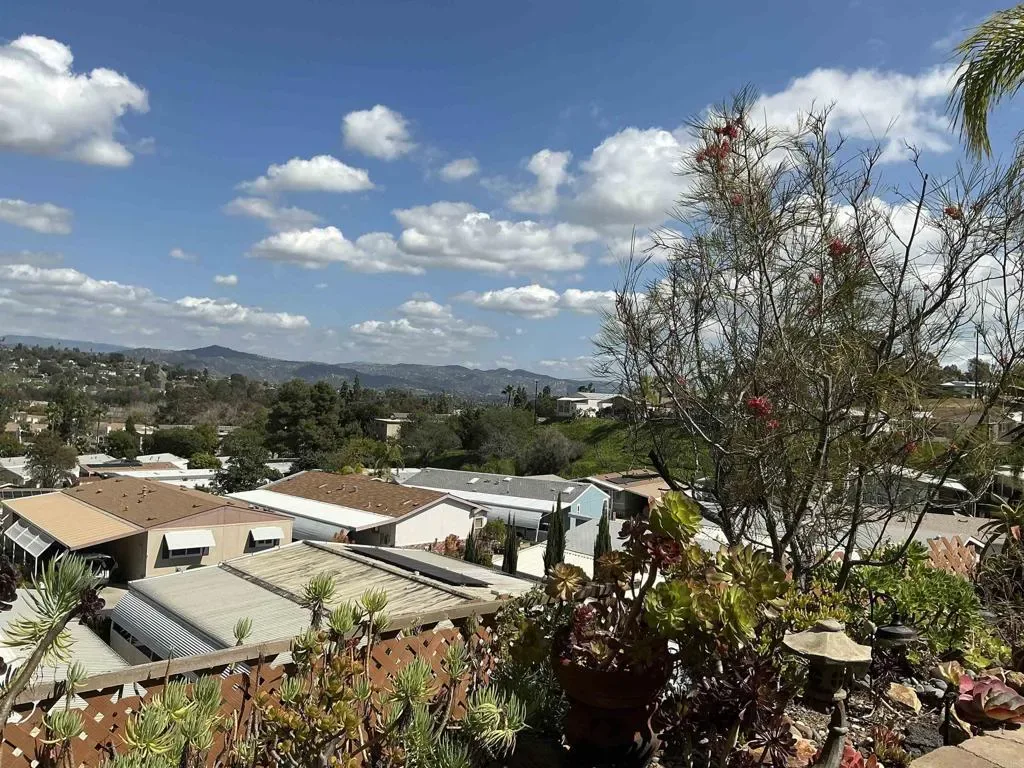 Incredible views! Fabulous lot! Such a charming property, the home is open and airy and inviting! AND a breathtaking view from the living room large windows, and sliding glass door to outside. When outside, soak in the outdoor living and entertaining area that is peaceful and serene. A short wall surrounds the L- shaped concrete patio with lovely landscaping of schrubs and succulents. These frame the panoramic views of the hills from east to west. Inside, beautiful wood laminate plank floors in the living area, all walls are painted white for a fresh, airy feel. All windows are dual pane white vinyl. Both baths have designer sinks/cabinetry & mirrors. Primary bedroom has a separate dressing area w/mirrored wardrobe, built in dressing table & cabinet with drawers. Widened driveway w/ curved carport supports.