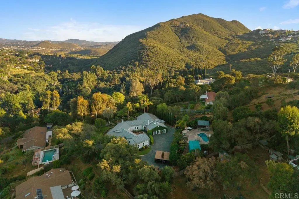 Welcome to 713 Quiet Hills Farm Road, a truly extraordinary and storied estate tucked into the highly sought-after Lake Hodges community, where timeless architecture, rich local history, and an unforgettable setting come together on nearly two acres of beautifully usable land. Originally built in 1935 by renowned author Harold Bell Wright and later owned by Reuben H. Fleet, this single-level farmhouse estate blends character and legacy with the comforts and design today’s buyers crave. Thoughtfully remodeled in 2017, with additional enhancements to the carriage house and office completed in 2020, the property has been carefully curated for modern living. Set behind a gated entrance and approached by a long, private, tree-lined driveway, the home offers a peaceful, secluded setting just minutes from I-15, dining, and everyday conveniences. Spanning approximately 4,448 square feet (plus an additional 400-square-foot loft), the residence features 5 bedrooms and 4.5 baths, all on one level. Classic farmhouse charm is paired with refined finishes and warm, inviting spaces designed for both entertaining and everyday comfort. At the heart of the home is a chef’s kitchen featuring dual Thermador ovens, a six-burner Thermador range, Sub-Zero refrigerator/freezer, Bosch dishwasher, and KitchenAid wine refrigerator. The kitchen opens seamlessly to expansive living areas and a central courtyard, creating easy indoor-outdoor flow. Large, light-filled rooms connect effortlessly to the surrounding grounds. Designed for gathering and making memories, the home offers a thoughtful collection of amenities including a temperature-controlled 120-bottle walk-in wine cellar and five historic cellars that add both charm and function. Outdoors, the estate is both beautiful and highly usable. A resort-style saltwater pool anchors the space, complemented by a gorgeous poolside cabana with an outdoor kitchen and dedicated entertaining area. Mature landscaping, curated gardens, and expansive improvements create a setting that feels lush, private, and serene. Owned solar for both the home and pool, energy-efficient systems, rainwater collection, and high-end synthetic turf with a custom wraparound mini-golf course add both sustainability and fun. Included in the sale is the adjacent 0.74-acre parcel (APN 270-261-30-00), bringing the total to approximately 1.87 acres of usable land. With over 40 mature fruiting trees, dual access, and potential for an ADU or second residence, the property offers exceptional flexibility, privacy, and long-term value. An attached carriage house has been transformed into a character-rich entertaining space and bar, with a spiral staircase leading to a 400-square-foot loft (not included in the main square footage), ideal for guests, recreation, or creative use. Every corner of the property supports both large gatherings and everyday moments—morning coffee in the courtyard, afternoons in the garden or greenhouse, and evenings spent outdoors. From neighborhood parties and garden afternoons to greenhouse harvests and year-round fruit from the orchard, the lifestyle here is as rich as the setting itself. Located in a community known for its quiet, serene landscapes and close-knit feel, where neighbors gather for holiday celebrations and seasonal traditions. This is a once-in-a-lifetime opportunity to own a home with deep history in one of North County’s most sought-after communities—where privacy, character, and connection come together in a way that is truly rare. Welcome home.