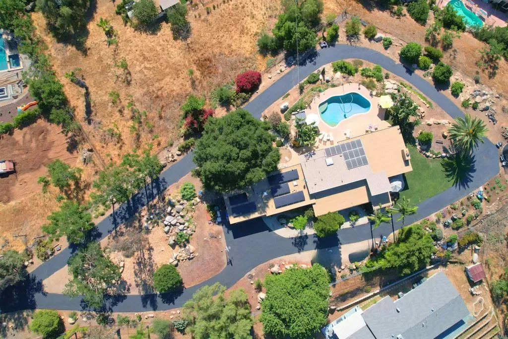 Set atop high ground, completely unobstructed by neighbors, this private one-acre estate showcases panoramic, sunrise-to-sunset views over the San Pasqual Valley and surrounding hills, redefining resort-style living in Southeast Escondido. Tucked away on a tranquil private street with minimal traffic, a grand circular driveway sets the tone for arrival. The fully usable, lushly landscaped grounds feature a thriving vegetable patch, mature fruit trees along with a variety of other established trees, and a level, buildable pad that captures the same breathtaking valley views offering limitless potential for future expansion. Designed for the ultimate entertainer, the backyard centers around a sparkling pool and spa, positioned perfectly against the horizon to deliver a serene, infinity-edge experience. Inside, the sweeping scenery follows you from room to room across a highly versatile floor plan where every bedroom enjoys the privacy and luxury of an ensuite bath. The layout further elevates itself with a unique third-bedroom wing complete with its own private kitchenette, an ideal setup for multigenerational living, a seamless guest suite, or an income-producing ADU. This is a rare opportunity to secure an exclusive, view-rich retreat where space, versatility, and natural beauty seamlessly converge. Words simply cannot do this estate justice; it is a property you must see and feel in person.