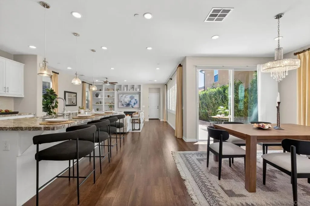 Welcome to sought-after Harmony Grove Village, where comfort, convenience, and community come together. This home offers a thoughtfully designed layout ideal for everyday living. The kitchen features a large center island with bar seating, stainless steel appliances, and ample storage, flowing seamlessly into the open-concept living and dining areas—perfect for both relaxing and entertaining. Custom built-ins enhance the dining room, living room, and primary bedroom closet, adding both style and functionality. The main level also includes luxury vinyl flooring and a convenient powder room for guests. Step outside to a private, easy-care patio space, ideal for outdoor dining. Upstairs, the spacious primary suite includes a walk-in closet and dual sink vanity. Two additional bedrooms share a Jack-and-Jill bathroom with dual vanities, offering both functionality and privacy. A dedicated laundry room with storage and an attached two-car garage provide added everyday convenience. Additional highlights include a water softening system and a sprinkler system, adding to the home’s efficiency and ease of maintenance. Residents of Harmony Grove Village enjoy access to community pools, spa, parks, playgrounds, BBQ areas, and miles of scenic walking and biking trails. A great opportunity to own in one of North County’s most popular planned communities!