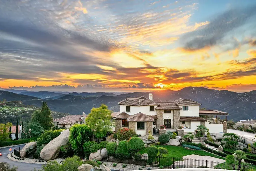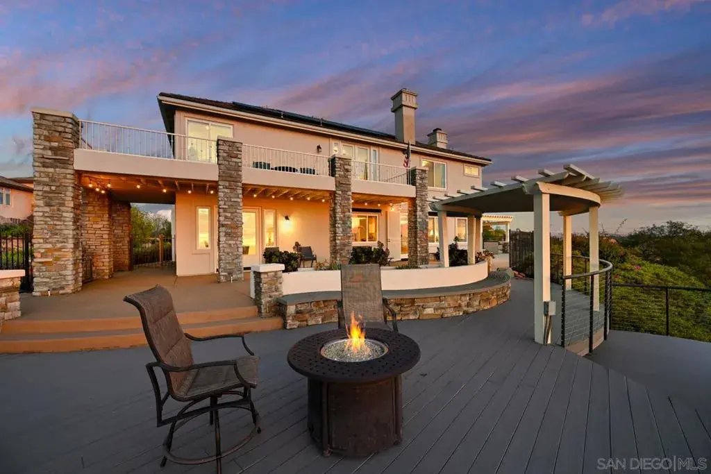 The ultimate blend of luxury, views, and privacy awaits in this custom Rimrock Estate. Nestled on an approximate 2/3 acre cul-de-sac lot atop the hillside in the prestigious, guard-gated community of Rimrock in North Escondido’s Hidden Meadows area, this exquisite property boasts absolutely breathtaking, panoramic views of the ocean, Catalina Island, rolling hills and valleys, with desirable Southwest/West exposure. The luxurious interior, estimated at 3,800 square feet, features a grand ambiance with custom interior design and architectural details throughout. A dramatic, two-story foyer showcases a stunning sweeping wrought iron staircase and soaring ceilings. Details include elegant crown molding, premium vinyl plank floors, plush carpeting, and custom window treatments. The home is equipped with a central vacuum system, and energy-efficient windows, water softener and solar power system (leased). The gourmet kitchen is a chef’s delight, complete with granite counters, top-of-the-line appliances including a Sub-Zero refrigerator/freezer, a center island, and a professional-grade six-burner stainless steel range beautifully accented by maple cabinets with a pecan stain. The home offers 5 bedrooms (including one downstairs) and 4.5 bathrooms, plus 3 fireplaces. The primary suite provides access to a large view deck and features a dedicated office/library/retreat area with wrap-around fireplace. The private, tranquil outdoor oasis is an entertainer’s dream, a tiered backyard with multiple view patios, and a private spa with a covered patio.