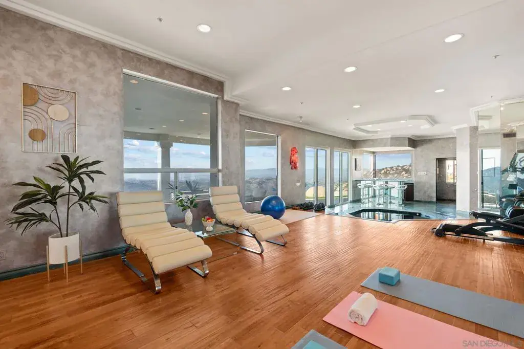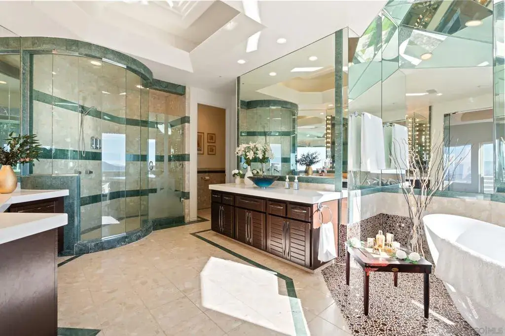 Sat high above the clouds within the guard-gated enclave of Rimrock Estates, this extraordinary 7,000+ square foot home is enviably positioned on a 3.25 acre parcel that preserves unobstructed, panoramic vistas stretching all the way to the ocean. Designed to celebrate light, scale, and scenery, massive windows frame the picturesque views while flooding the interior space with natural light. This property is a true example of a masterclass in craftsmanship, featuring Spanish Rojo Alicante stone, high-gloss solid cherry wood kitchen cabinetry, Arabescato marble sourced from the Carrara region of Tuscany, imported Jerusalem Gold limestone, and so much more. Soaring 25-foot ceilings in the living and dining rooms create a dramatic yet refined sense of arrival. Outdoor living features an infinity-edge pool showpiece with custom surfacing intended to resemble the ocean floor, expansive covered patios, and ample seating areas ideal for both grand entertaining and quiet moments above it all. Interior living is equally compelling, featuring a wellness retreat completely outfitted with an indoor jacuzzi, sauna, steam room, and fitness area. Notable upgrades include three whole-house fans, a four-zone HVAC system with new ducting, a newer roof with hand-crafted Baja clay tiles, a 400-amp electrical panel with three subpanels, and 48 fully owned Samsung solar panels providing more than enough energy one could possibly need. This is elevated living at its finest, both figuratively and literally.