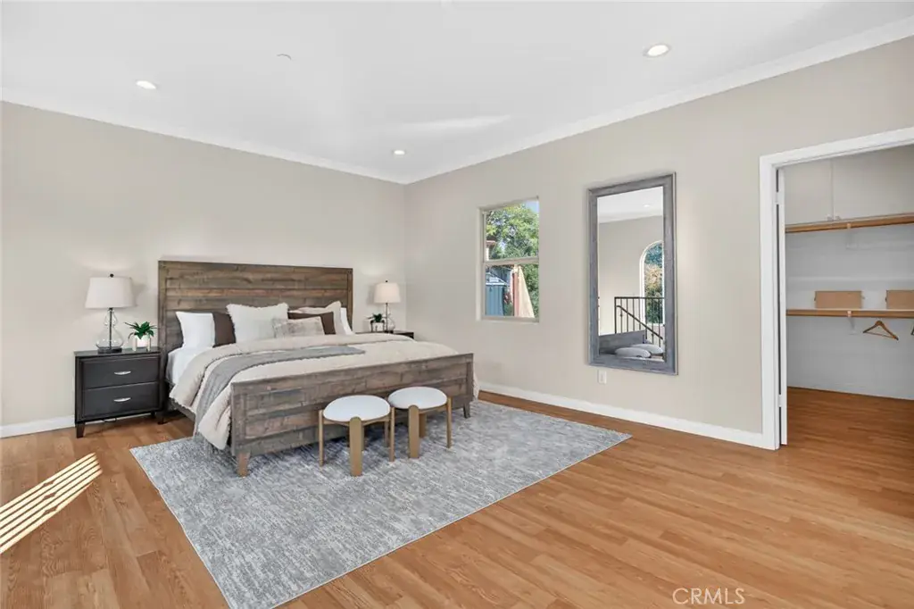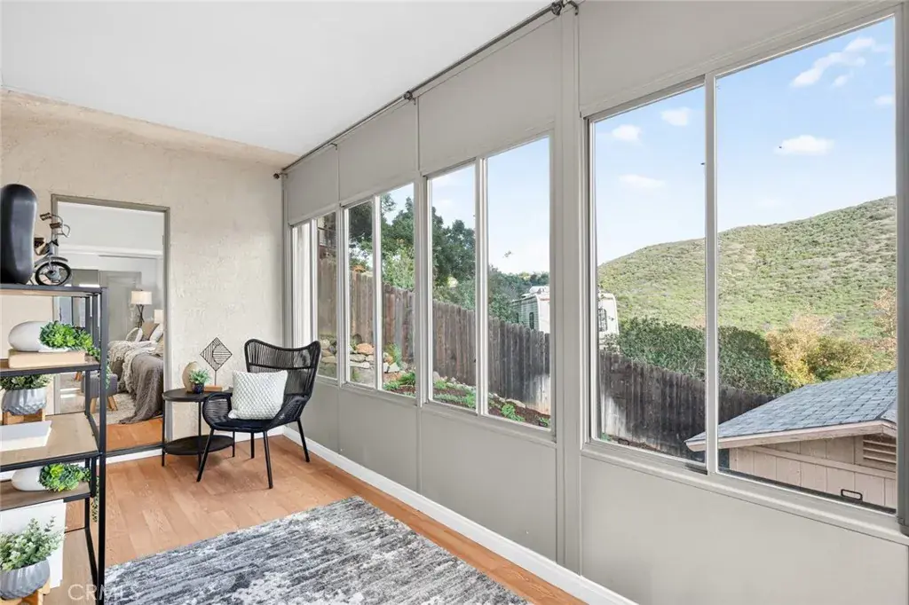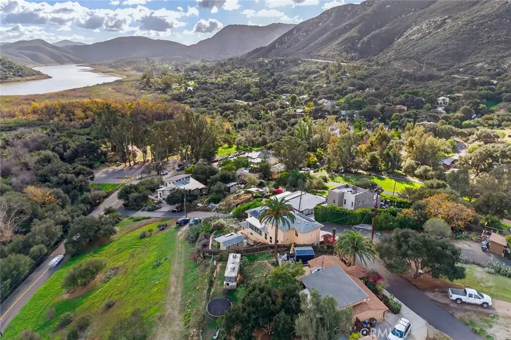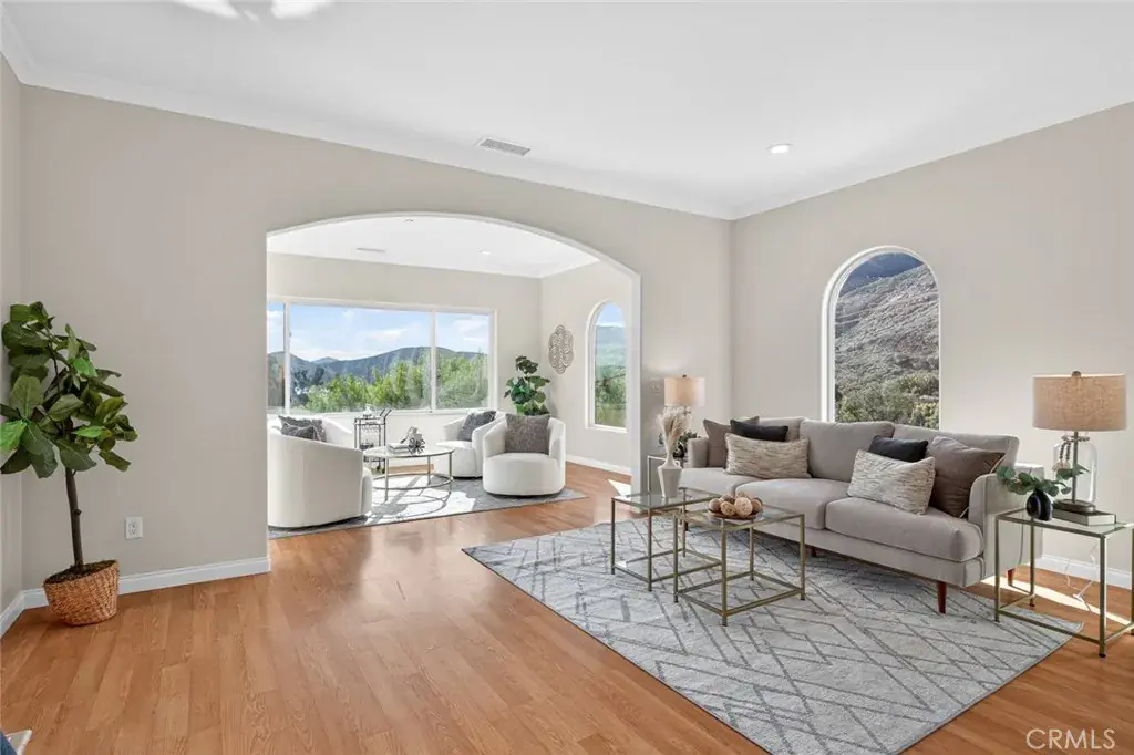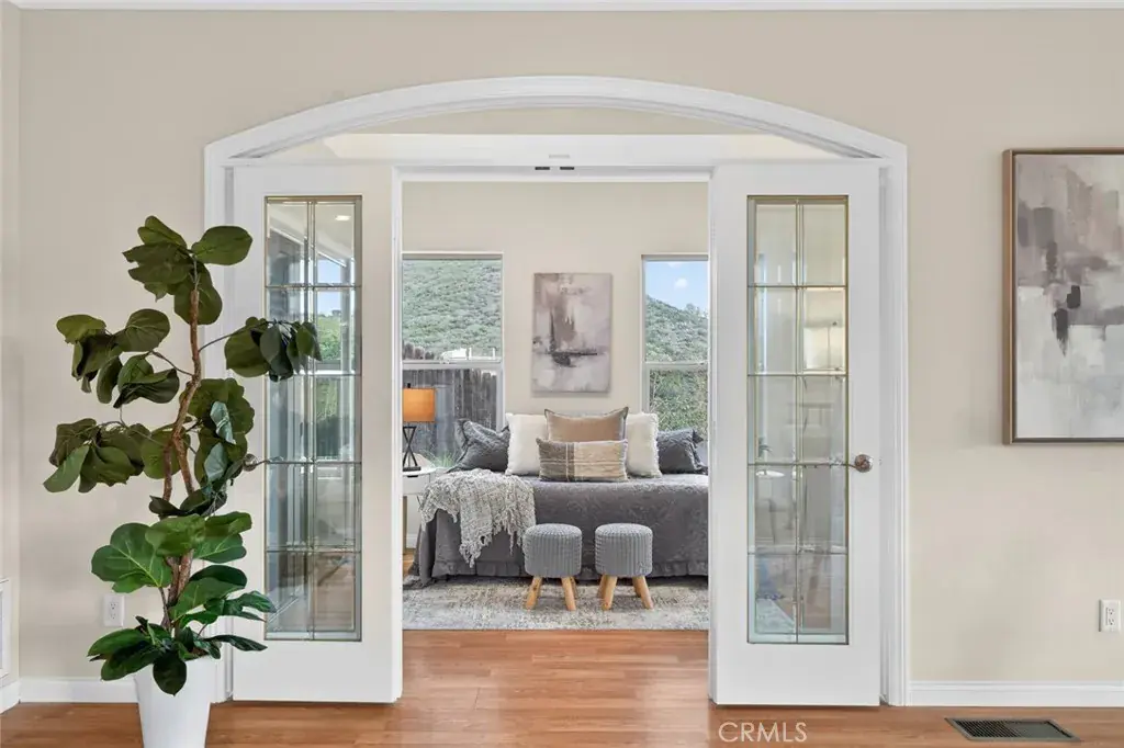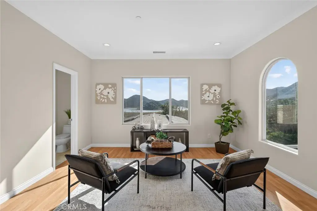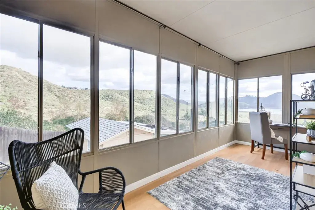 Enjoy sweeping views of Lake Hodges from this light-filled hillside home set in a quiet, nature-rich setting just minutes from everyday conveniences. Large windows bring the outdoors in, while thoughtful architectural details include crown molding, arched doorways, recessed lighting, and a cozy fireplace.