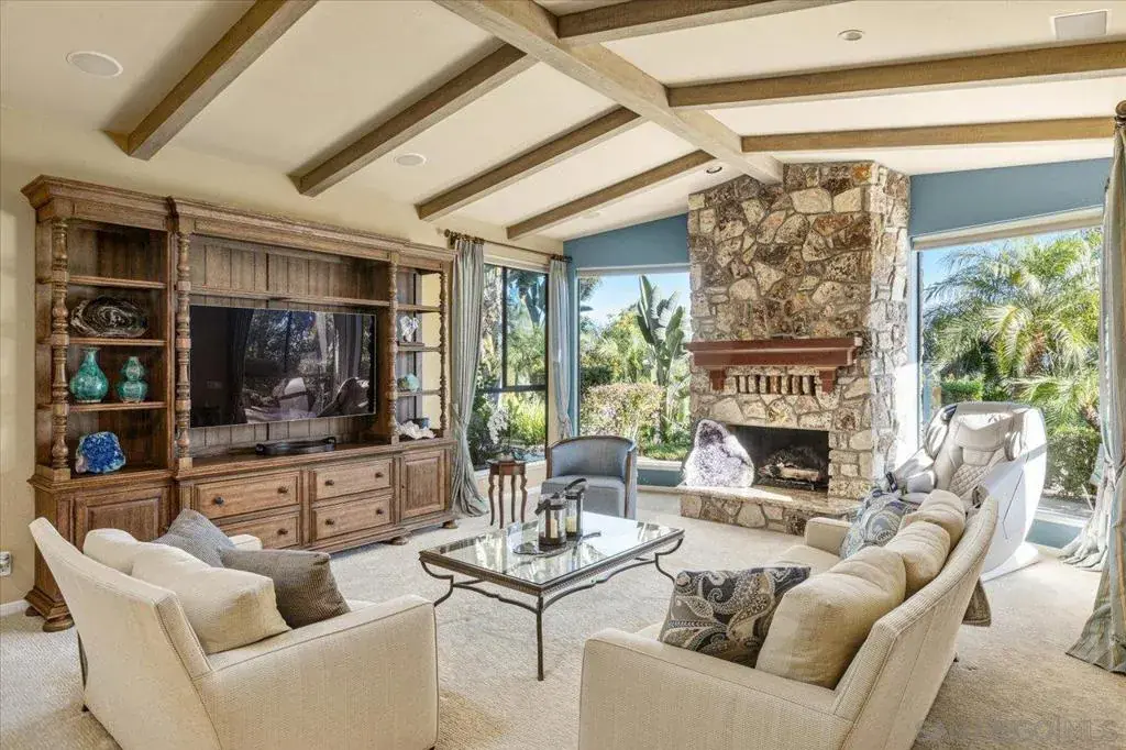 Welcome to this remolded sanctuary of sophistication in West Escondido. This gated estate blends timeless design with modern luxury, offering a lifestyle of serenity, beauty, and effortless entertaining. From the moment you arrive, the circular driveway and lush gardens set a gracious tone. Beveled glass doors open to a sunlit interior where vaulted ceilings and travertine floors lead to a living room anchored by a dramatic stone fireplace and panoramic views of nature. Designed for gatherings, and fun… See Supplement A circular drive leads to a stunning entry framed by lush landscaping and beveled glass doors. Inside, vaulted ceilings, travertine floors, and a dramatic stone fireplace define the living room. The formal dining room opens to the pool via folding glass doors and features custom built-ins. The kitchen includes a butcher block island, Miele coffee station, breakfast nook, pantry, and pass-through window to the patio. Adjacent is a spacious laundry room with ample cabinetry. The home offers 5 bedrooms, including a luxurious owner’s suite with walk-in closet, spa-like bath, and an attached office with built-ins. Outdoor amenities include a 38’ lap pool, raised spa, fire-and-ice features, private cabana, putting green with sand trap, and a 23×19 ft gazebo with granite counters, BBQ, heaters, fans, and TV. Fruit trees, rose garden, scenic walkway, and night lighting complete the resort-style grounds. Epoxy-floored garage with LED lighting and storage. A rare opportunity for refined living. The kitchen is both warm and functional, with a butcher block island, Miele coffee station, breakfast nook, and pass-through window to the patio. A spacious laundry room adds everyday ease. The owner’s suite is a retreat unto itself, with a spa-inspired bath, walk-in closet, and an adjoining office with granite counters and built-ins. Three additional bedrooms offer comfort and privacy. Outside, the grounds unfold like a private resort: lap pool, raised spa, fire-and-ice features, putting green, cabana, and a fully equipped gazebo with scenic walkway. Fruit trees, a rose garden, and curated lighting complete the ambiance. This is more than a home—it’s a destination.