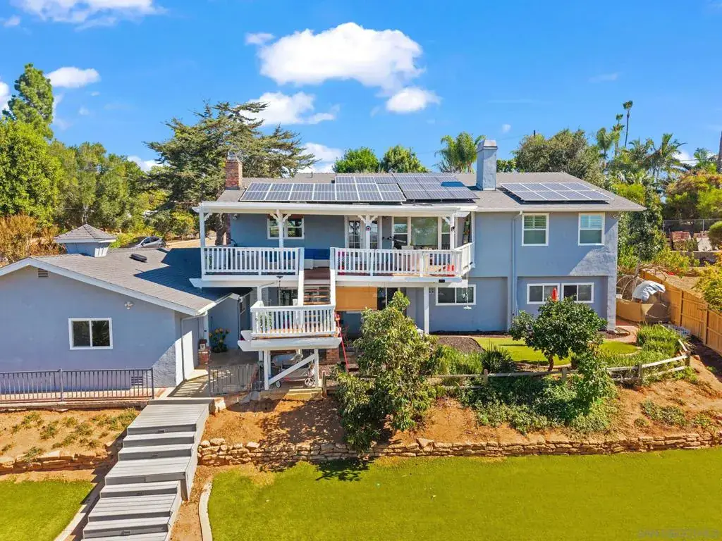 Welcome to luxury powered by 68 OWNED solar panels, including 3 Tesla power walls. Unparalleled elegance, sustainability and self-sufficiency are nestled in the hills of South Escondido delivering modern comfort while keeping operating costs remarkably low. With 5,368 sq.ft including an attached ADU, this palace is meticulously designed with living space ideal for family function & entertainment. A massive granite island highlights the open-concept kitchen which flows effortlessly into the upper-level living area where a 400+ sq. ft. covered terrace is the perfect spot to unwind with panoramic sunset views. The primary suite has striking vaulted ceilings with exposed beams, a spacious walk-in closet, and a luxurious spa-inspired bath ideal for relaxing. Additional bedrooms are thoughtfully placed on both levels. The lower level boasts a fully equipped ADU with private exterior access, a full kitchen, living room, an en-suite bath, laundry utilities, and it’s own outdoor area—ideal for generating income and/or multi-generational living. Exposure from the west side bathes the property in natural light & delivers breathtaking sunsets. The massive lot is highlighted by numerous fruit-bearing trees including Macadamia, Avocado, Pomegranate, Orange, Lemon, and more along with thriving grapevines—creating a private orchard retreat. Adding to it’s charm, the estate is home to six hens that produce over two dozen eggs weekly, enhancing the self-sustaining lifestyle. With a fully fenced & heated pool & spa, turf lawns, and a charming playhouse, this property is truly extraordinary!