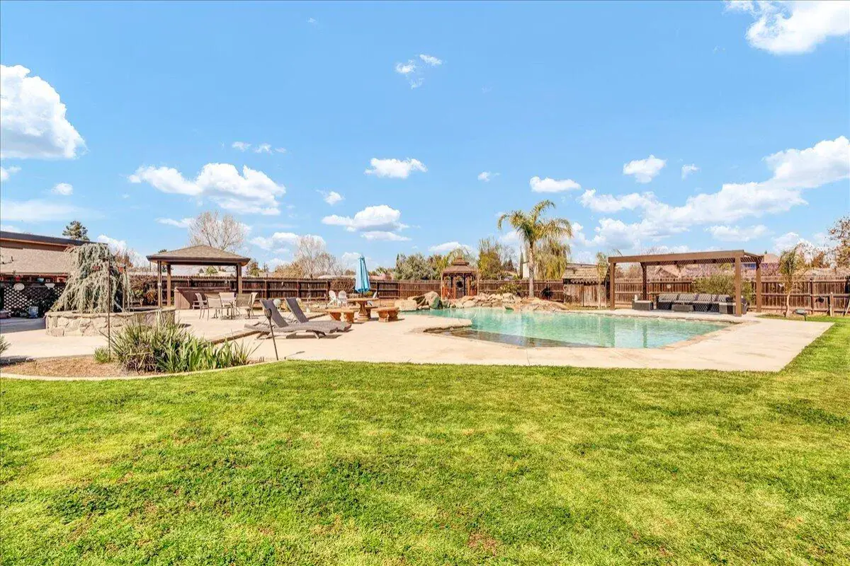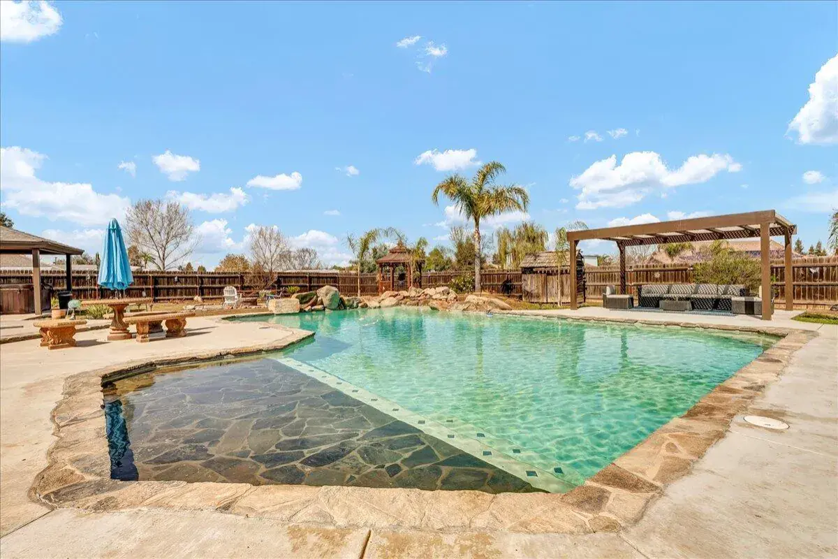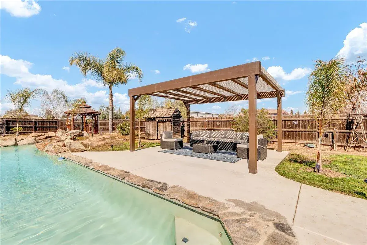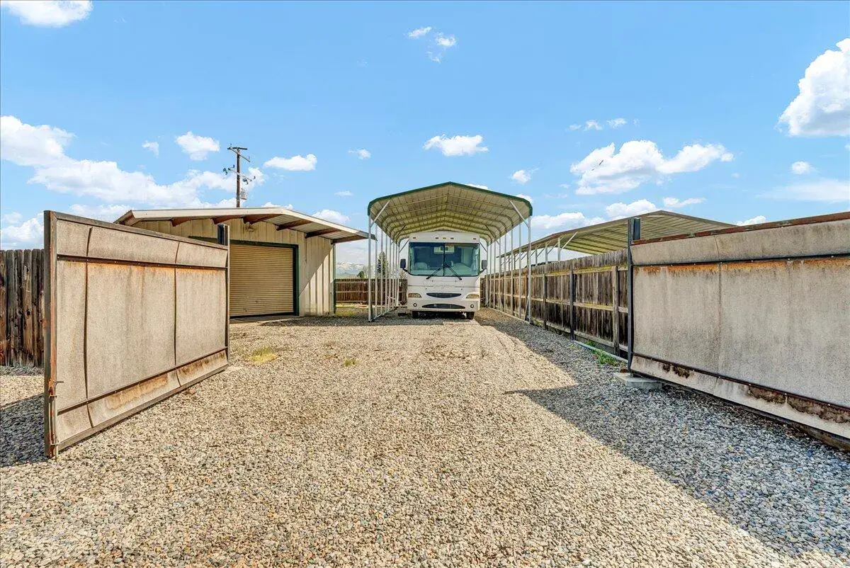 The backyard offers plenty of room for relaxation and outdoor living with a large pool, a tranquil water feature, and a soothing spa—ideal for cooling off and unwinding after a long day. You’ll also find a large 24′ x 32′ shop with two roll-up doors, perfect for storing equipment or working on projects, plus a massive 18′ x 36′ RV cover to keep your motor home protected.
