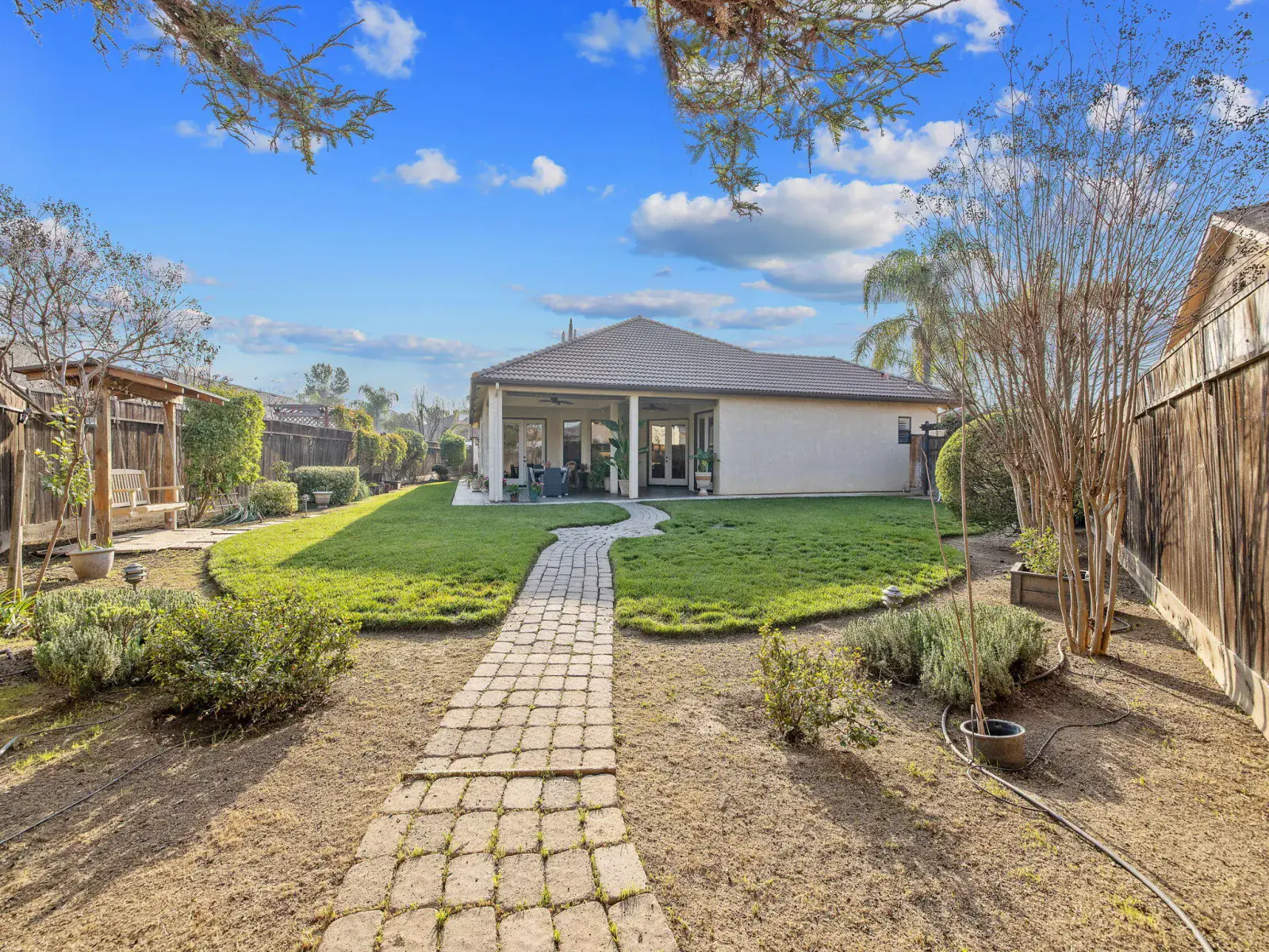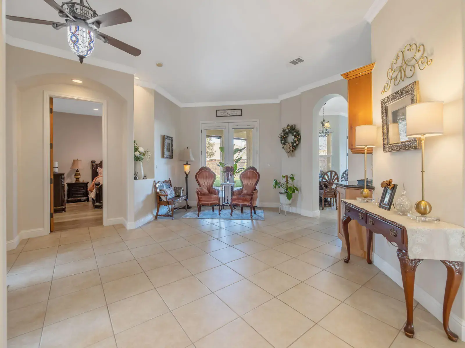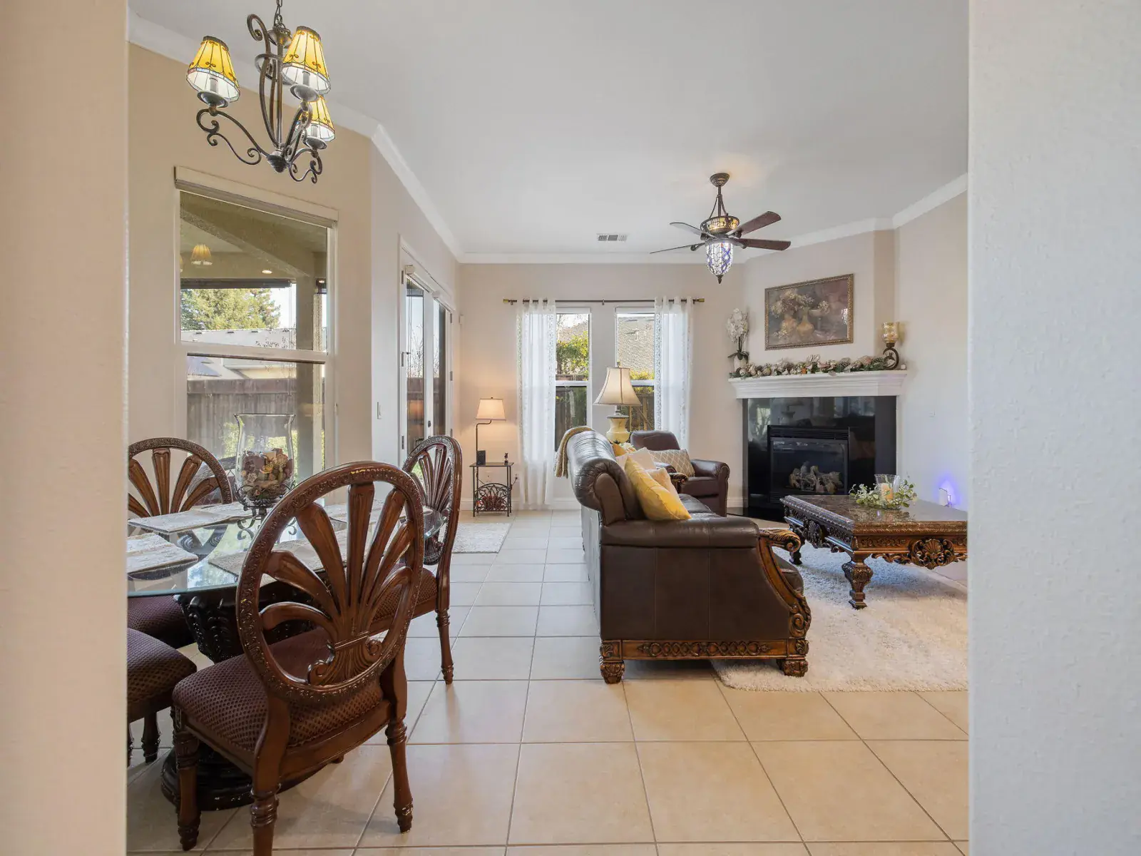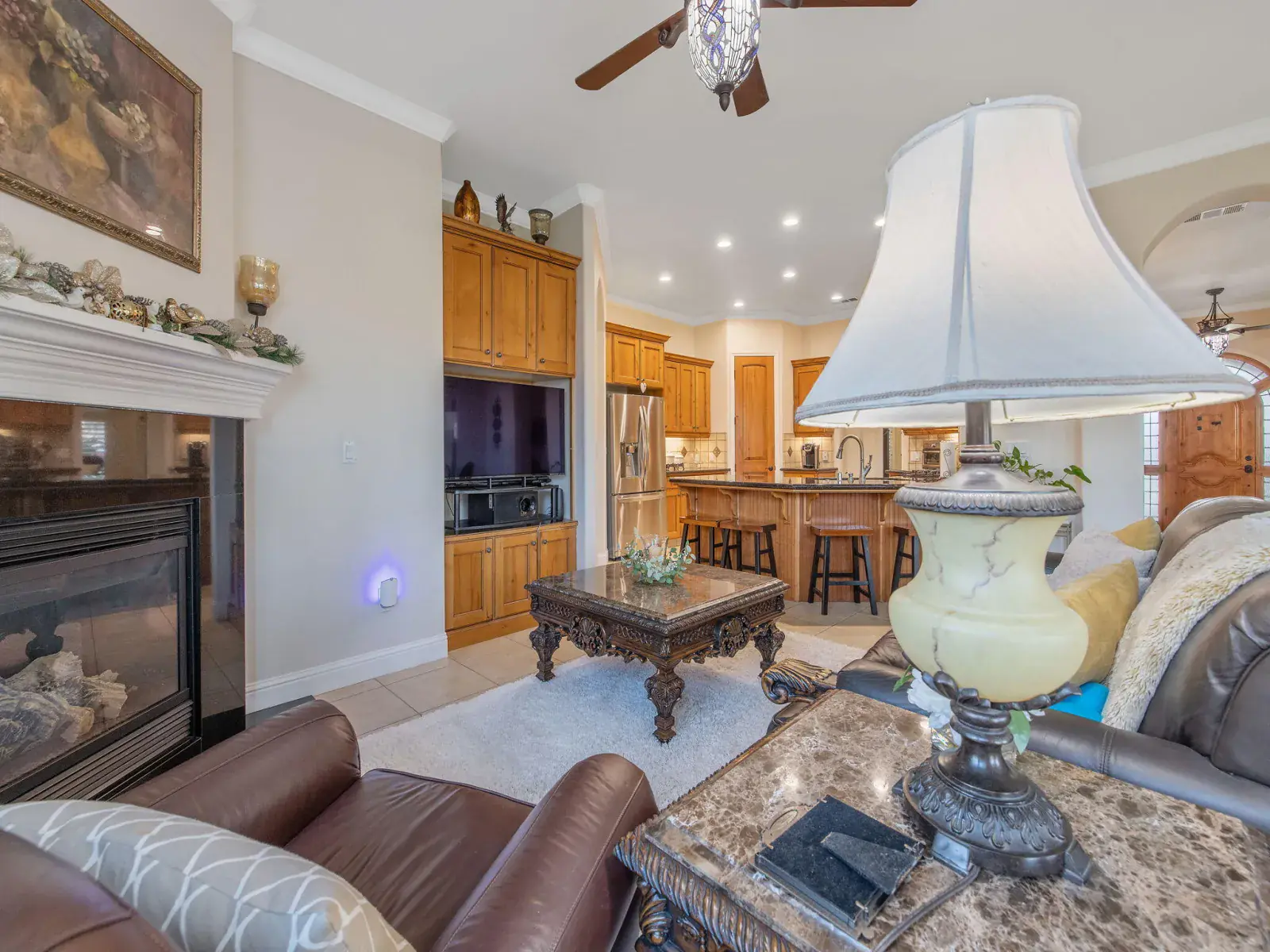 Elegant 4-bedroom, 3-bath residence showcasing refined upgrades and exceptional indoor-outdoor living, located in a sought-after, friendly neighborhood. This beautifully updated home features a recently painted interior, newer laminate and tile flooring, custom shutters, crown molding, and screen shades on every window for both style and comfort. The gourmet kitchen is designed for entertaining and offers custom cabinetry, gas cooking, LED recessed lighting, under-cabinet lighting, and a wet bar. The living area is highlighted by a gas fireplace with custom mantle and French doors that open to the outdoor living space. Step outside to a private backyard retreat featuring a covered patio with slate tile, screen shades, paver walkways, extensive concrete, outdoor lighting, and automatic sprinklers. Additional exterior amenities include a tile roof, gutters, shed, custom front door, and charming swing accents. This home also offers a spacious laundry room, newer water heater, water softener, Ecobee smart thermostat, and a rare pass-through 3-car garage with exceptional functionality. A thoughtfully designed home offering comfort, sophistication, and timeless appeal.
