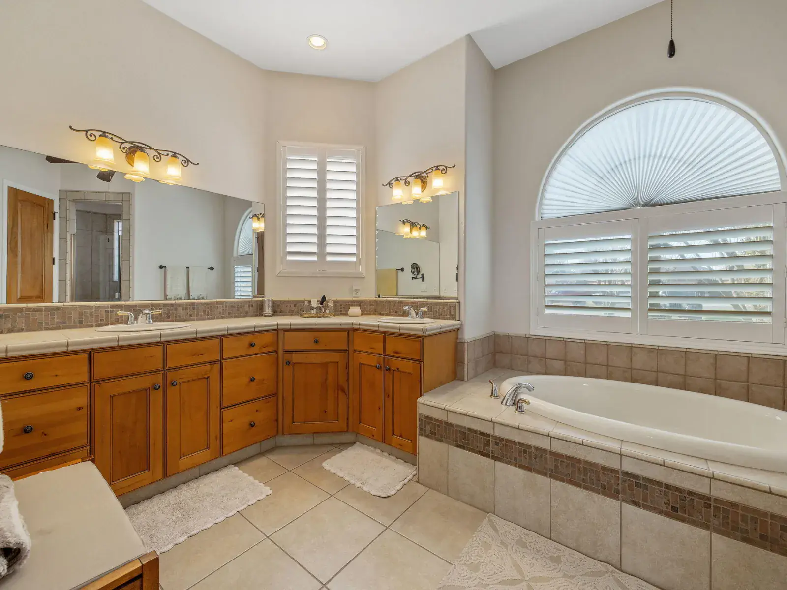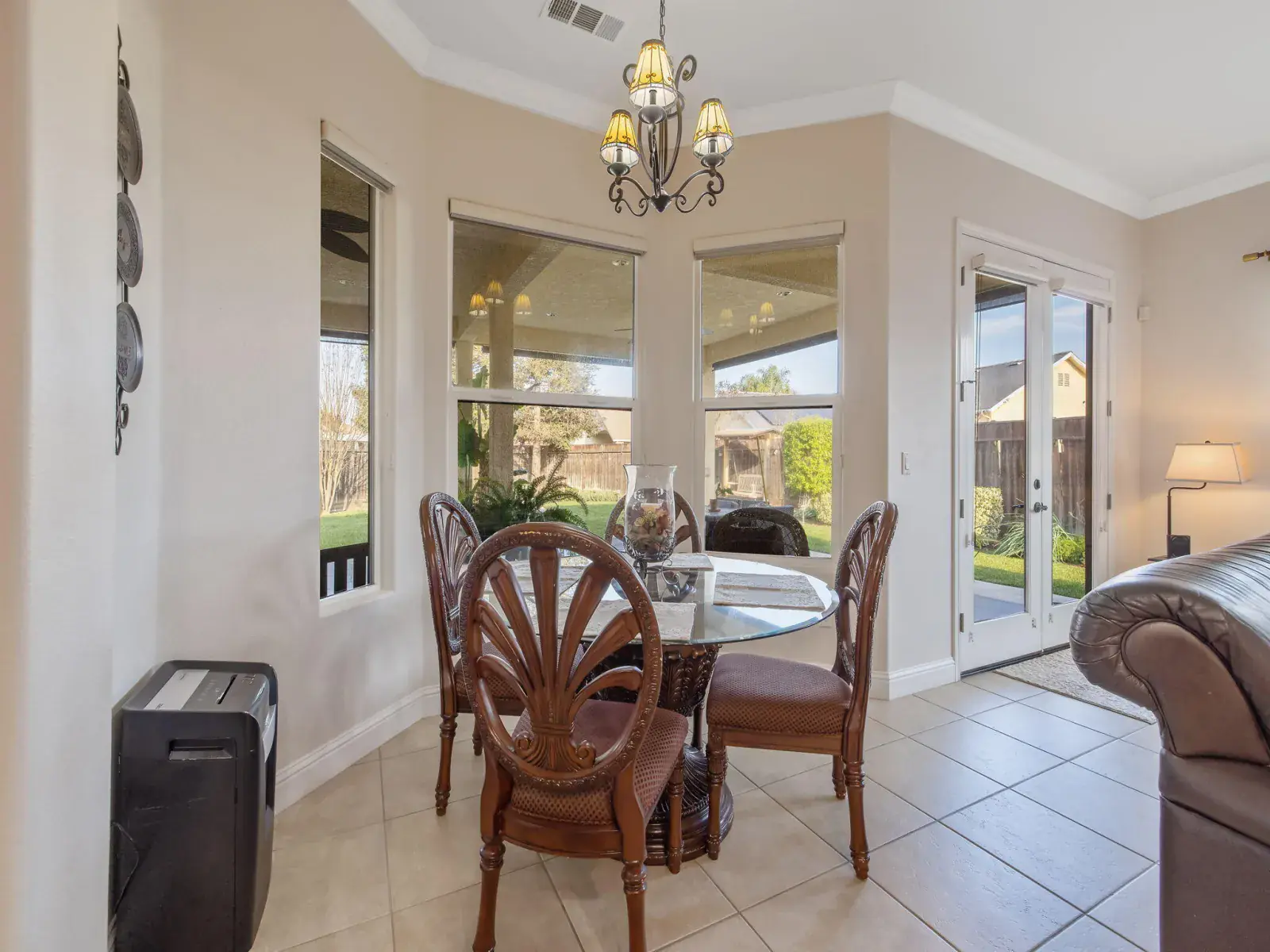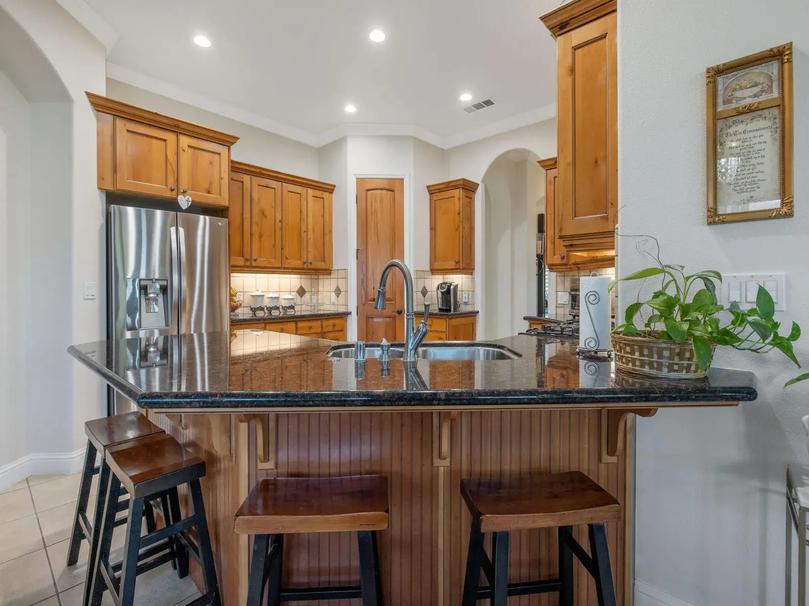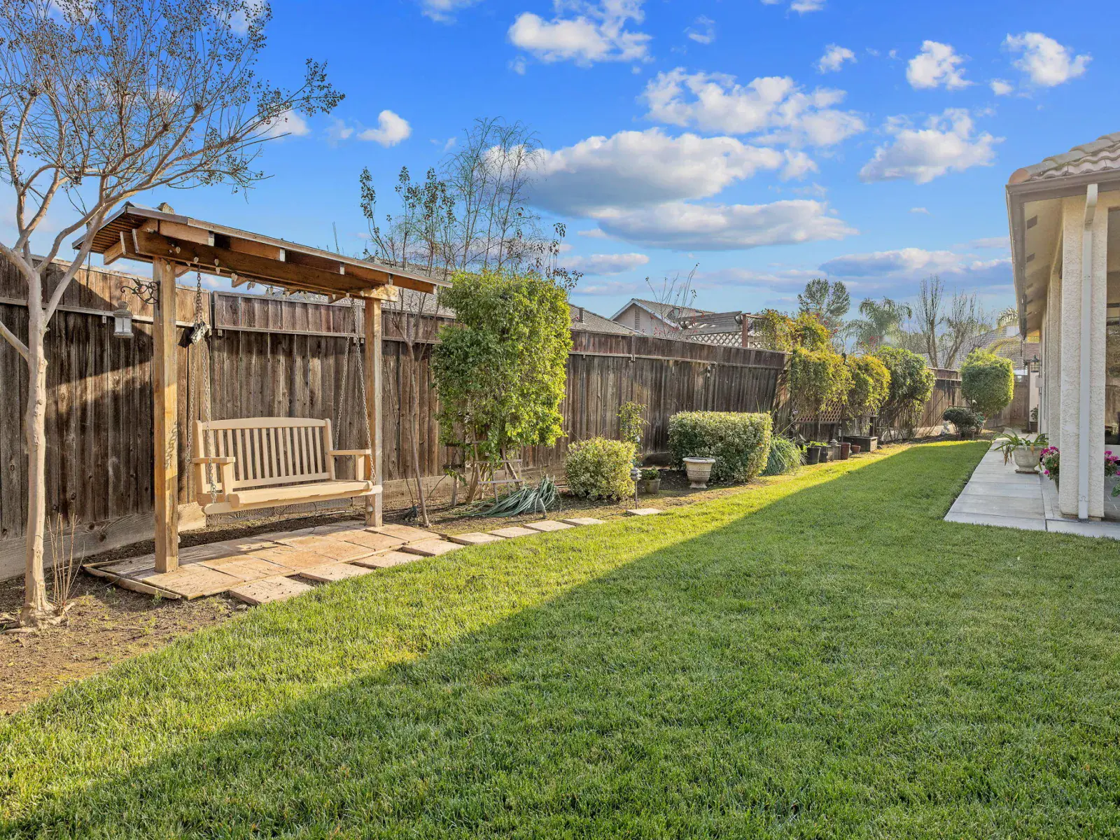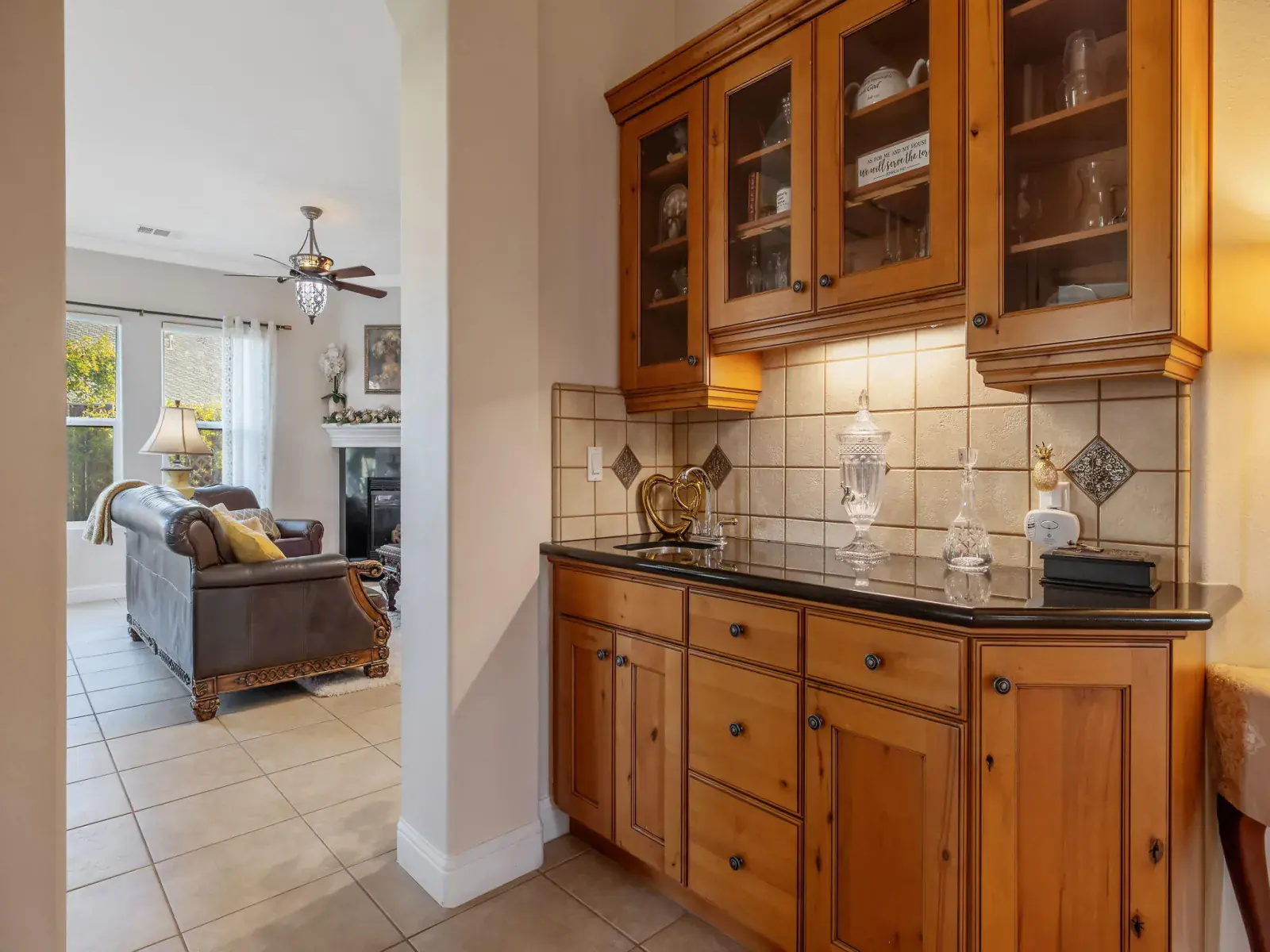 Elegant 4-bedroom, 3-bath residence showcasing refined upgrades and exceptional indoor-outdoor living, located in a sought-after, friendly neighborhood. This beautifully updated home features a recently painted interior, newer laminate and tile flooring, custom shutters, crown molding, and screen shades on every window for both style and comfort. The gourmet kitchen is designed for entertaining and offers custom cabinetry, gas cooking, LED recessed lighting, under-cabinet lighting, and a wet bar. The living area is highlighted by a gas fireplace with custom mantle and French doors that open to the outdoor living space. Step outside to a private backyard retreat featuring a covered patio with slate tile, screen shades, paver walkways, extensive concrete, outdoor lighting, and automatic sprinklers. Additional exterior amenities include a tile roof, gutters, shed, custom front door, and charming swing accents. This home also offers a spacious laundry room, newer water heater, water softener, Ecobee smart thermostat, and a rare pass-through 3-car garage with exceptional functionality. A thoughtfully designed home offering comfort, sophistication, and timeless appeal.